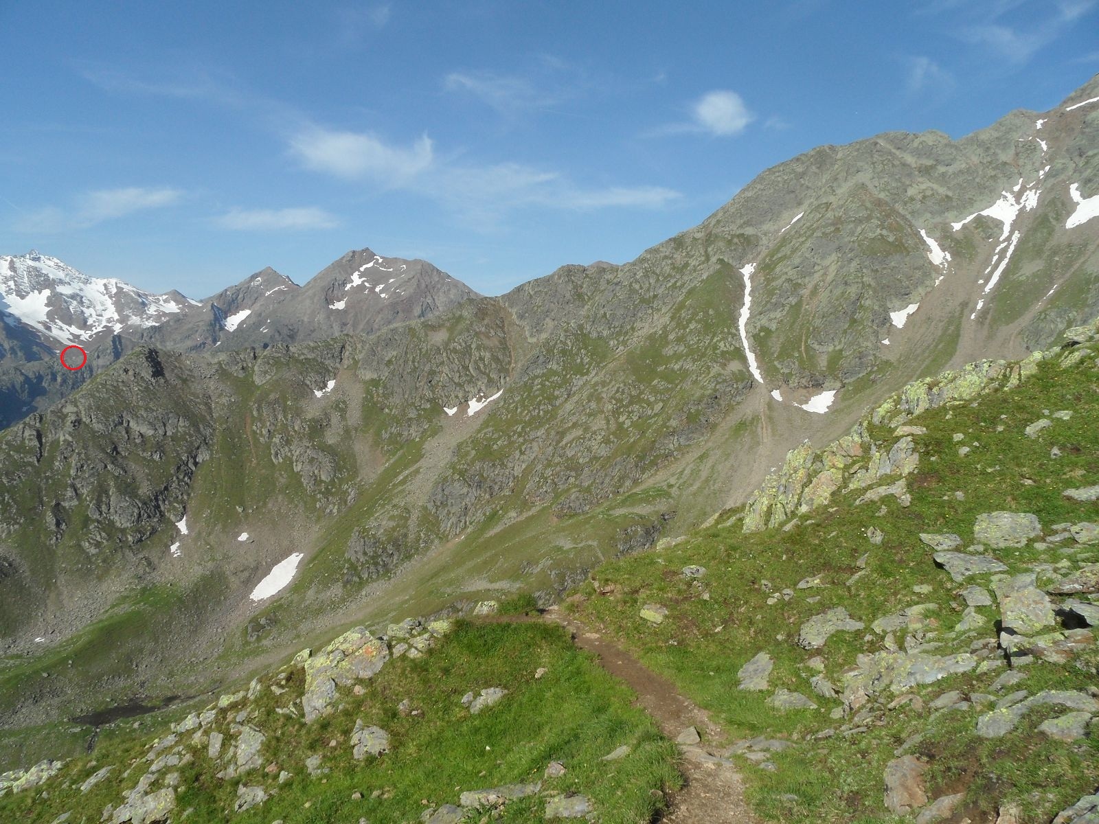 Innsbrucker Hütte - Bremer Hütte: Abstieg bis fast zu dem See unten links, dann Aufstieg bis zur Pramanspitze. Im roten Kreis ist unser Ziel zu erkennen