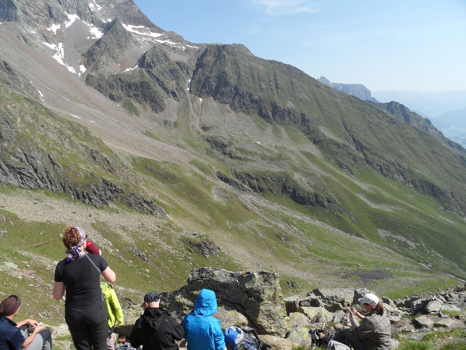 Innsbrucker Hütte - Bremer Hütte: allgemeine Pause unserer Mitstreiter an der Pramanspitze und Blick zurück