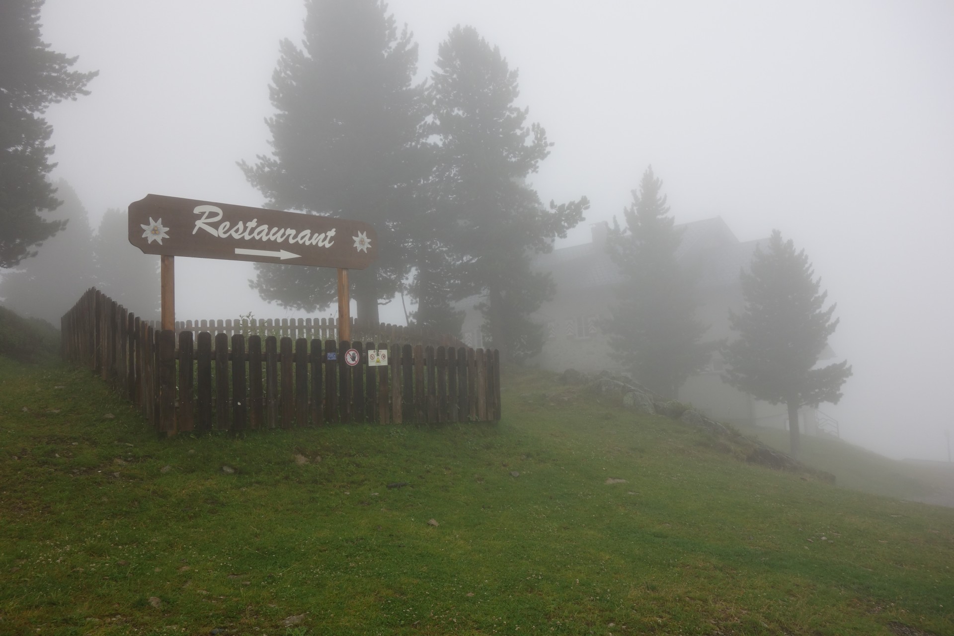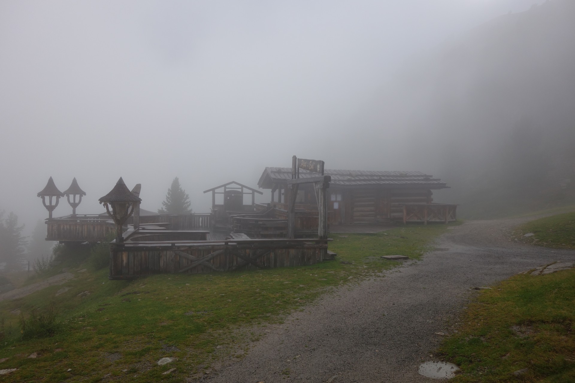 Neue Bielefelder Hütte - Achplatte - Lauser - Niederreichscharte - Hochreichscharte - Hochreichkopf - Schweinfurter Hütte: Vor der Hütte empfängt uns ein dichter grauer Schleier