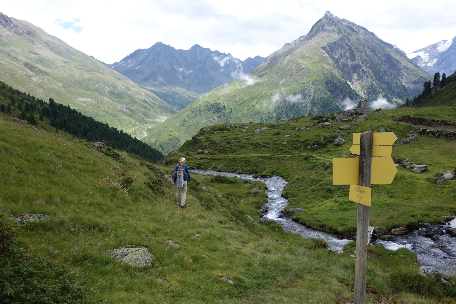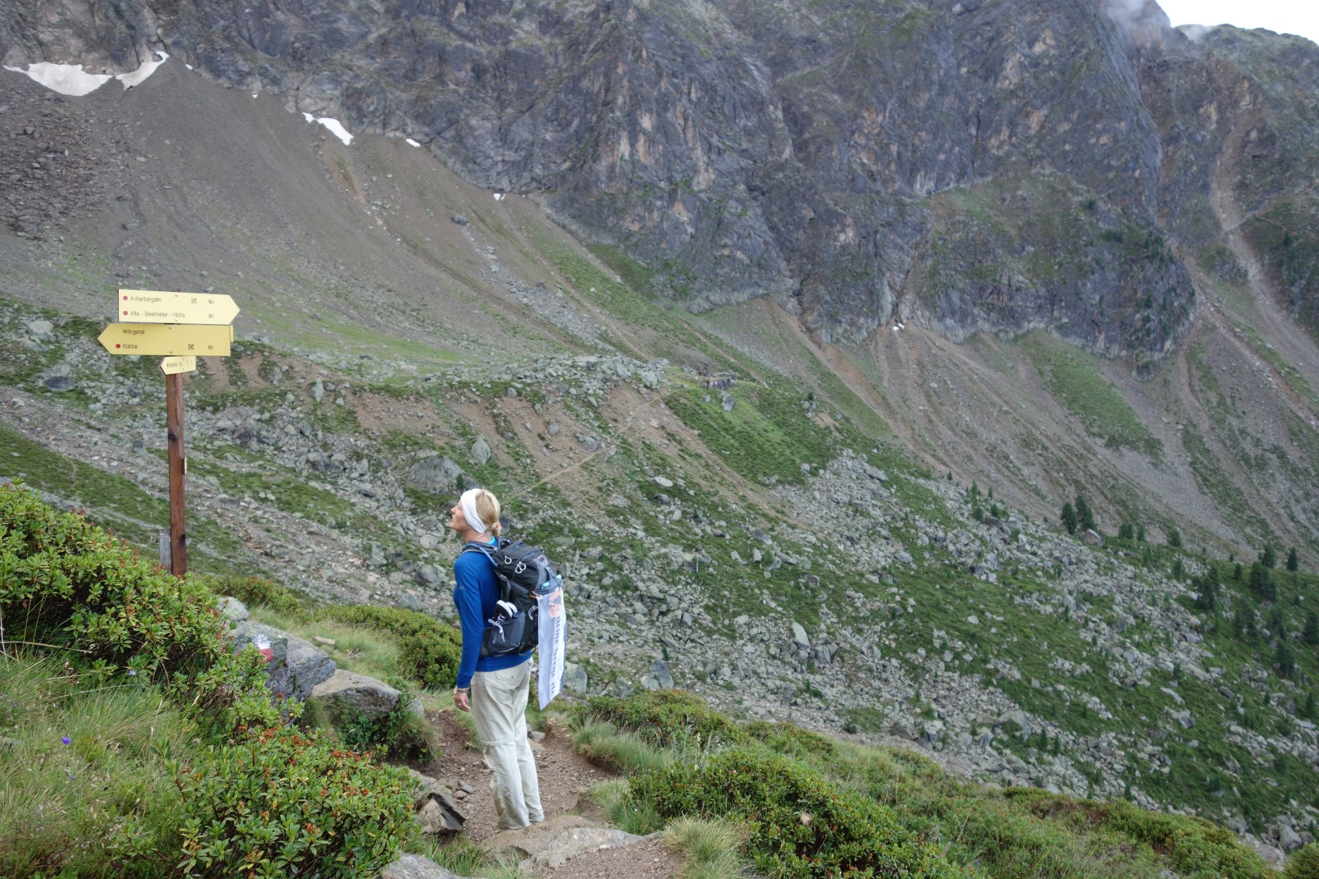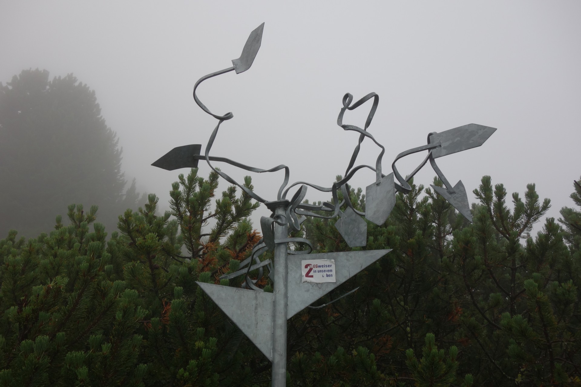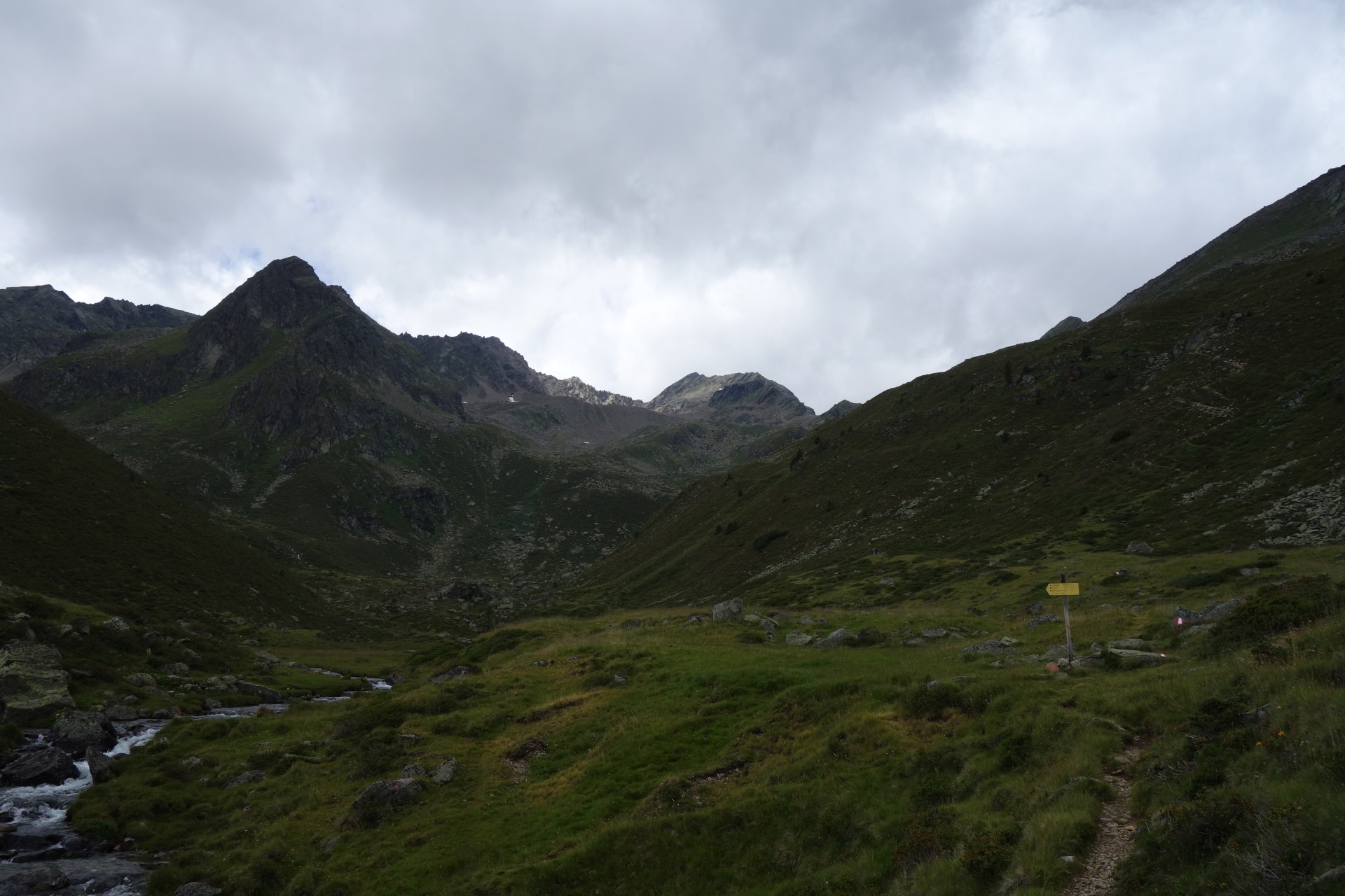Neue Bielefelder Hütte - Achplatte - Lauser - Niederreichscharte - Hochreichscharte - Hochreichkopf - Schweinfurter Hütte: Der Wegweiser in der Finstertalalm zeigt uns den Pfad