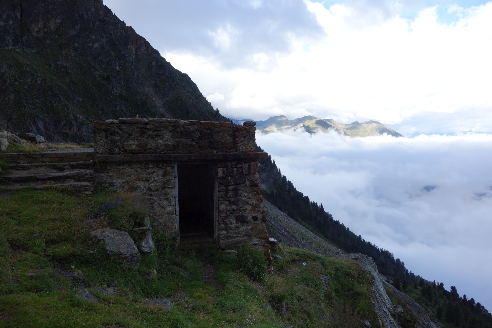 Neue Bielefelder Hütte - Achplatte - Lauser - Niederreichscharte - Hochreichscharte - Hochreichkopf - Schweinfurter Hütte: Nur der untere Teil des Gebäudes ist noch stehen geblieben