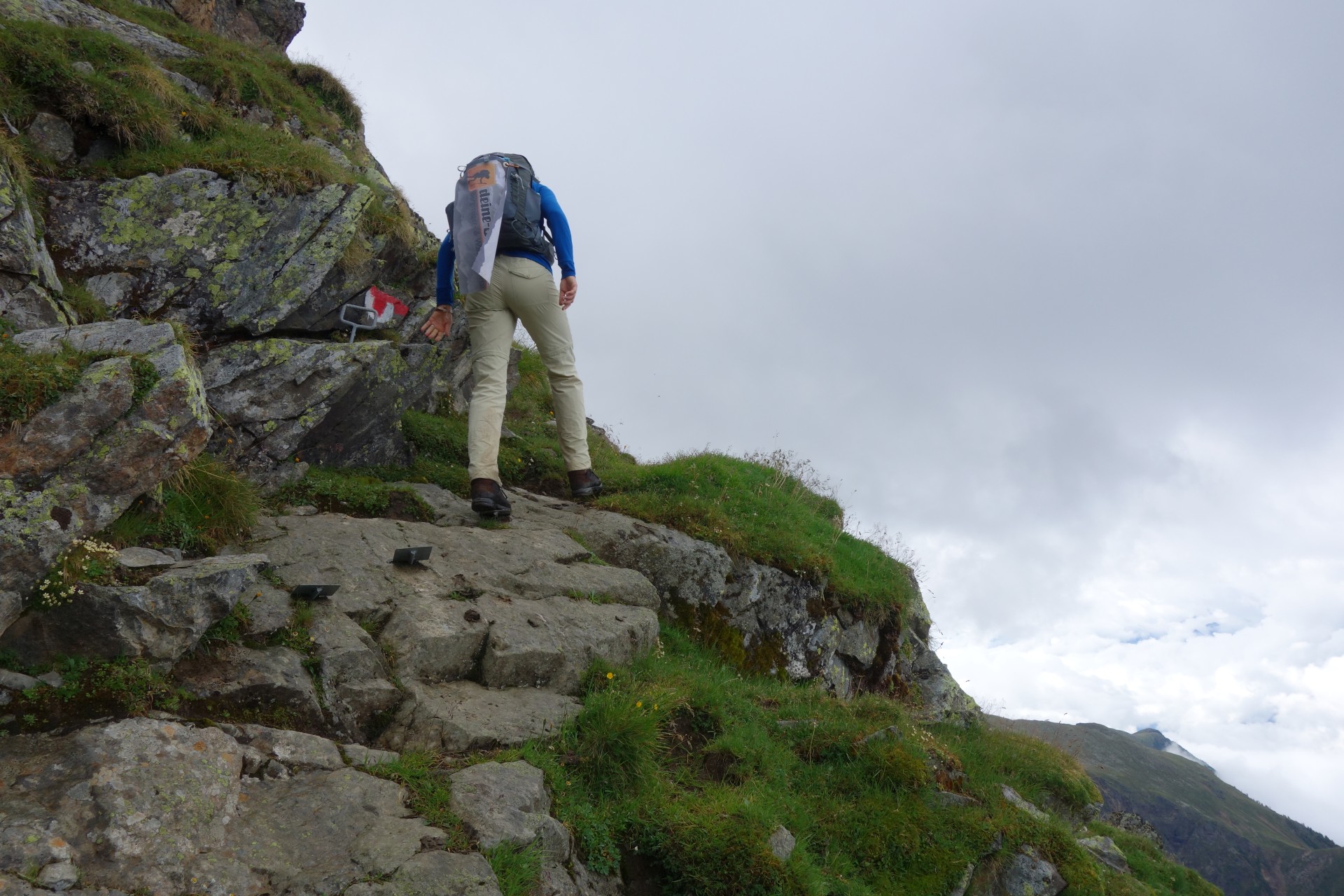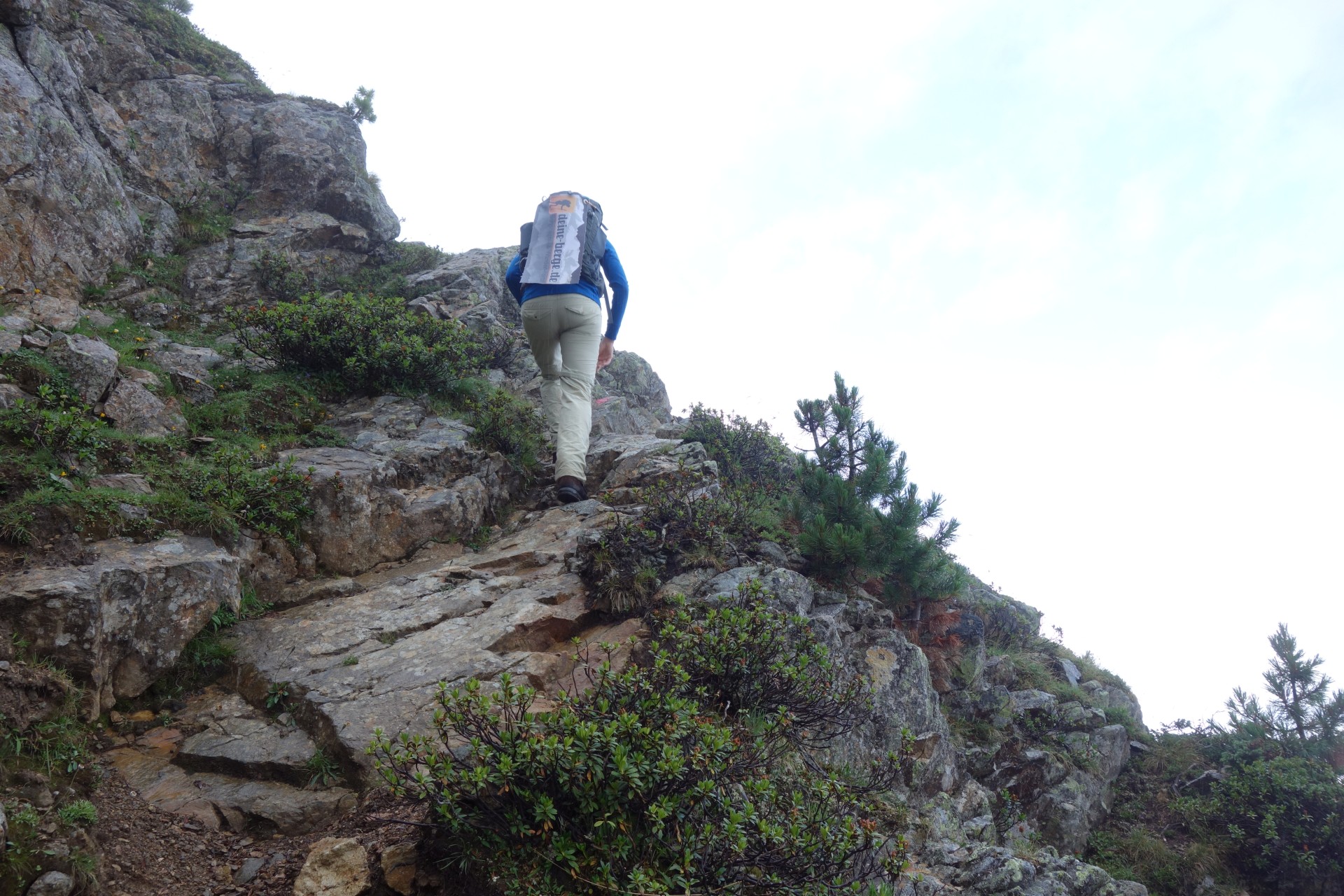 Neue Bielefelder Hütte - Achplatte - Lauser - Niederreichscharte - Hochreichscharte - Hochreichkopf - Schweinfurter Hütte: An den plattigen Felsen muss man auch mal die Hände zur Hilfe nehmen
