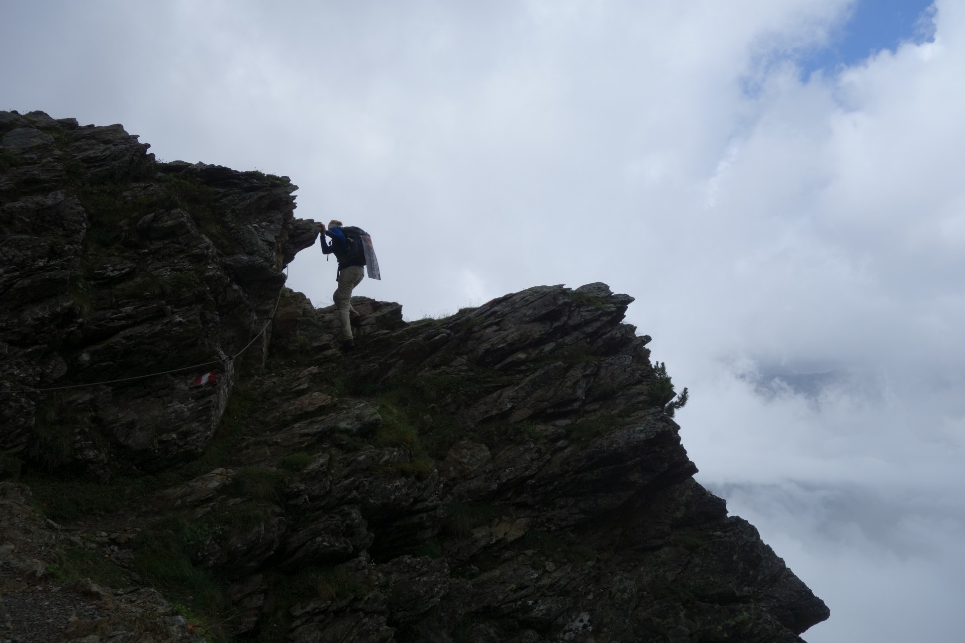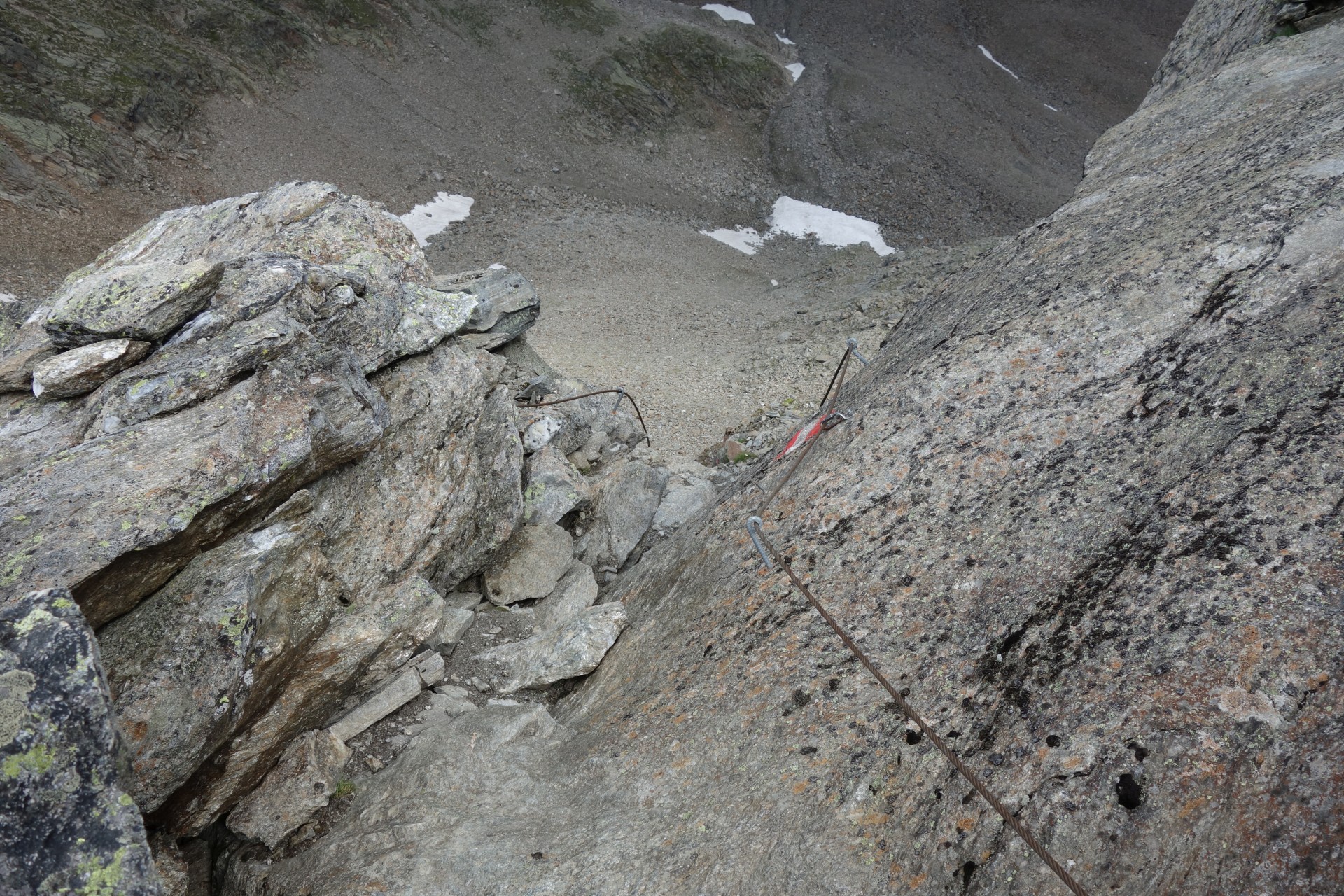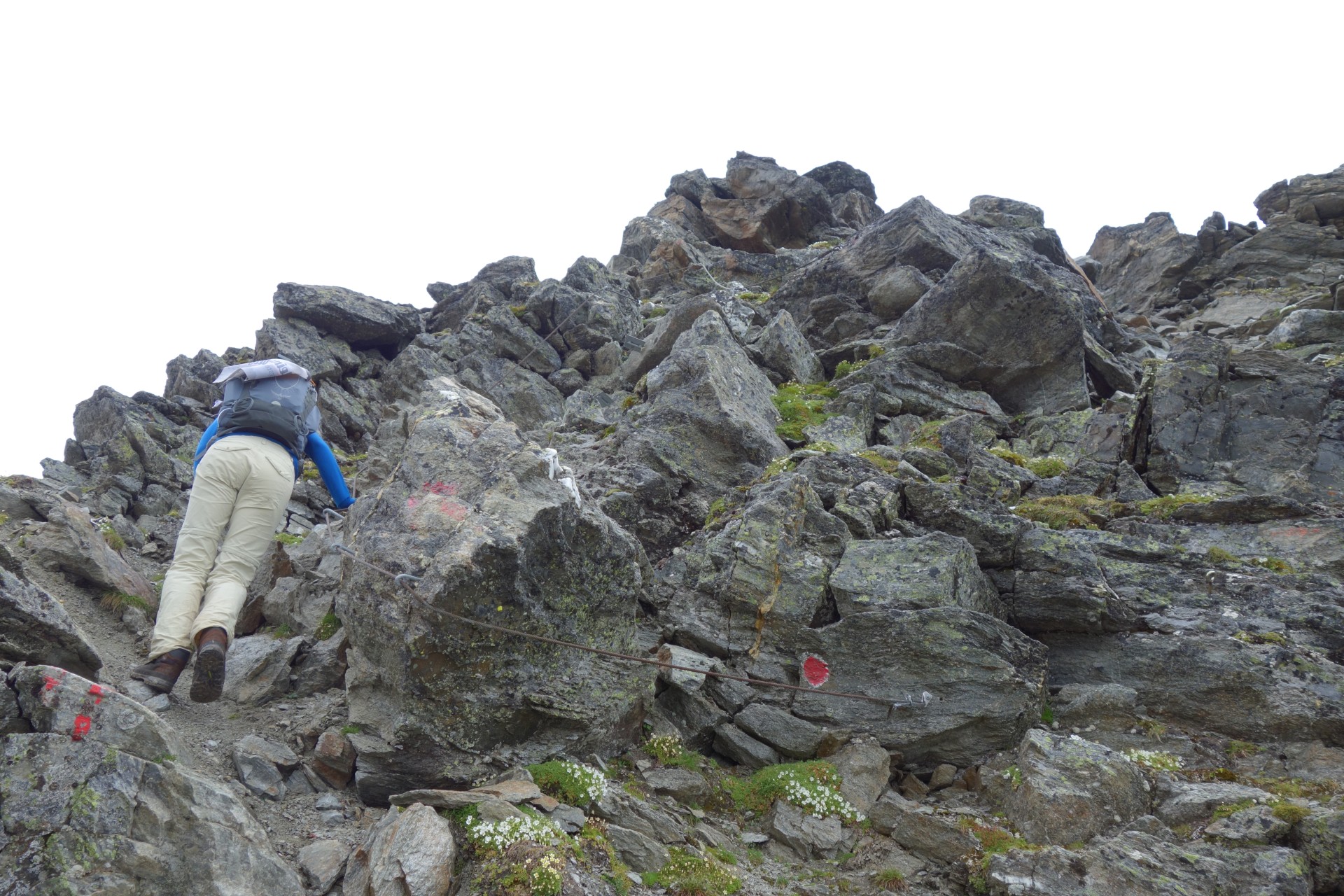 Neue Bielefelder Hütte - Achplatte - Lauser - Niederreichscharte - Hochreichscharte - Hochreichkopf - Schweinfurter Hütte: Wir orientieren uns an dem Stahlseil da der Weg sehr rutschig ist