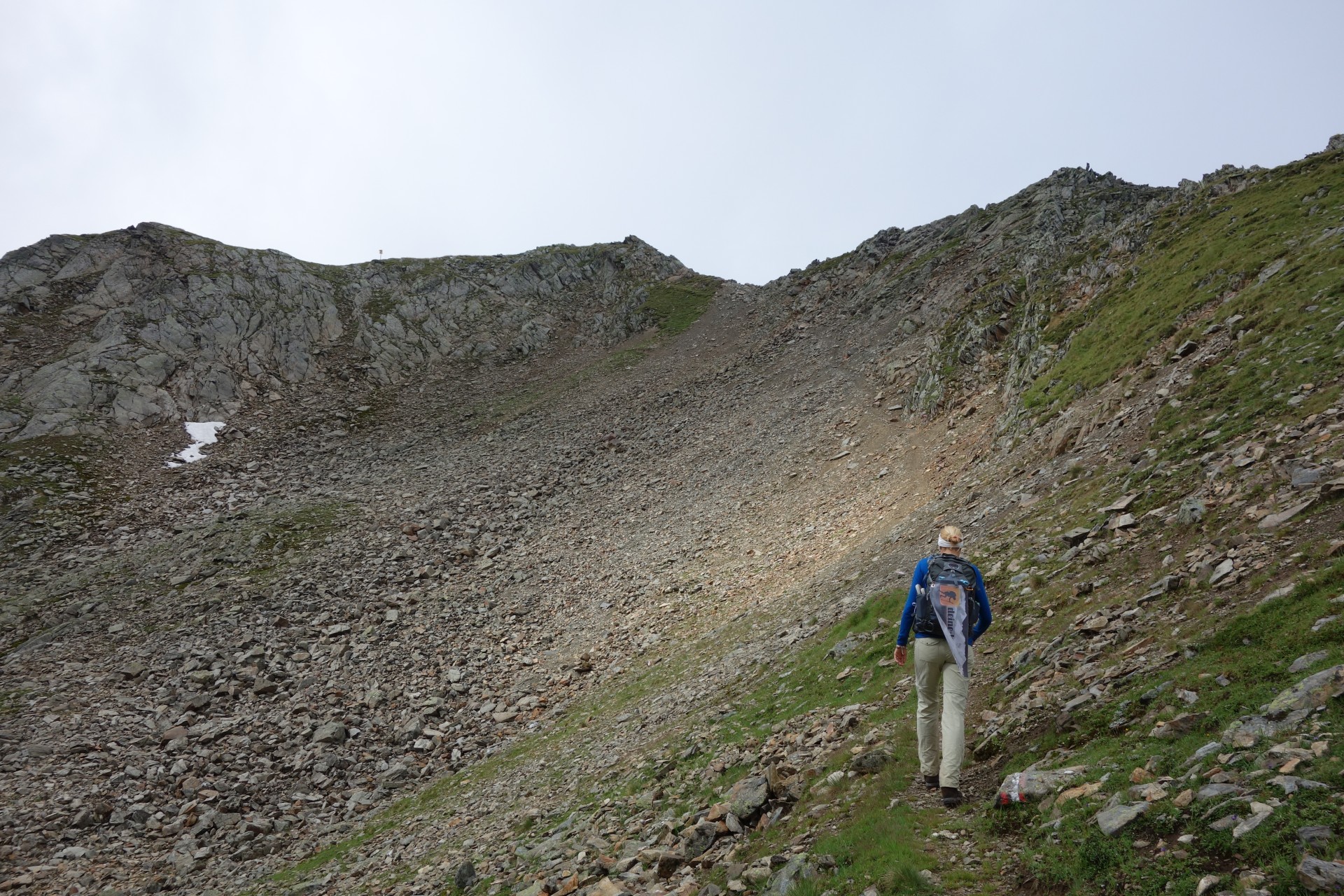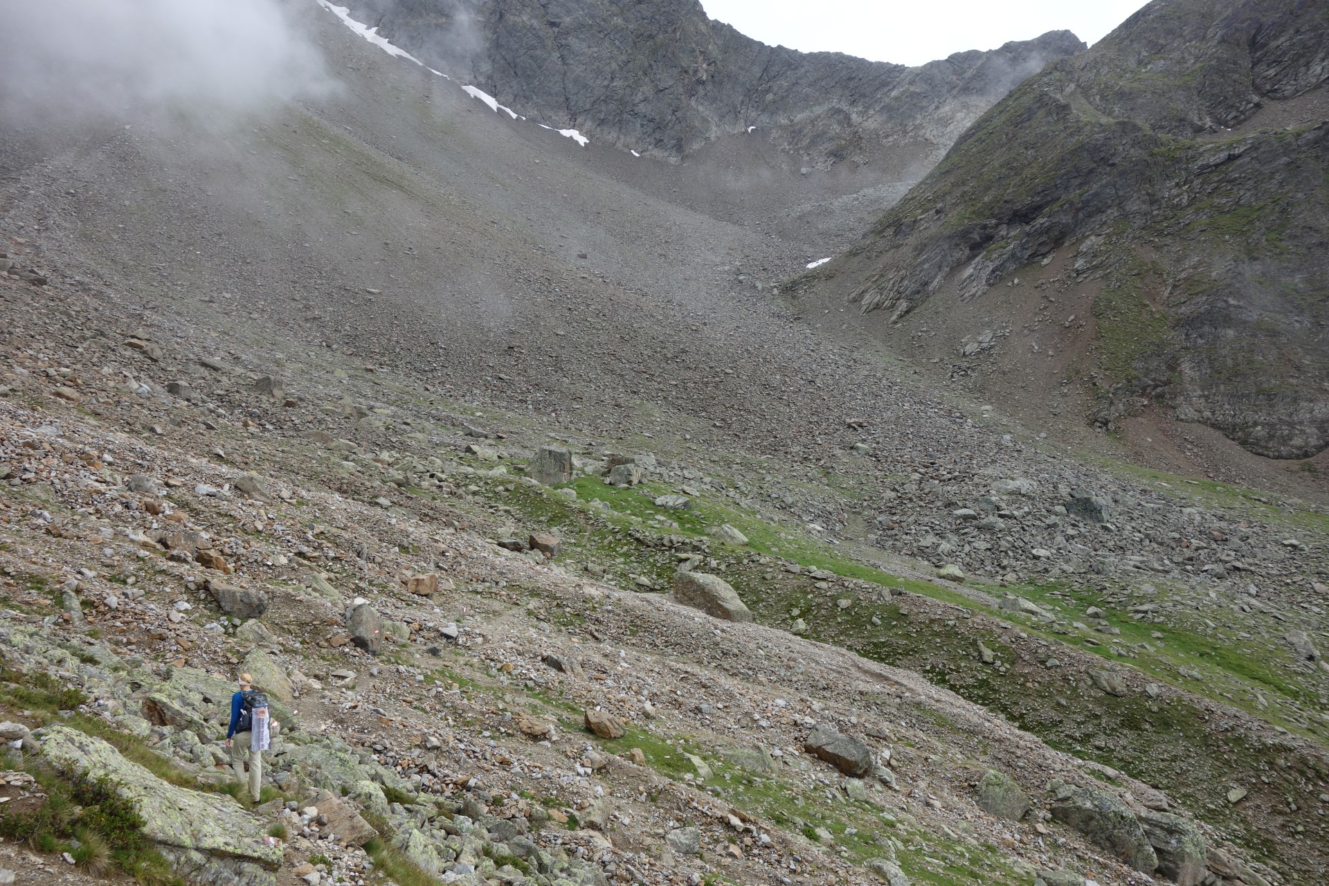 Neue Bielefelder Hütte - Achplatte - Lauser - Niederreichscharte - Hochreichscharte - Hochreichkopf - Schweinfurter Hütte: Als wir über den Grasrücken absteigen sehen wir einen großen Teil des weiteren Weges