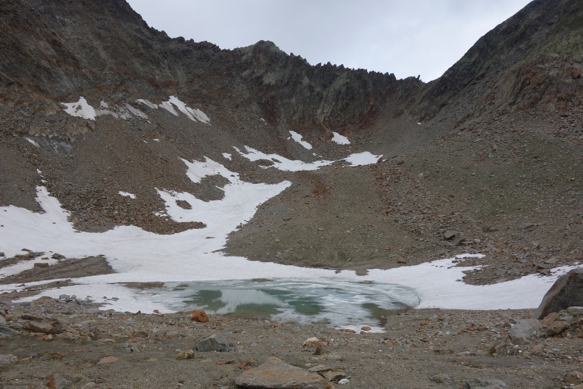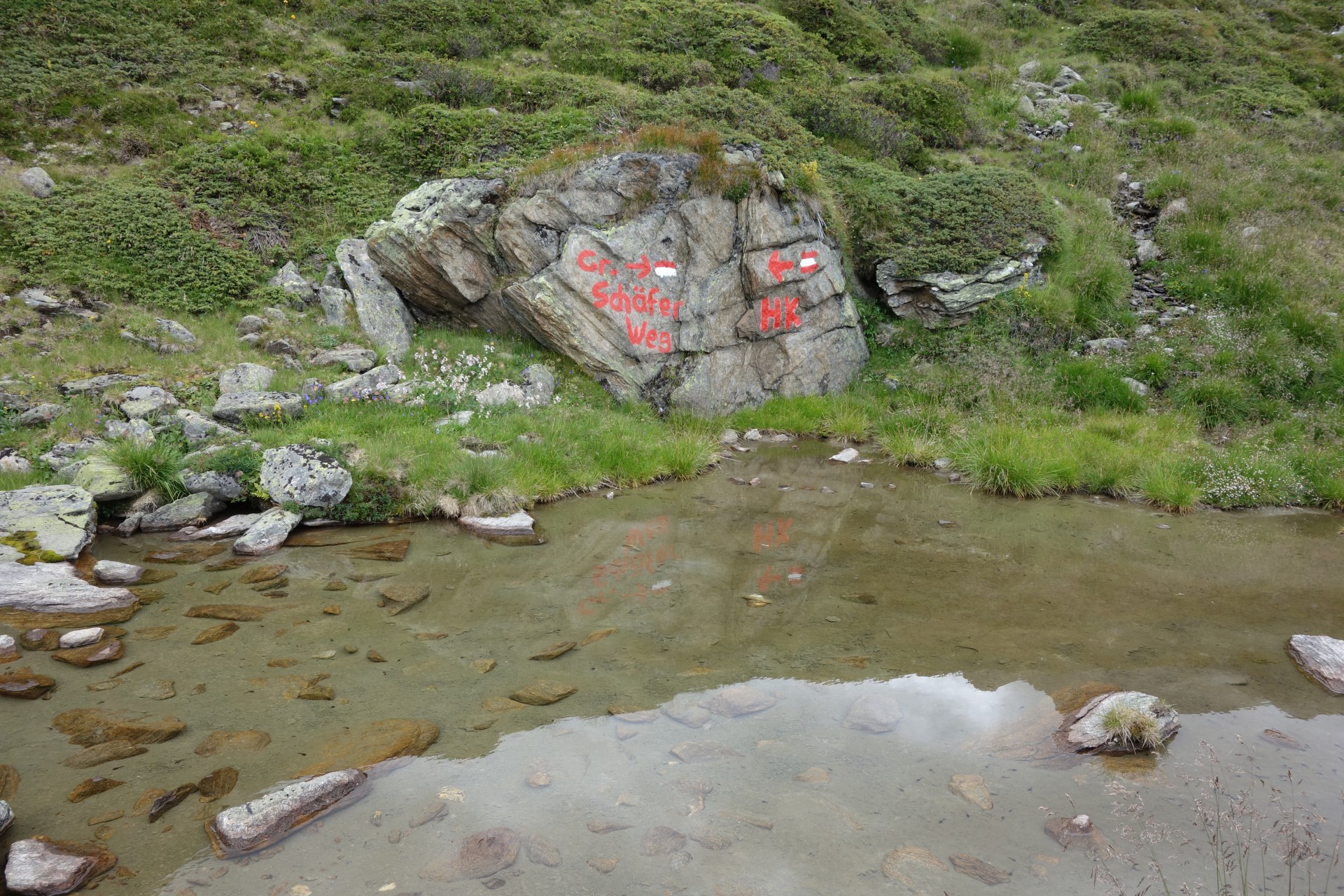 Neue Bielefelder Hütte - Achplatte - Lauser - Niederreichscharte - Hochreichscharte - Hochreichkopf - Schweinfurter Hütte: An einem Teich wird uns der Weg gewiesen