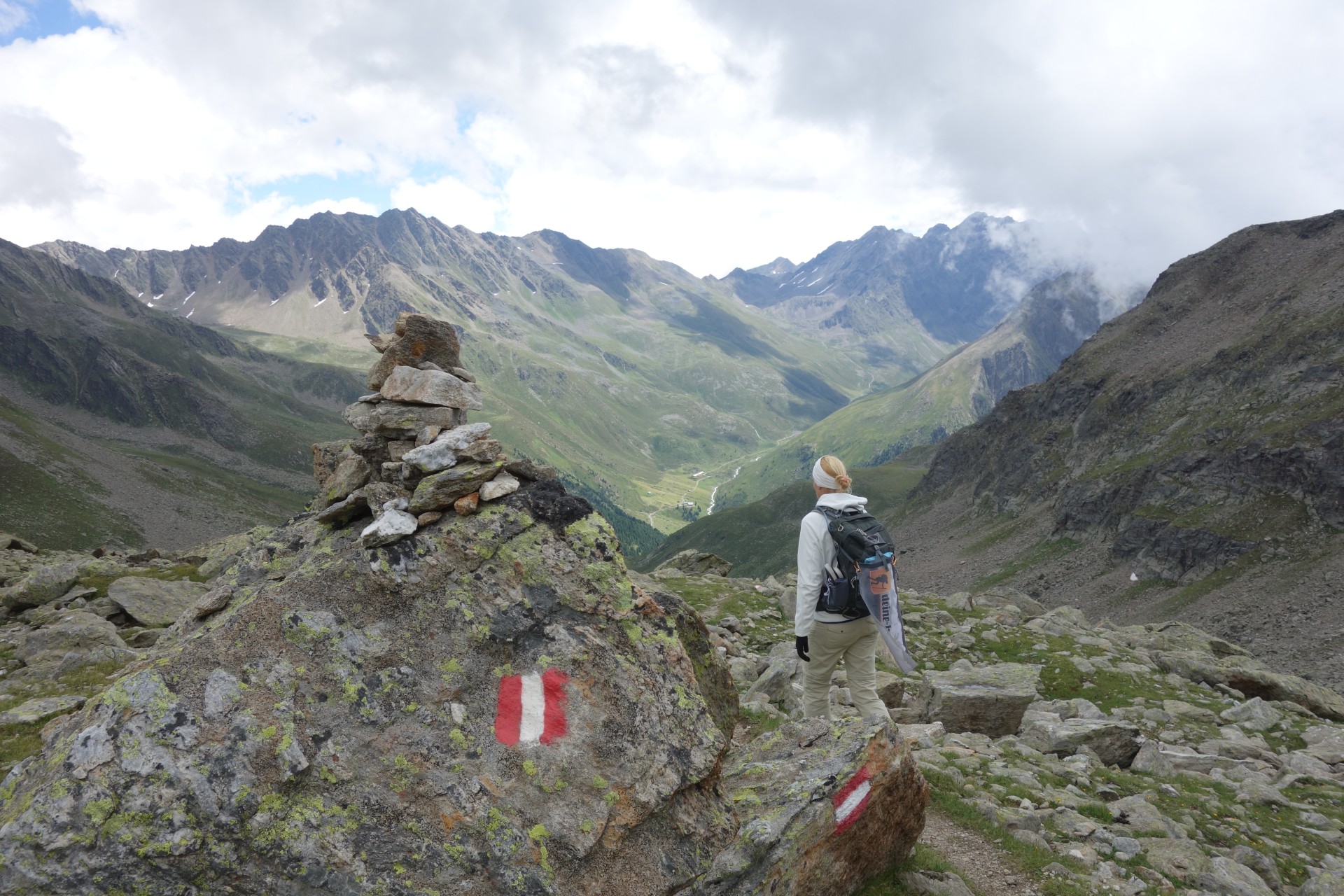 Neue Bielefelder Hütte - Achplatte - Lauser - Niederreichscharte - Hochreichscharte - Hochreichkopf - Schweinfurter Hütte: Vorbei an einem Steinmann auf einem großen Stein