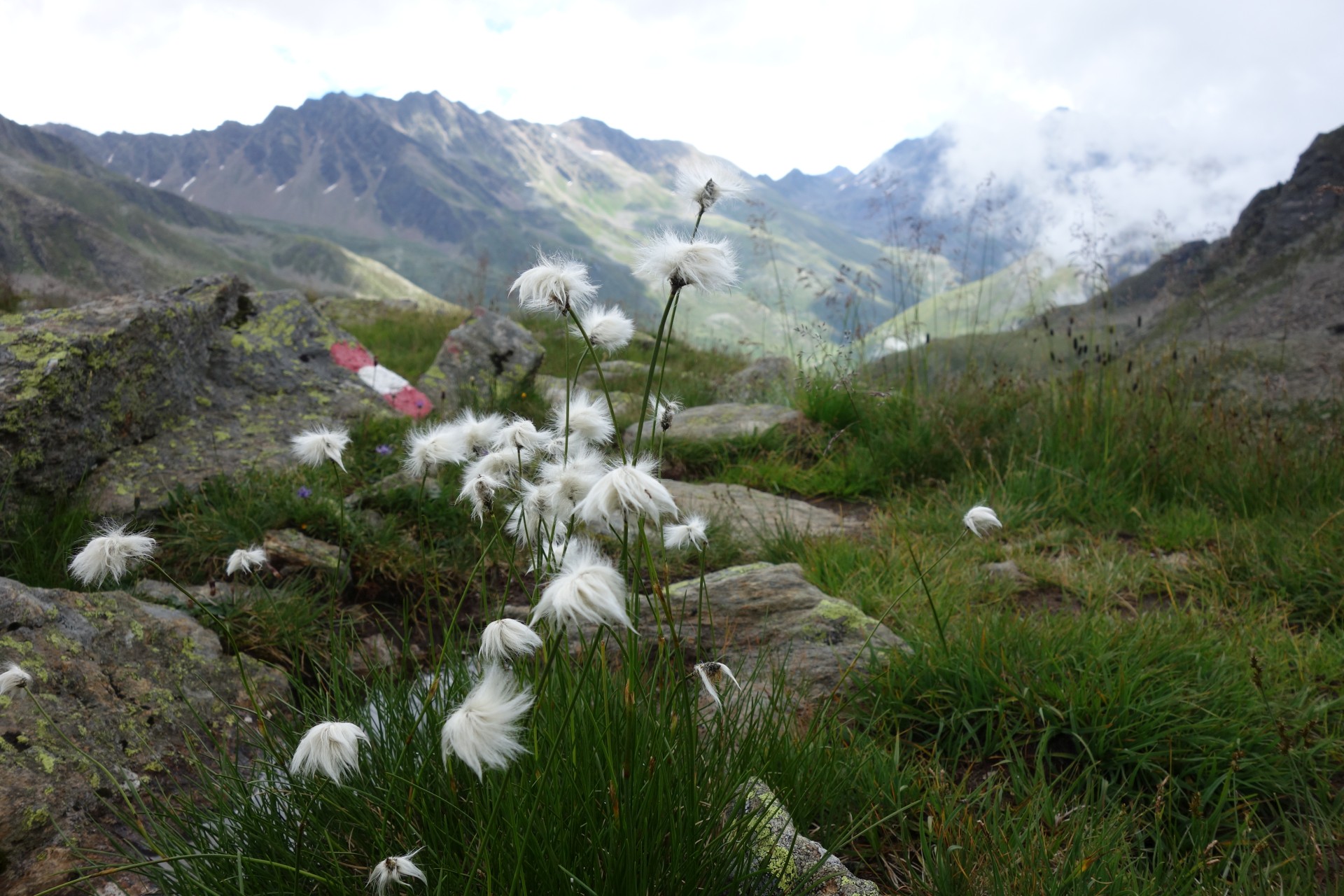 Neue Bielefelder Hütte - Achplatte - Lauser - Niederreichscharte - Hochreichscharte - Hochreichkopf - Schweinfurter Hütte: Am Weg stehen an einem Tümpel einige Wollgräser