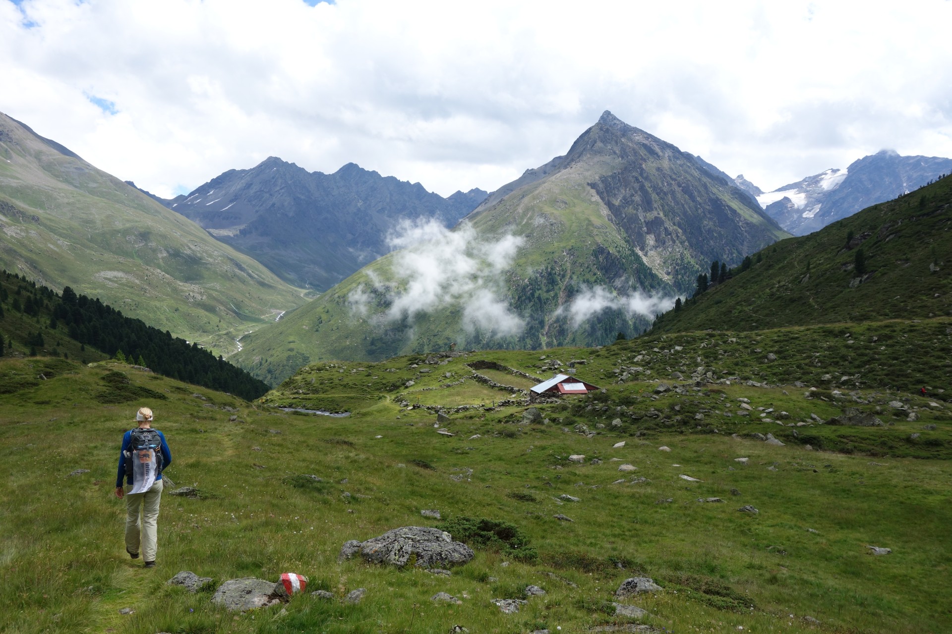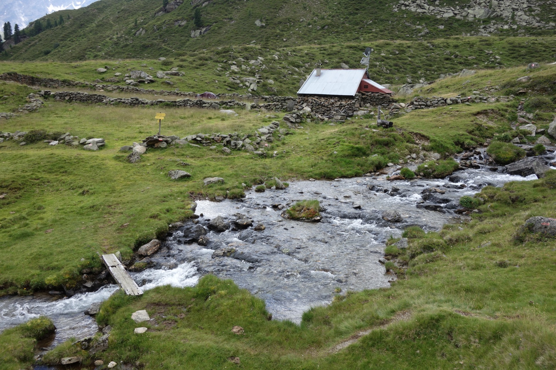 Neue Bielefelder Hütte - Achplatte - Lauser - Niederreichscharte - Hochreichscharte - Hochreichkopf - Schweinfurter Hütte: Unter uns eine Senke mit der Finstertaler Sennhütte