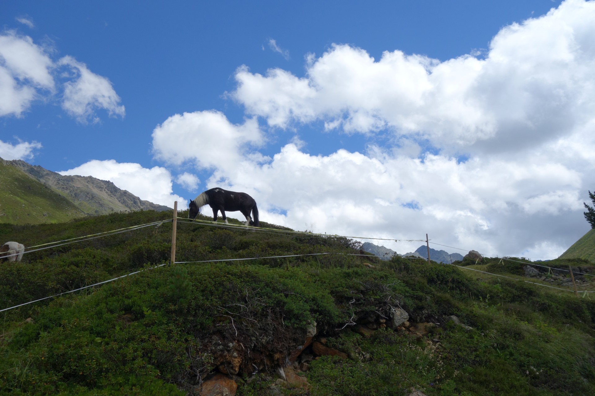 Neue Bielefelder Hütte - Achplatte - Lauser - Niederreichscharte - Hochreichscharte - Hochreichkopf - Schweinfurter Hütte: Ein Pferd genießt das leckere frische Grün