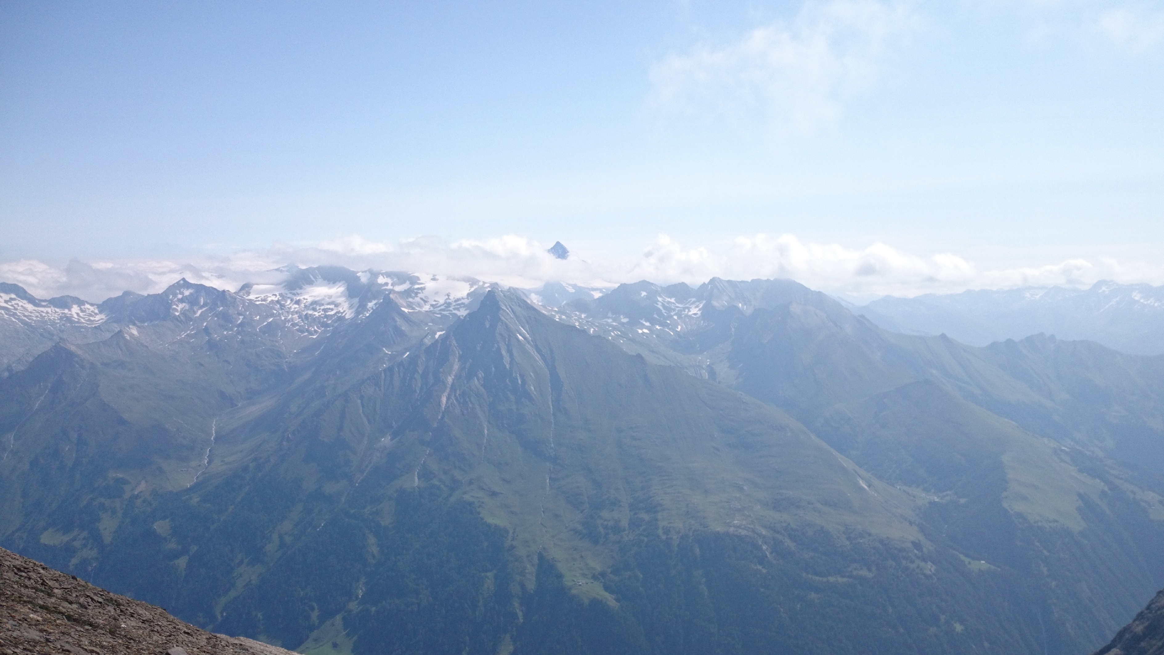 Am Gipfel des Ochsenbugs selbst eine grandiose Aussicht auf den Großvenediger, den Großglockner und bei guter Fernsicht auch den Antelao in den Dolomiten einerseits und Hochfeiler nebst Weißzint in den Zillertalern andererseits.