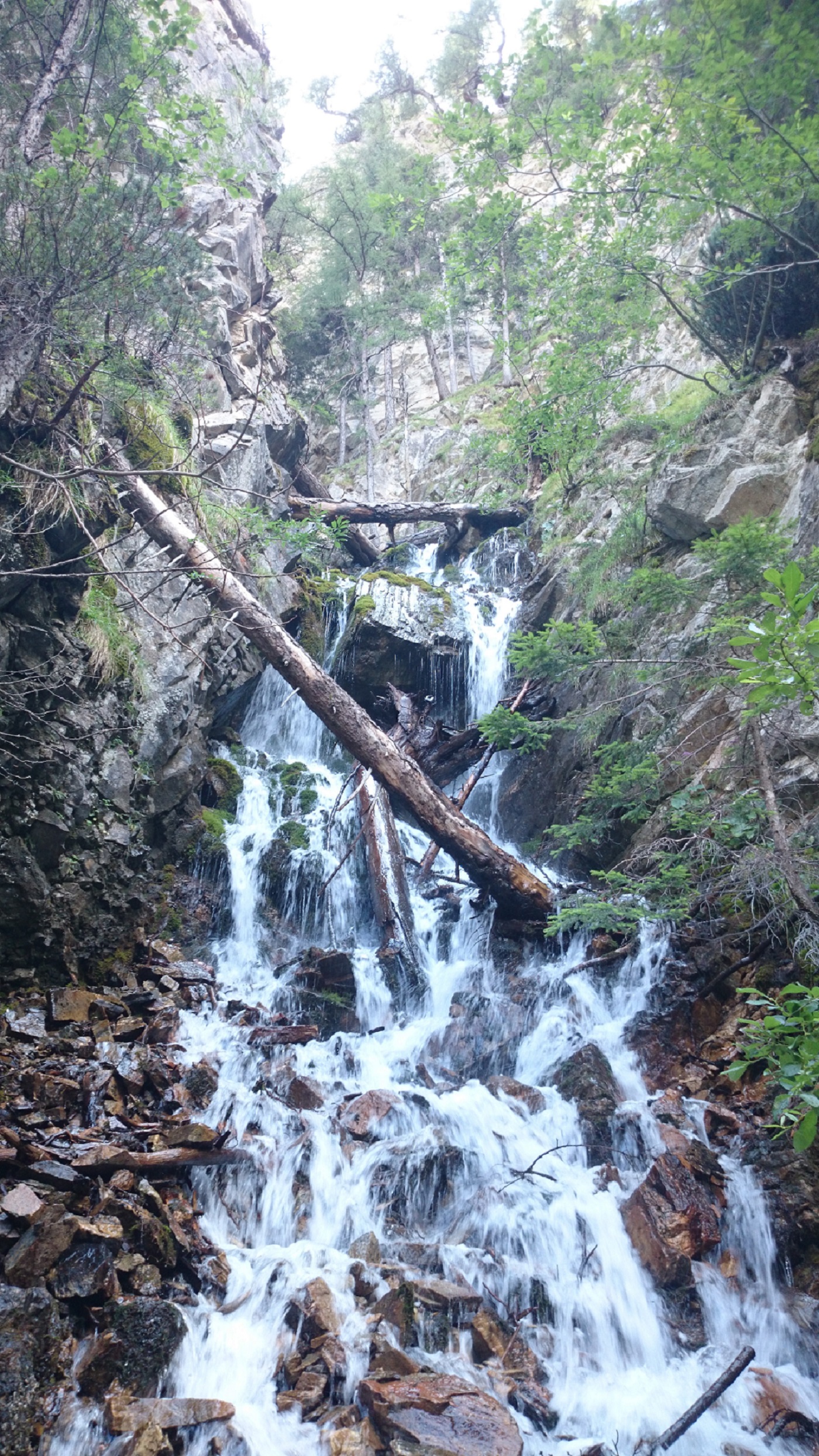 Erst wenn man aus dieser Rinne heraus ist, am Weg zum Nunitzköpfel, bekommt man auch hier Almen und Gipfel (Felber Tauern) sowie den imposanten Steiner Wasserfall (Oberer und Unterer haben zusammen eine Fallhöhe von gut 260m) zu sehen...