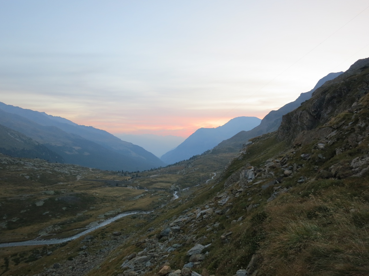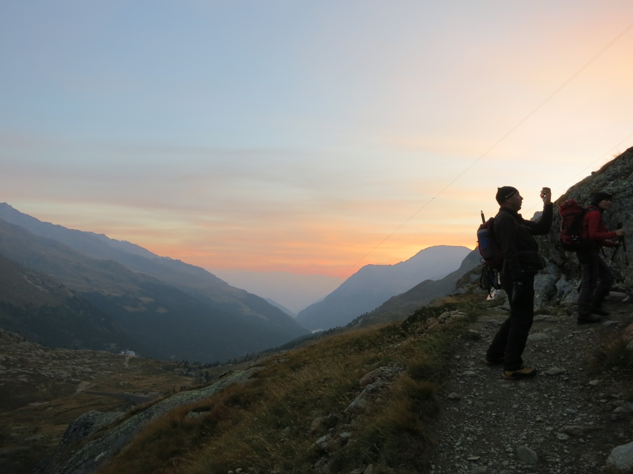 Überschreitung Cima Marmotta und Veneziaspitzen: An der Trockenmauer reicht das Licht langsam zum Gehen ohne Lampe aus