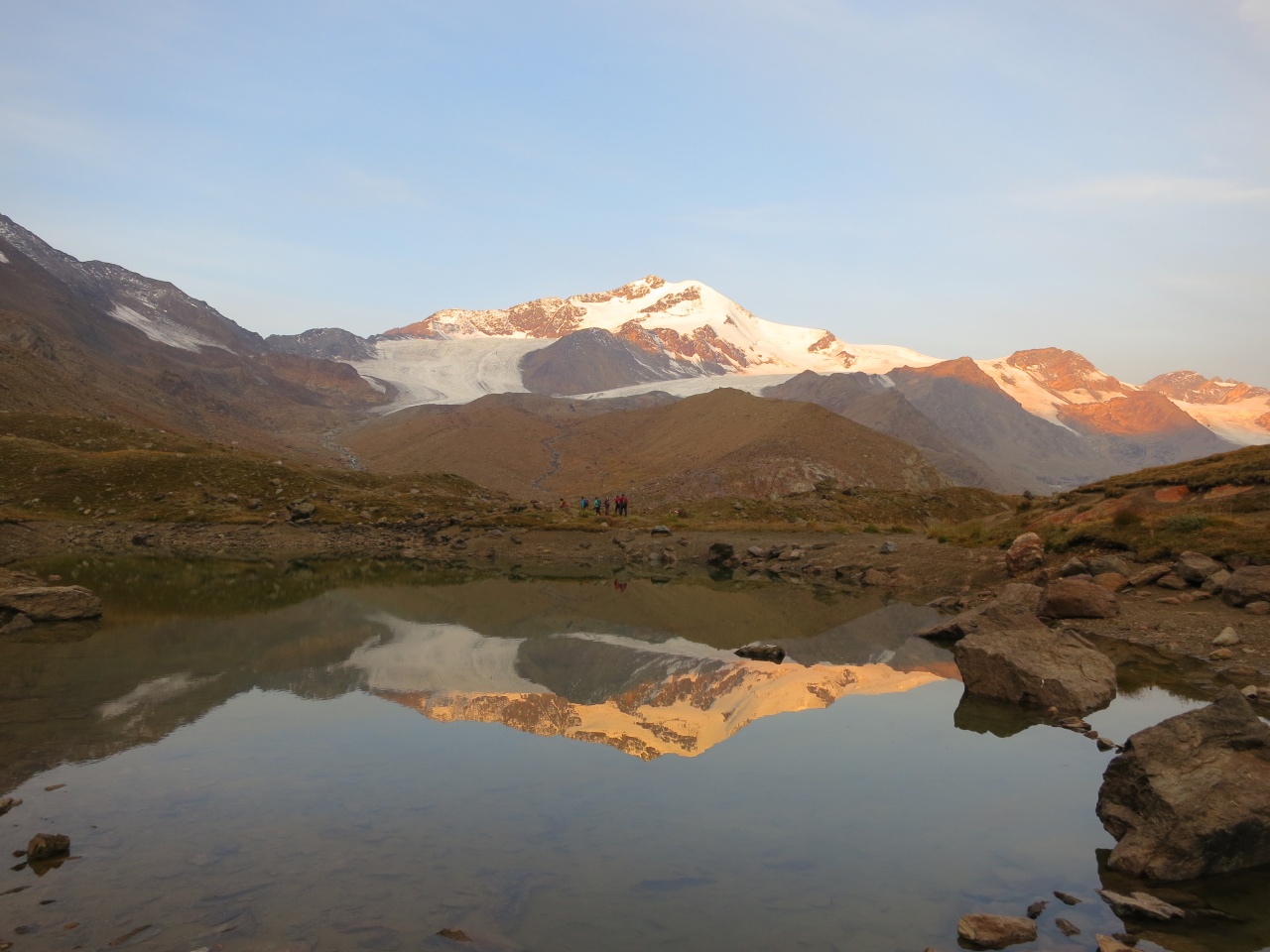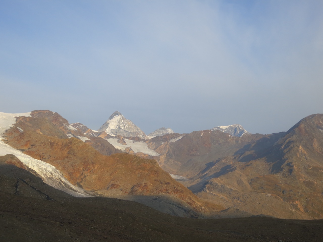 Überschreitung Cima Marmotta und Veneziaspitzen: Auch die Zufallspitze schimmert nun orangerot vom Sonnenaufgang