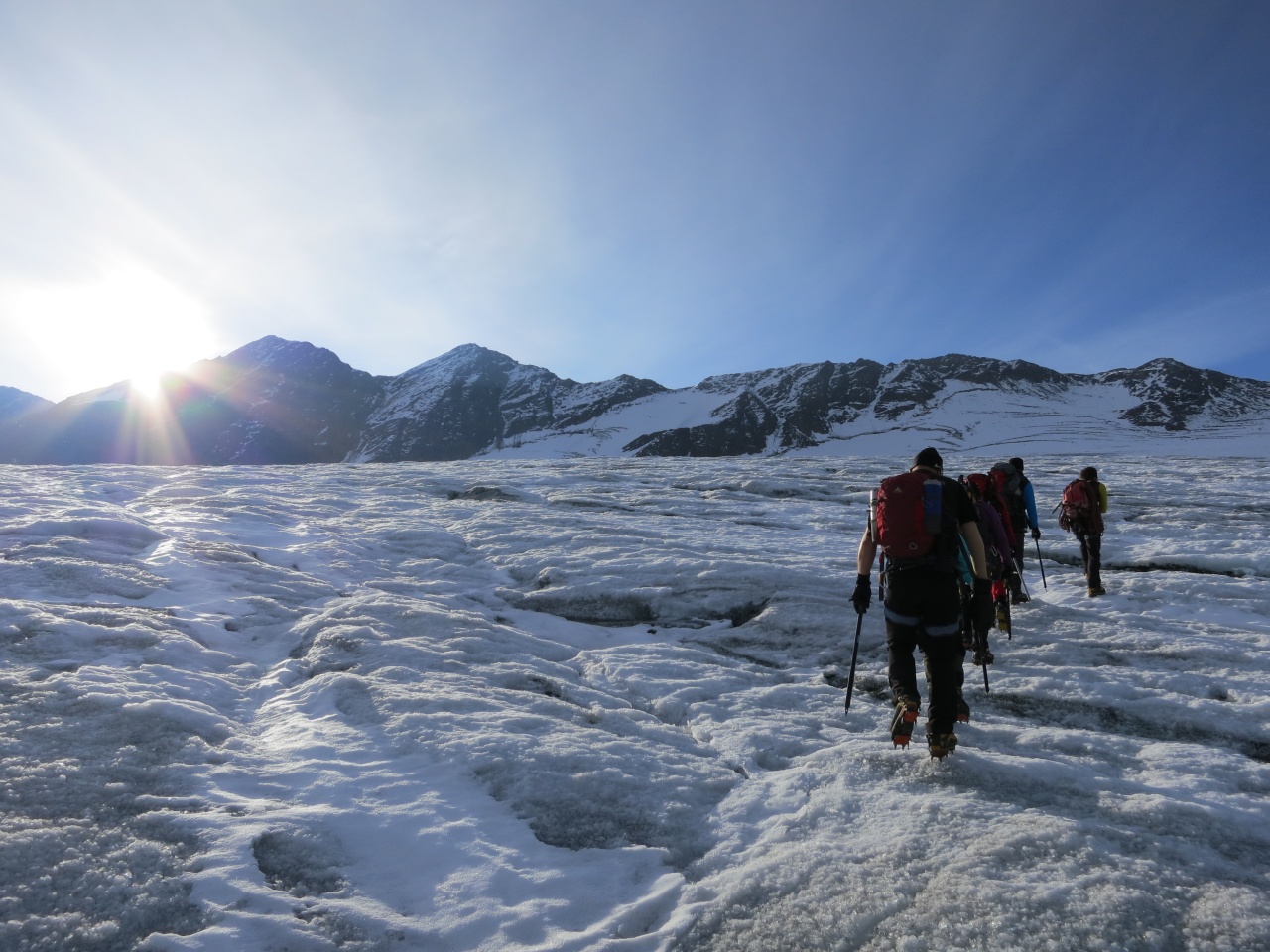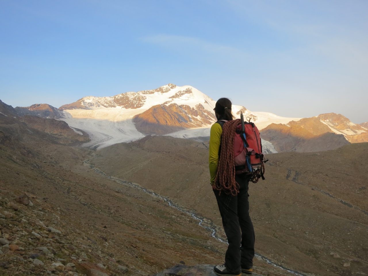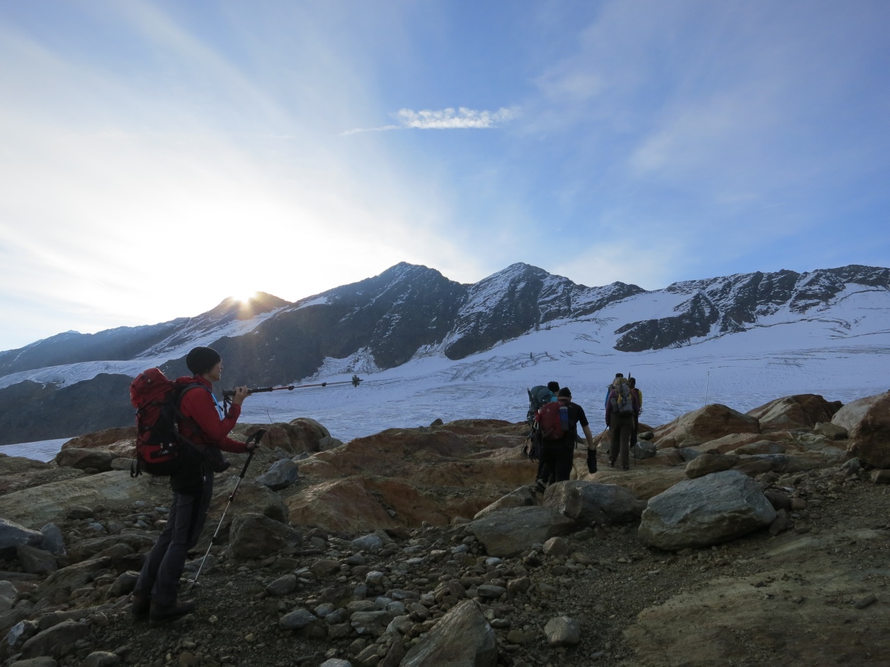 Überschreitung Cima Marmotta und Veneziaspitzen: Kurz bevor wir den Gletscher betreten erreicht uns endlich die Sonne