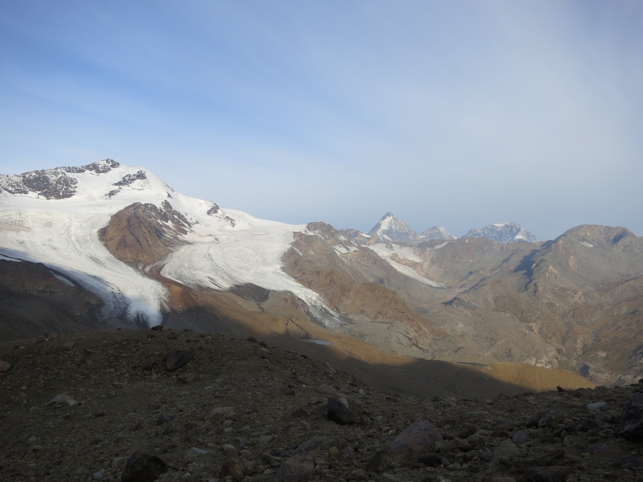 Überschreitung Cima Marmotta und Veneziaspitzen: Die Zufallspitze leuchtet bereits hell im Hintergrund