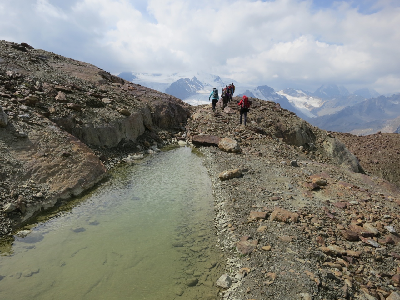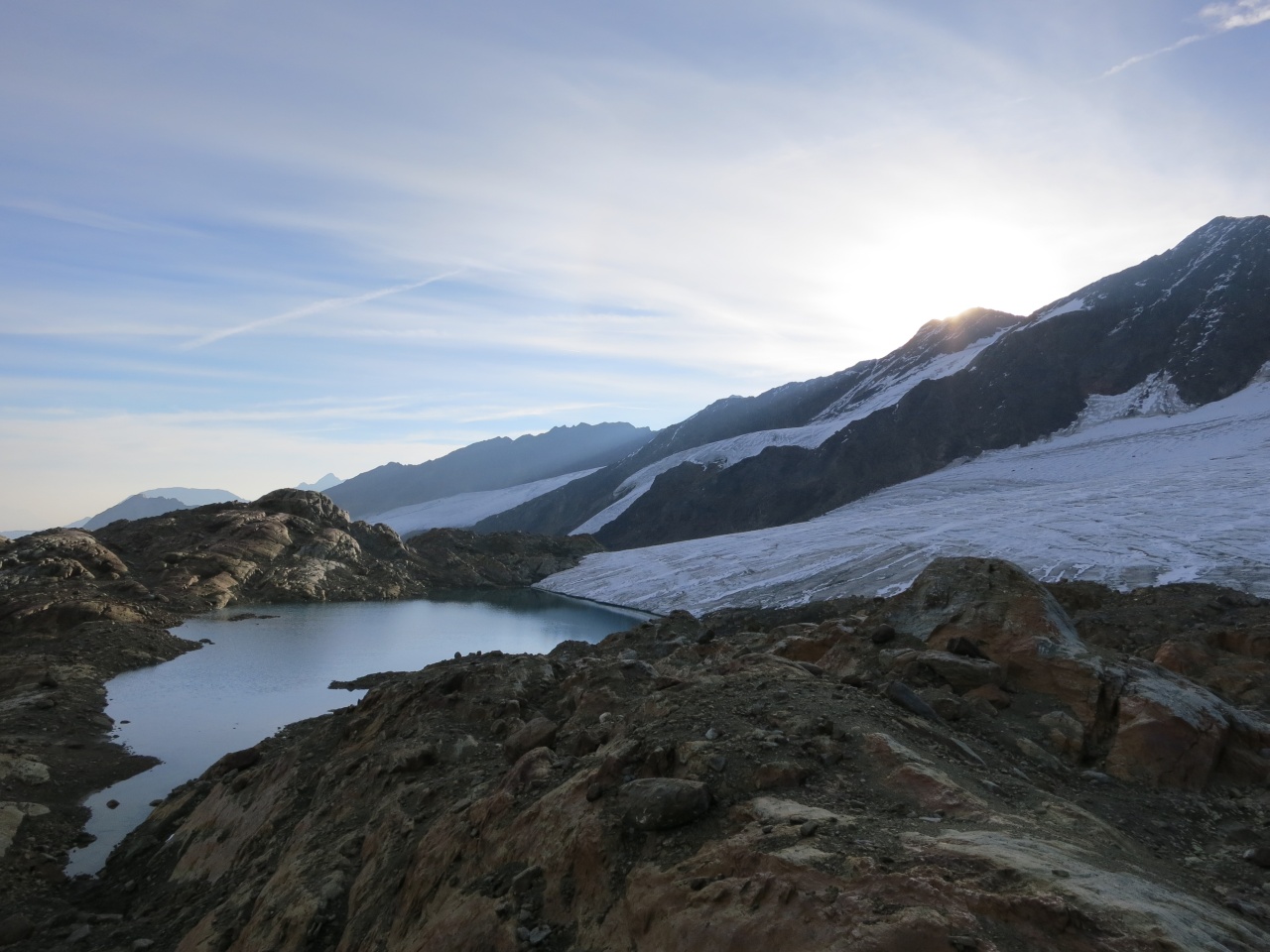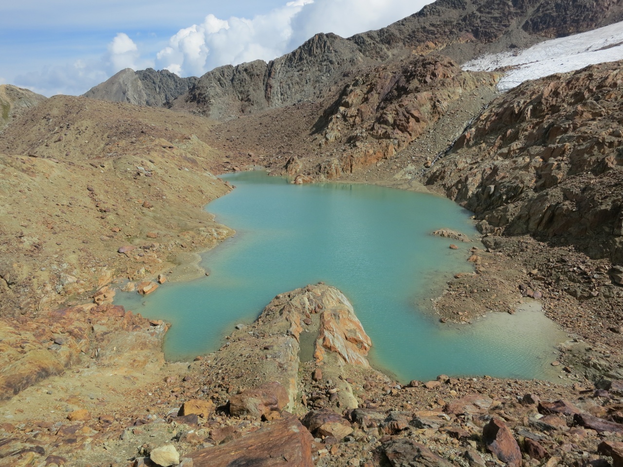 Überschreitung Cima Marmotta und Veneziaspitzen: Am Gletscherrand hat sich ein kleiner See gebildet
