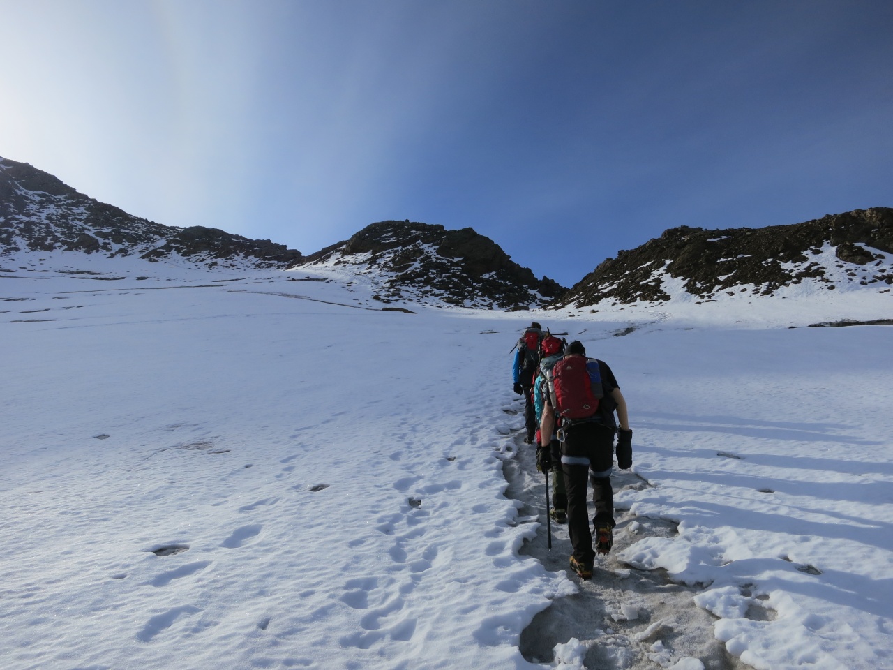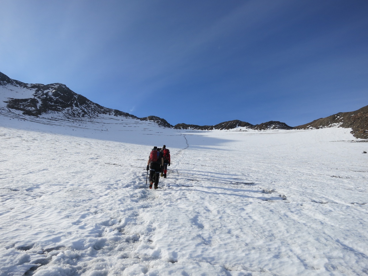 Überschreitung Cima Marmotta und Veneziaspitzen: Auf dem Gletscher sieht man eine breite Spur bis hinauf in die Scharte
