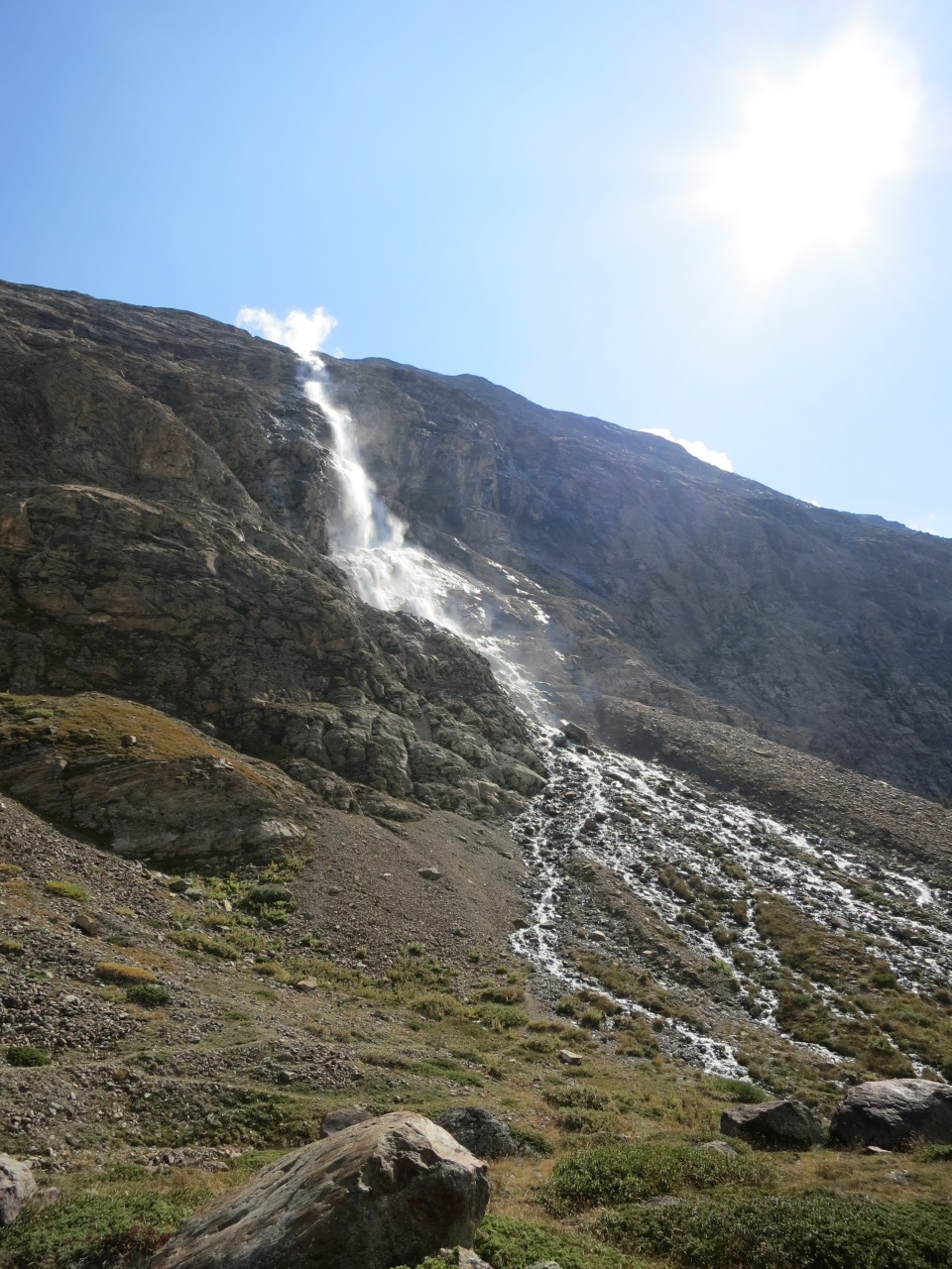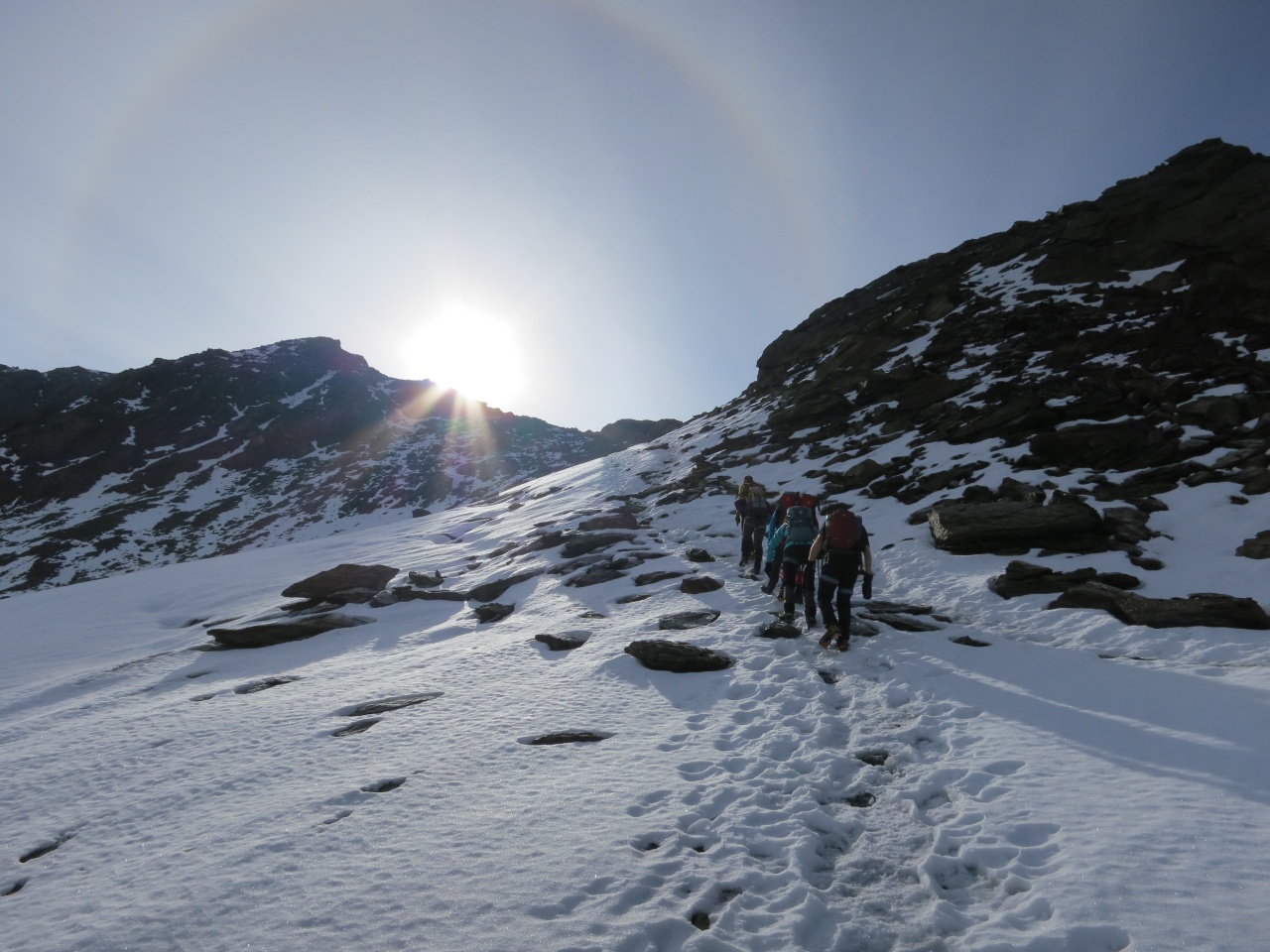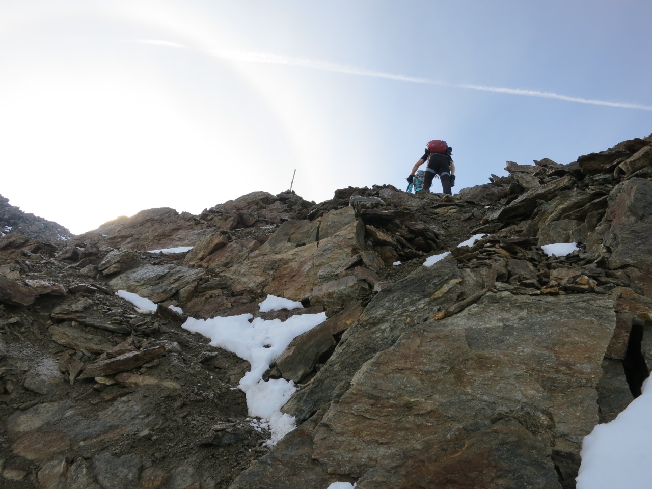 Überschreitung Cima Marmotta und Veneziaspitzen: Grell strahlt die Sonne von der Veneziaspitze auf uns herab