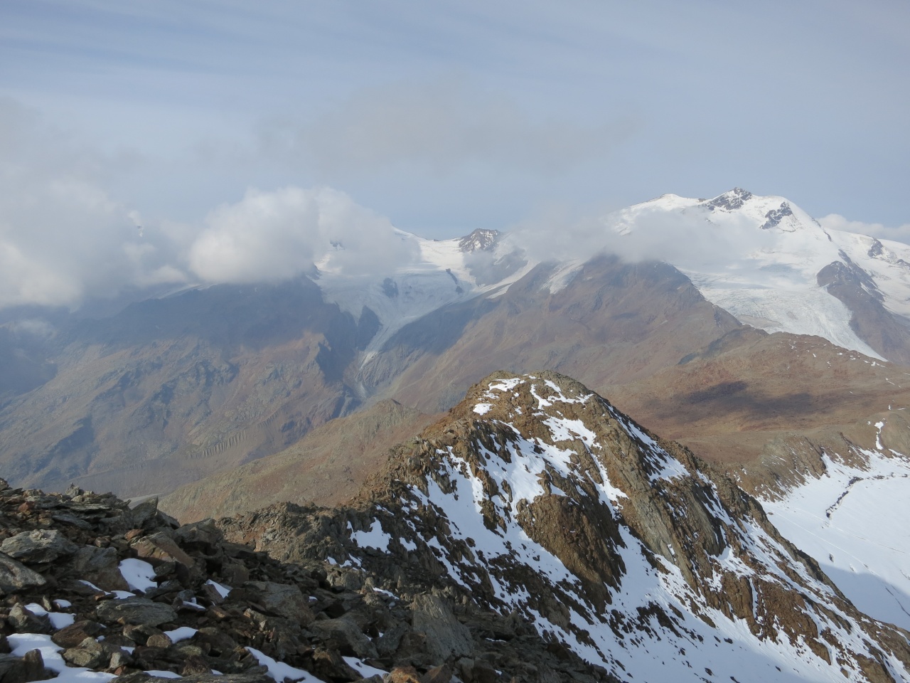 Überschreitung Cima Marmotta und Veneziaspitzen: Von Westen grüßen nun auch Zebru und Ortler