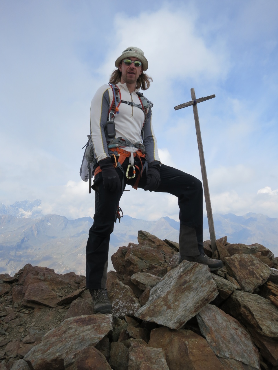 Über den Normalweg zur Marteller Hütte und dann dem markierten Weg zum Marmotta folgend bis zum Gletscher. Dort der deutlichen Spur nach über den spaltenarmen Gletscher bis auf den Grat. In leichtem Anstieg bis auf den ersten Gipfel. Nun in stetem Abstieg und Aufstieg in teils ausgesetzter und an der Schlüsselstelle Kletterei im III. Grad.