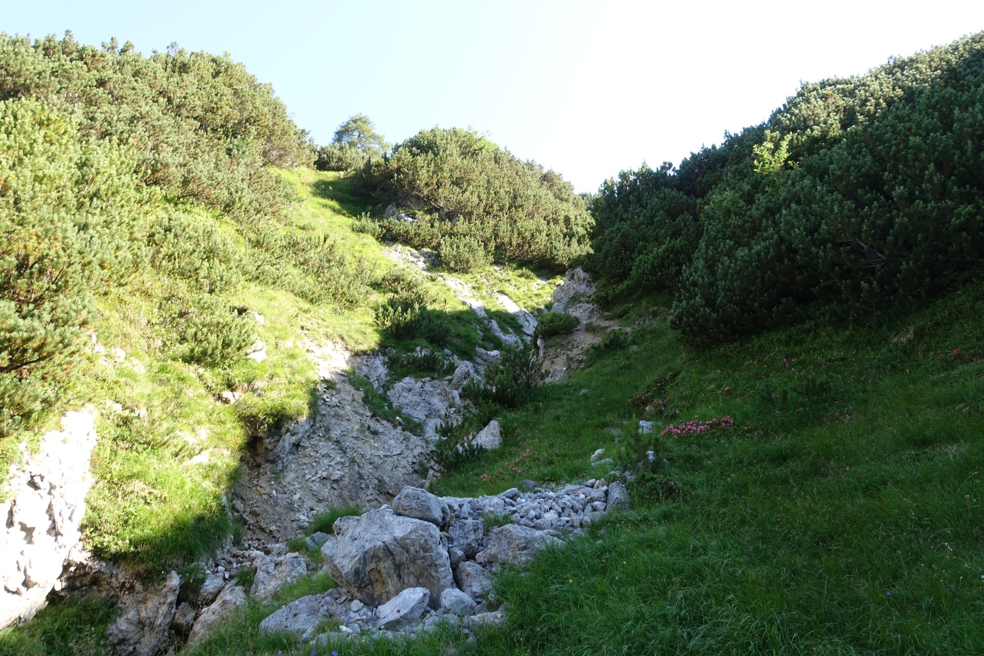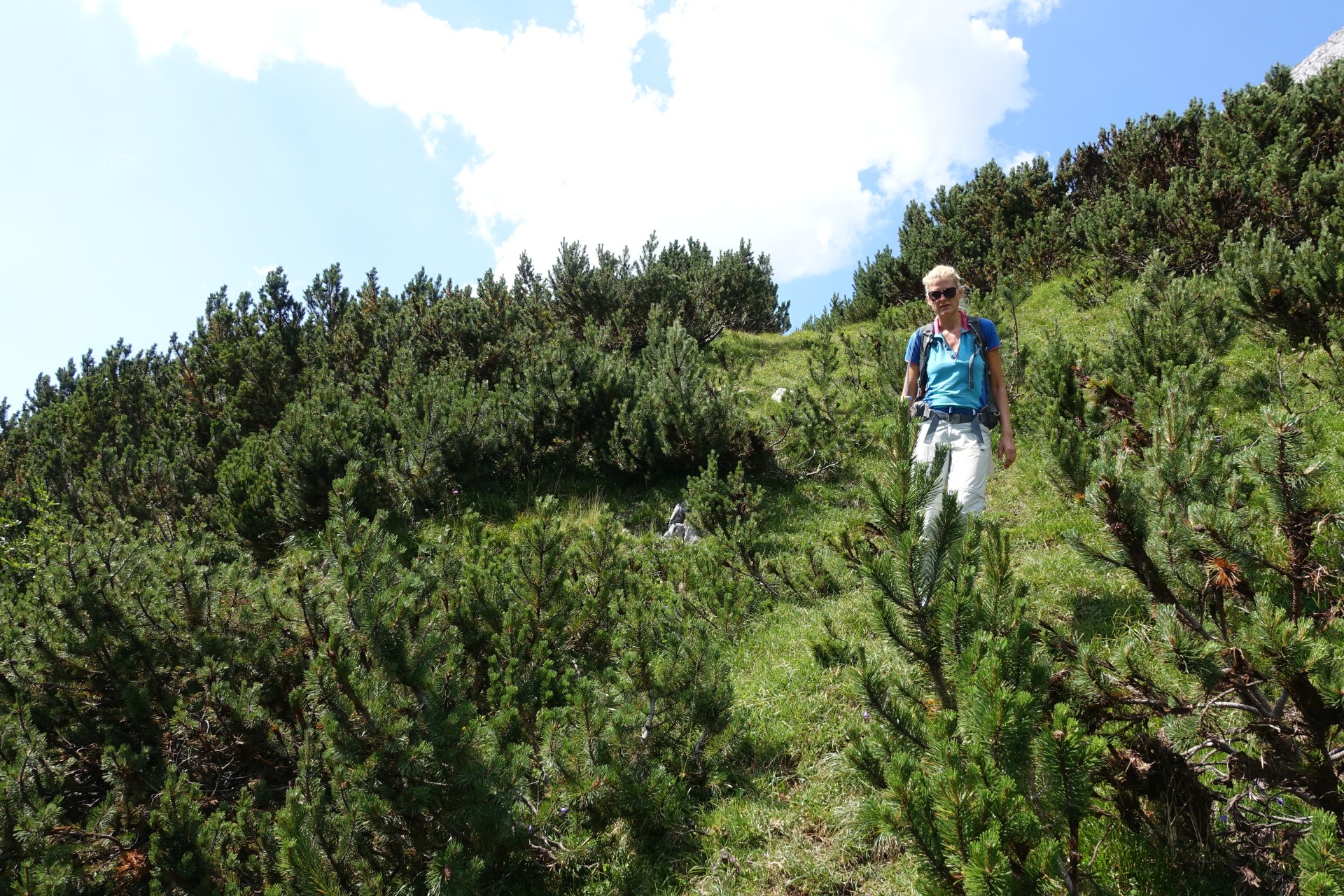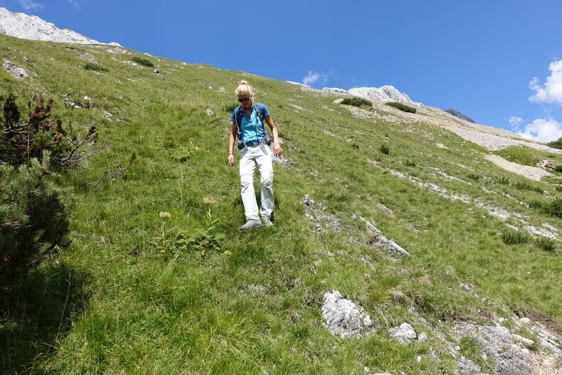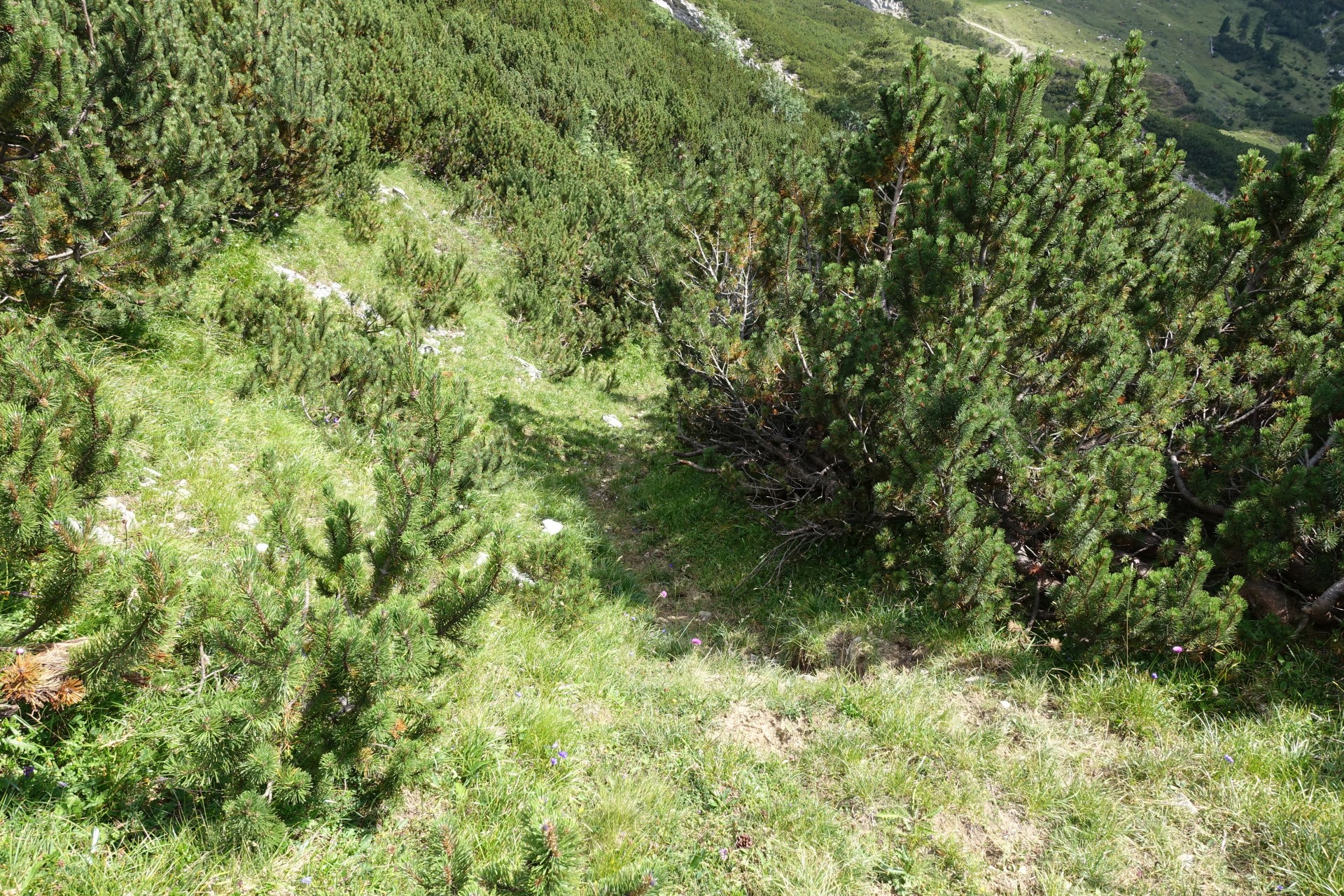 Auf selbem Weg zurück, nur diesmal auf dem schwach ausgetreten Pfad mit gelegentlichen Markierungen über steile Wiesen hinab bis zu den Latschen. Hier fanden wir eine nicht immer freigeschnittene Gasse bis zur Hallerangeralm.