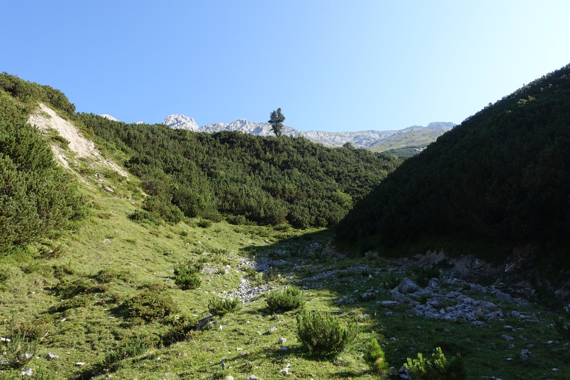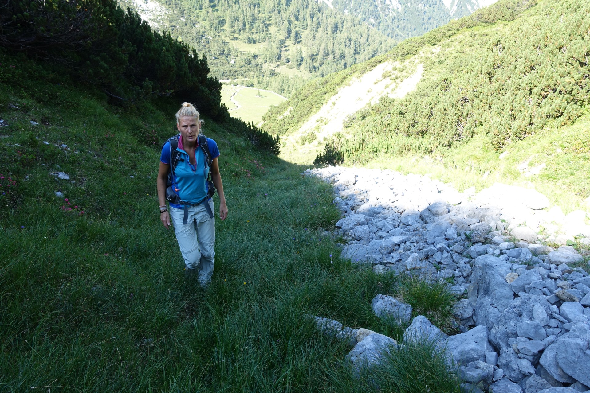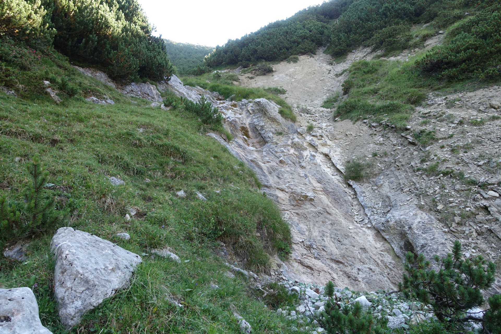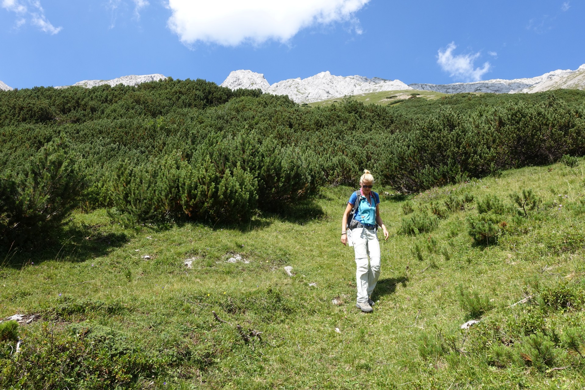 Auf selbem Weg zurück, nur diesmal auf dem schwach ausgetreten Pfad mit gelegentlichen Markierungen über steile Wiesen hinab bis zu den Latschen. Hier fanden wir eine nicht immer freigeschnittene Gasse bis zur Hallerangeralm.