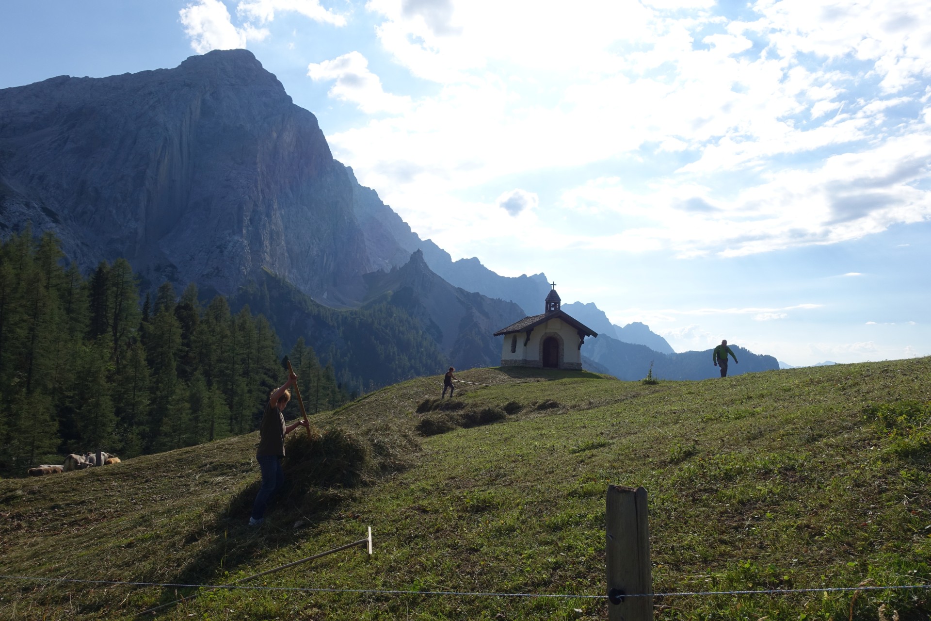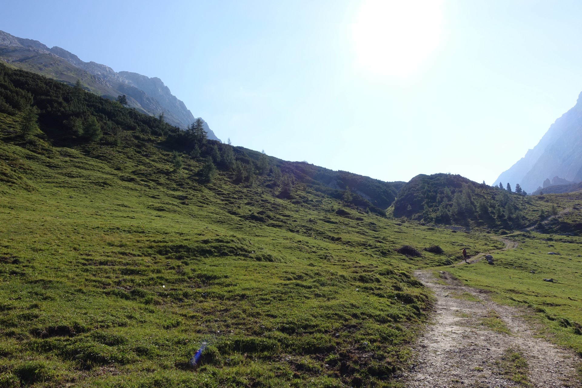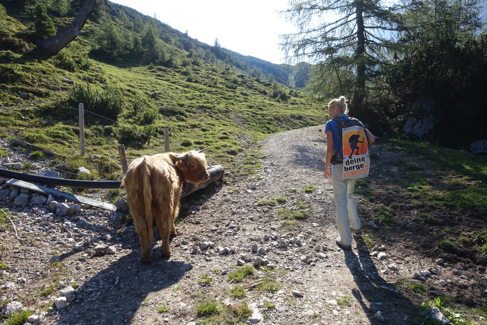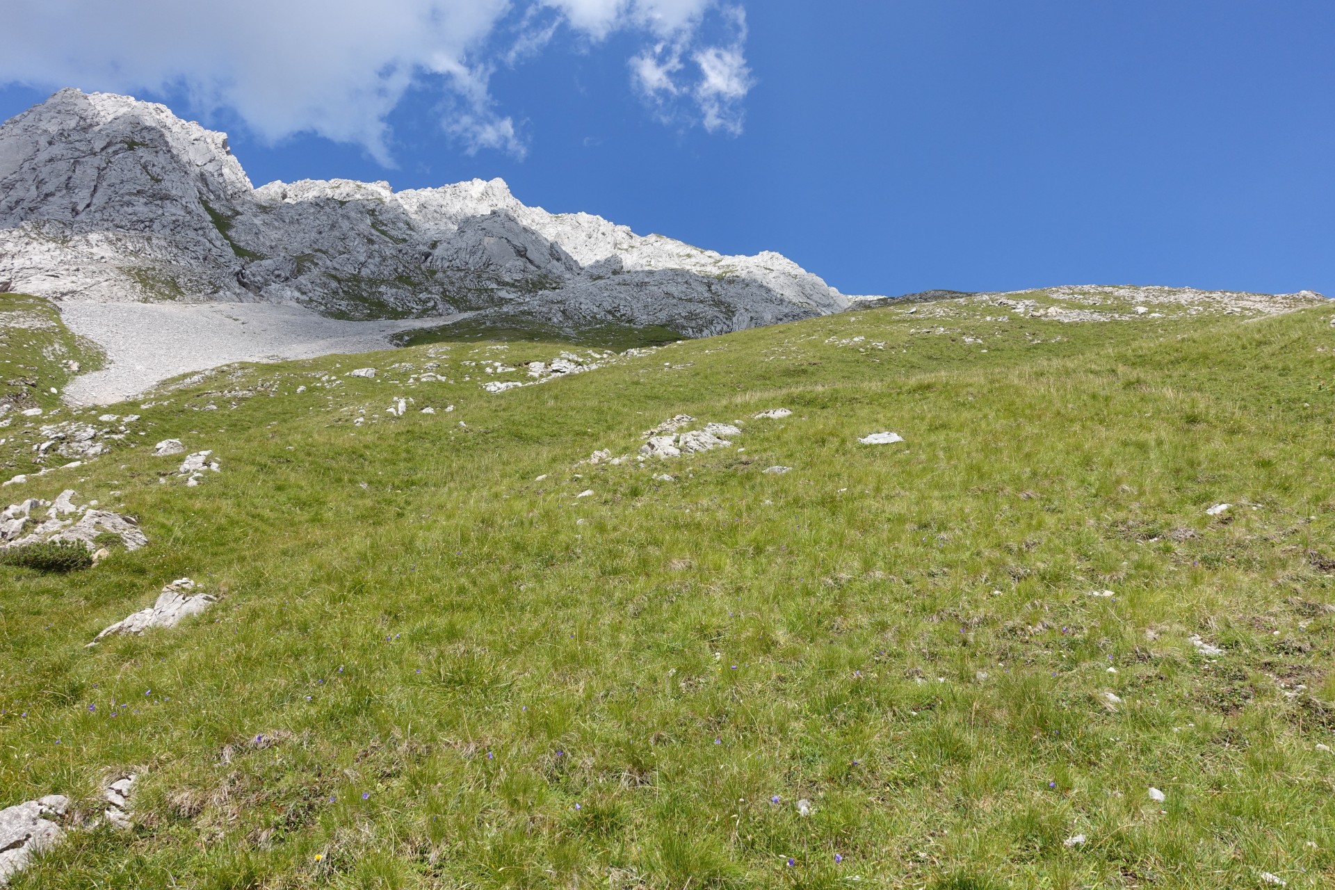 Auf selbem Weg zurück, nur diesmal auf dem schwach ausgetreten Pfad mit gelegentlichen Markierungen über steile Wiesen hinab bis zu den Latschen. Hier fanden wir eine nicht immer freigeschnittene Gasse bis zur Hallerangeralm.