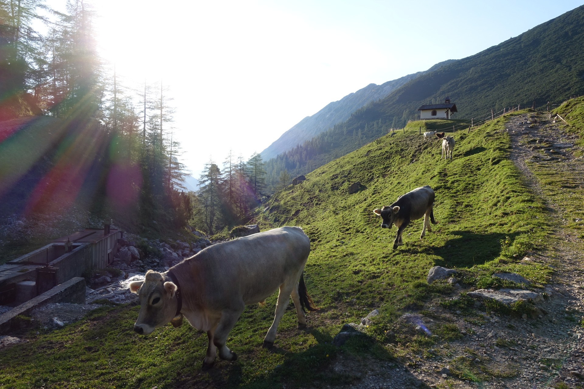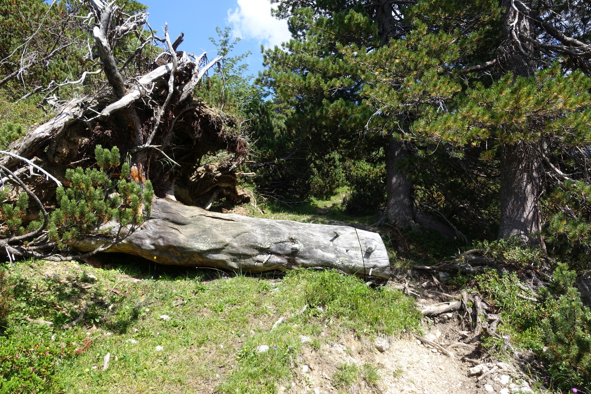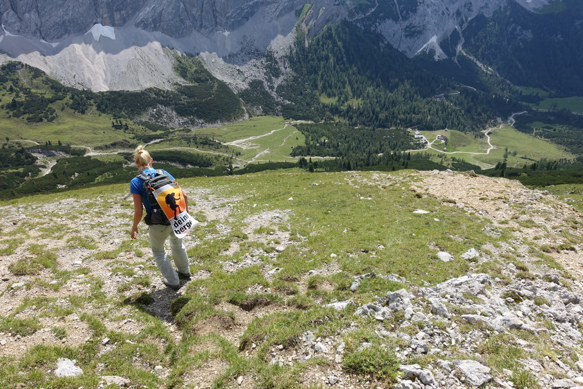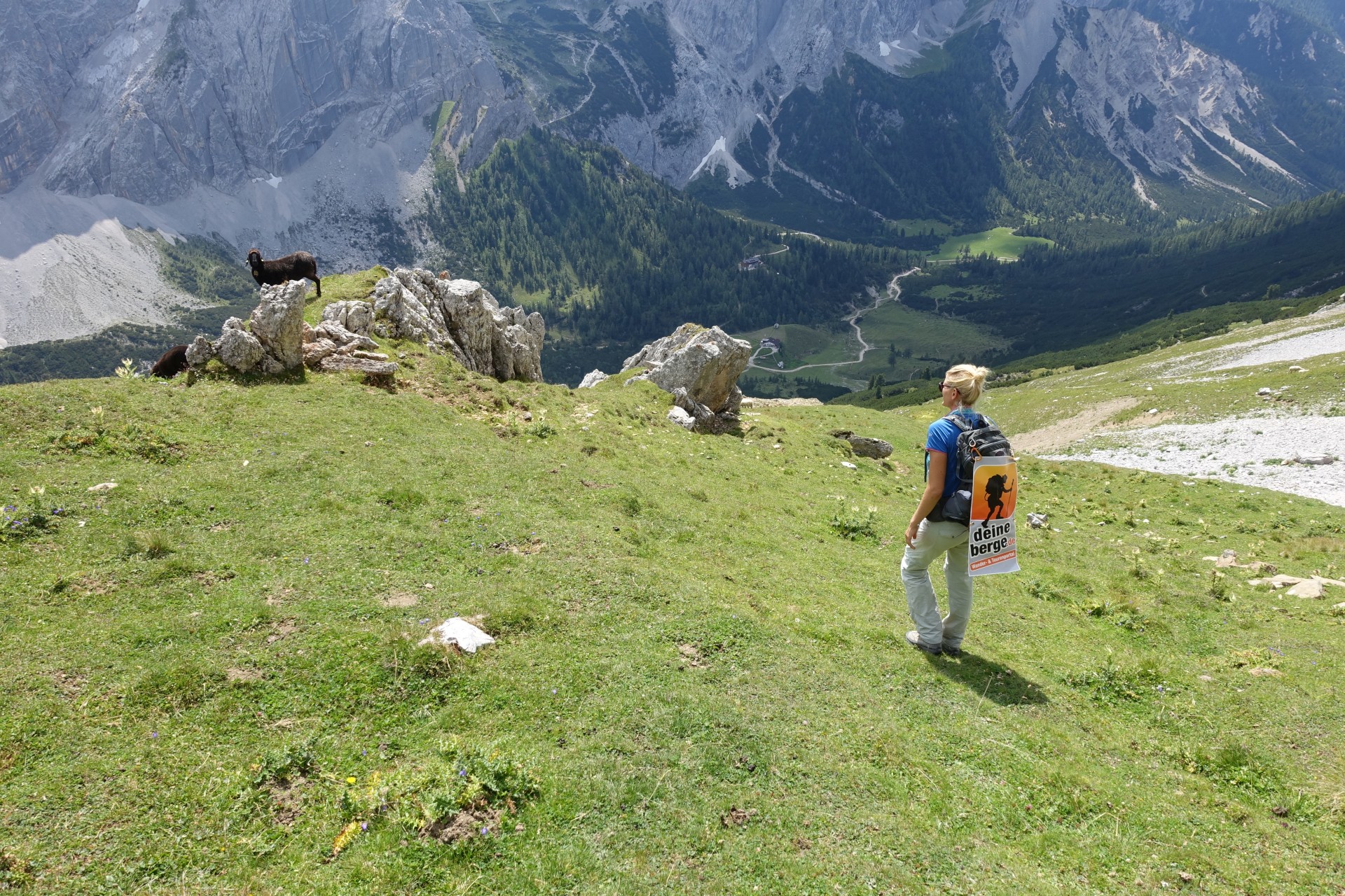 Auf selbem Weg zurück, nur diesmal auf dem schwach ausgetreten Pfad mit gelegentlichen Markierungen über steile Wiesen hinab bis zu den Latschen. Hier fanden wir eine nicht immer freigeschnittene Gasse bis zur Hallerangeralm.