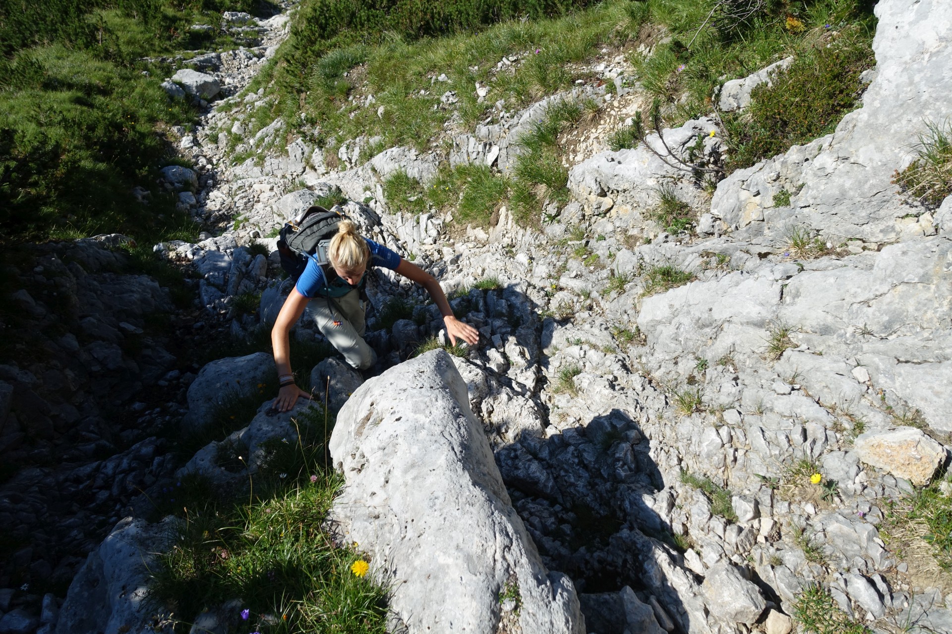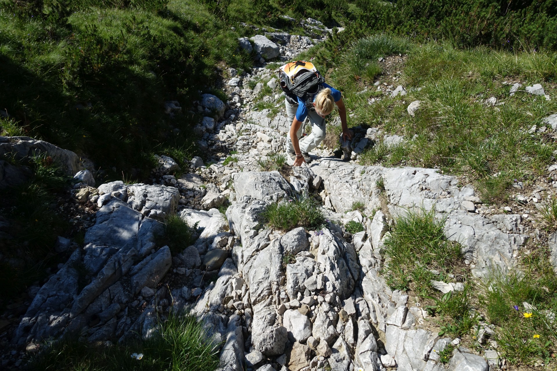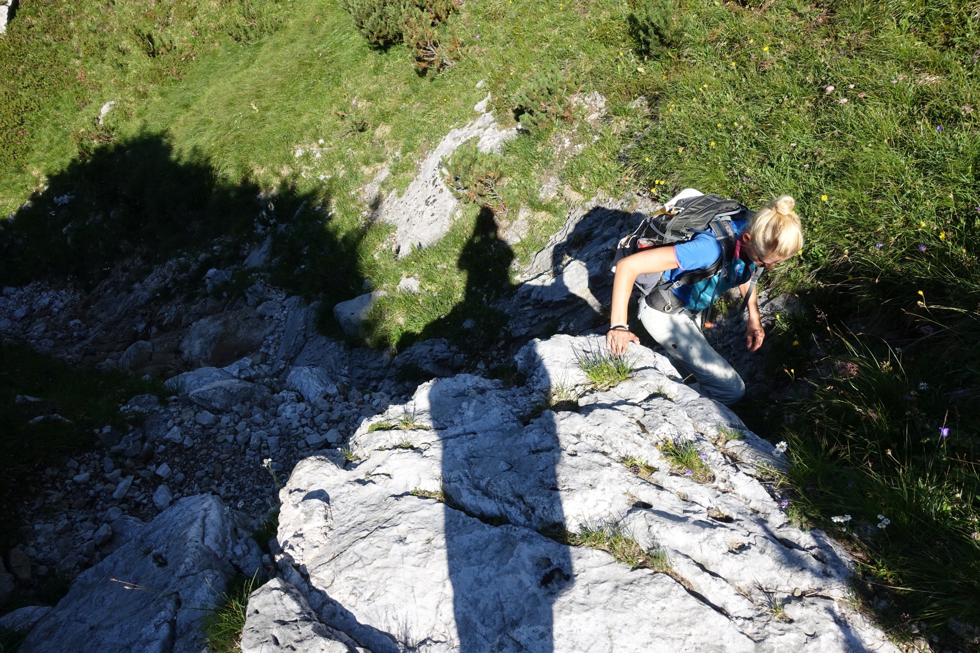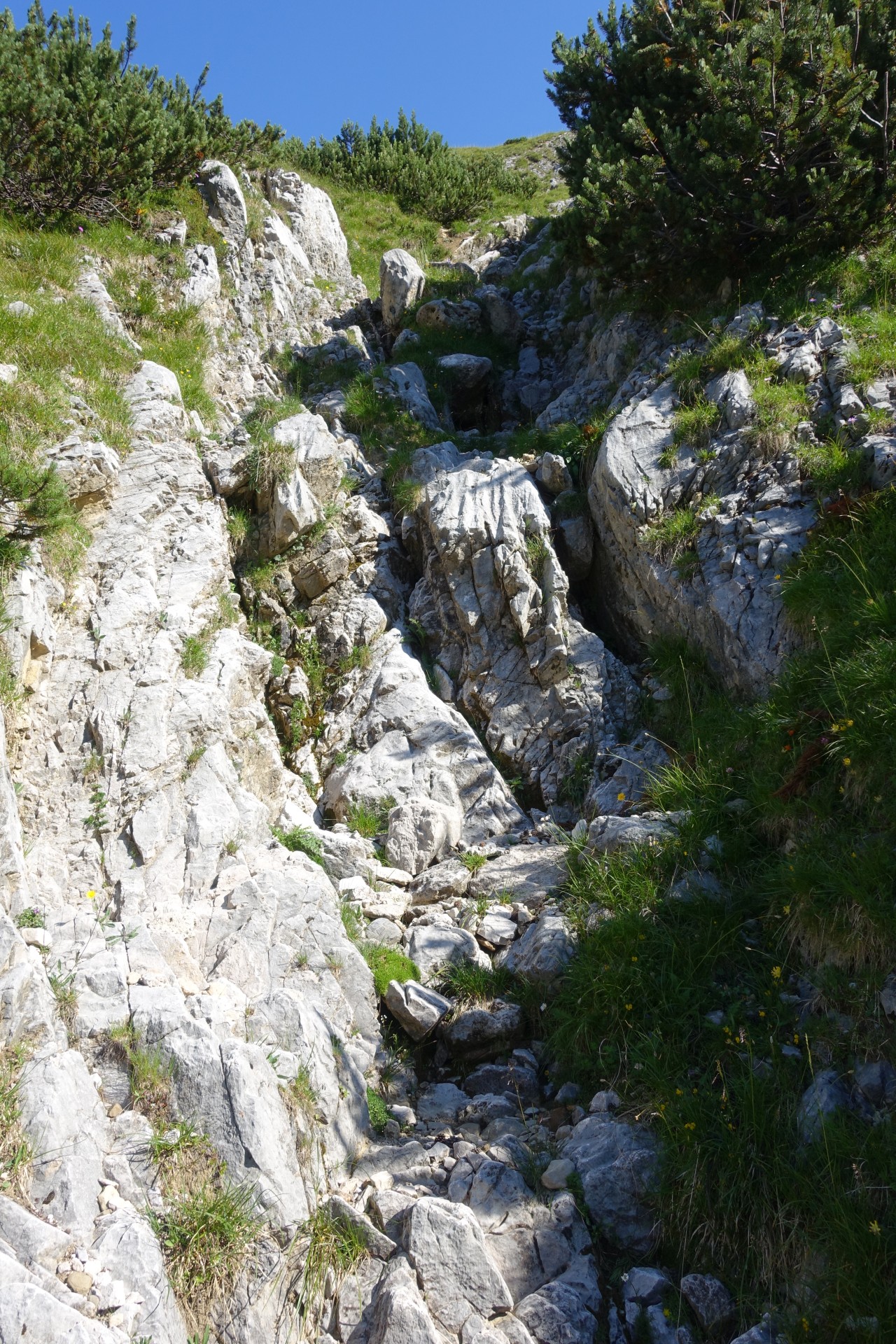 Einen Abzweig gibt es nicht vom Hauptweg, auch keine Markierung oder Pfadspur. Also stiegen wir durch eine Rinne in leichter interessanter Kletterei so lange auf, bis wir auf einen Steig trafen.