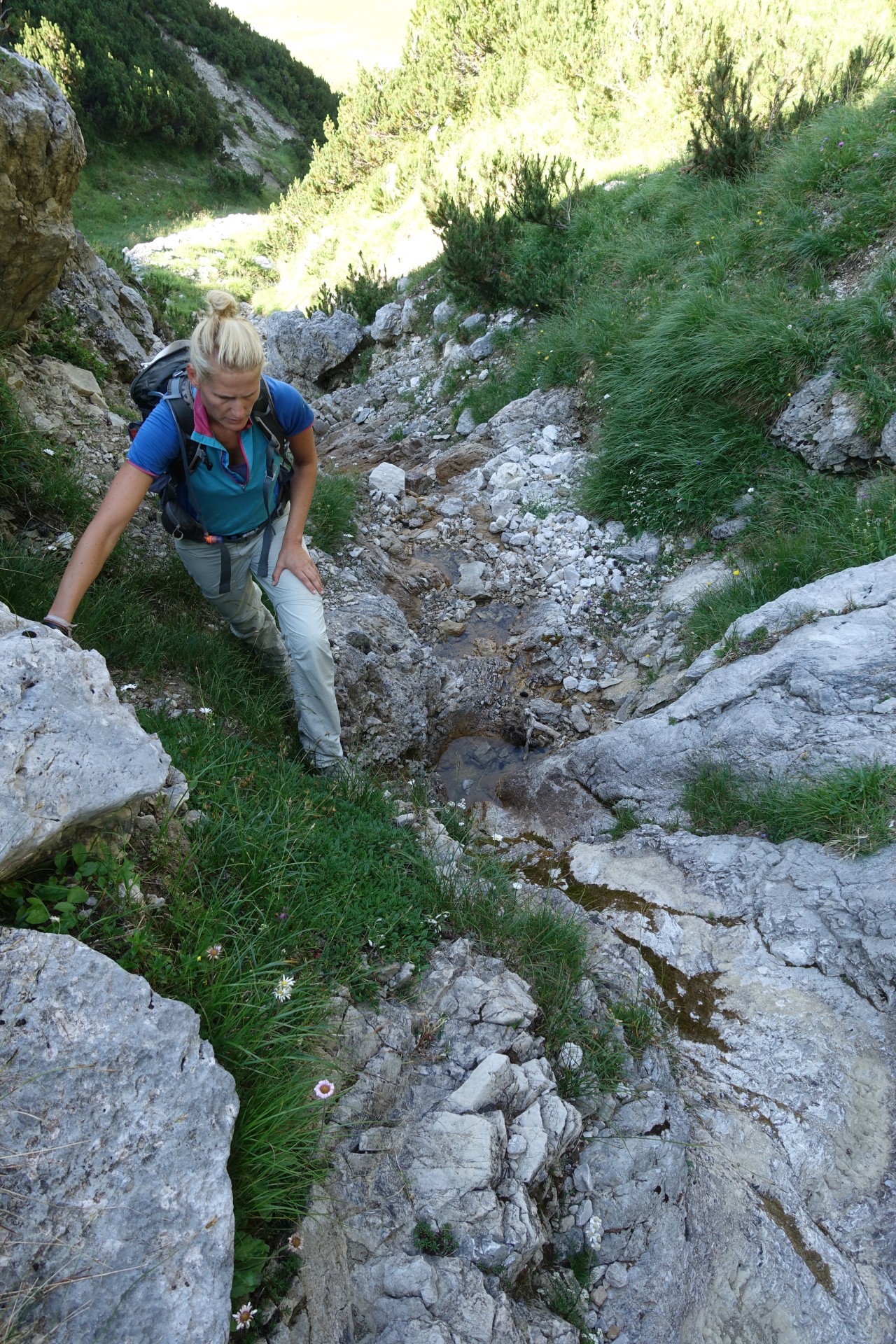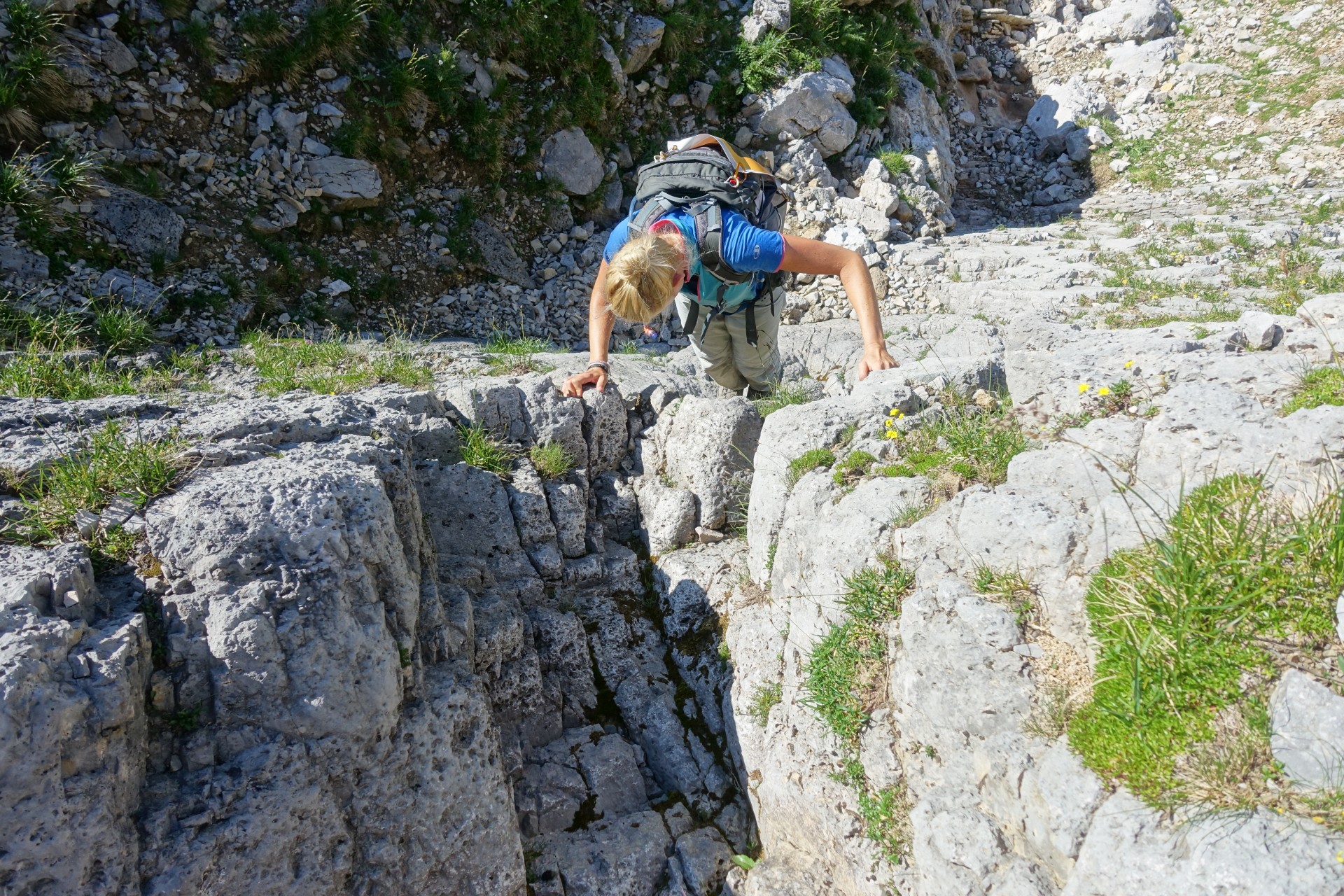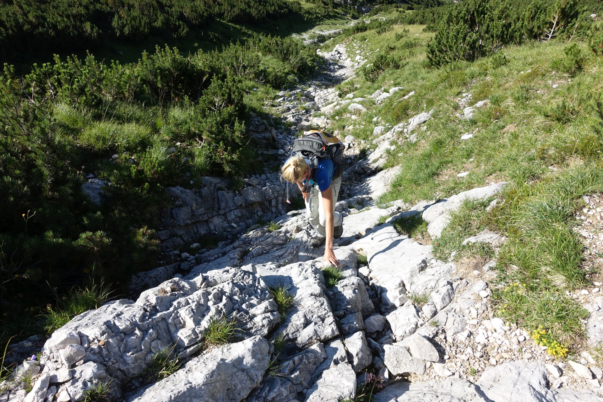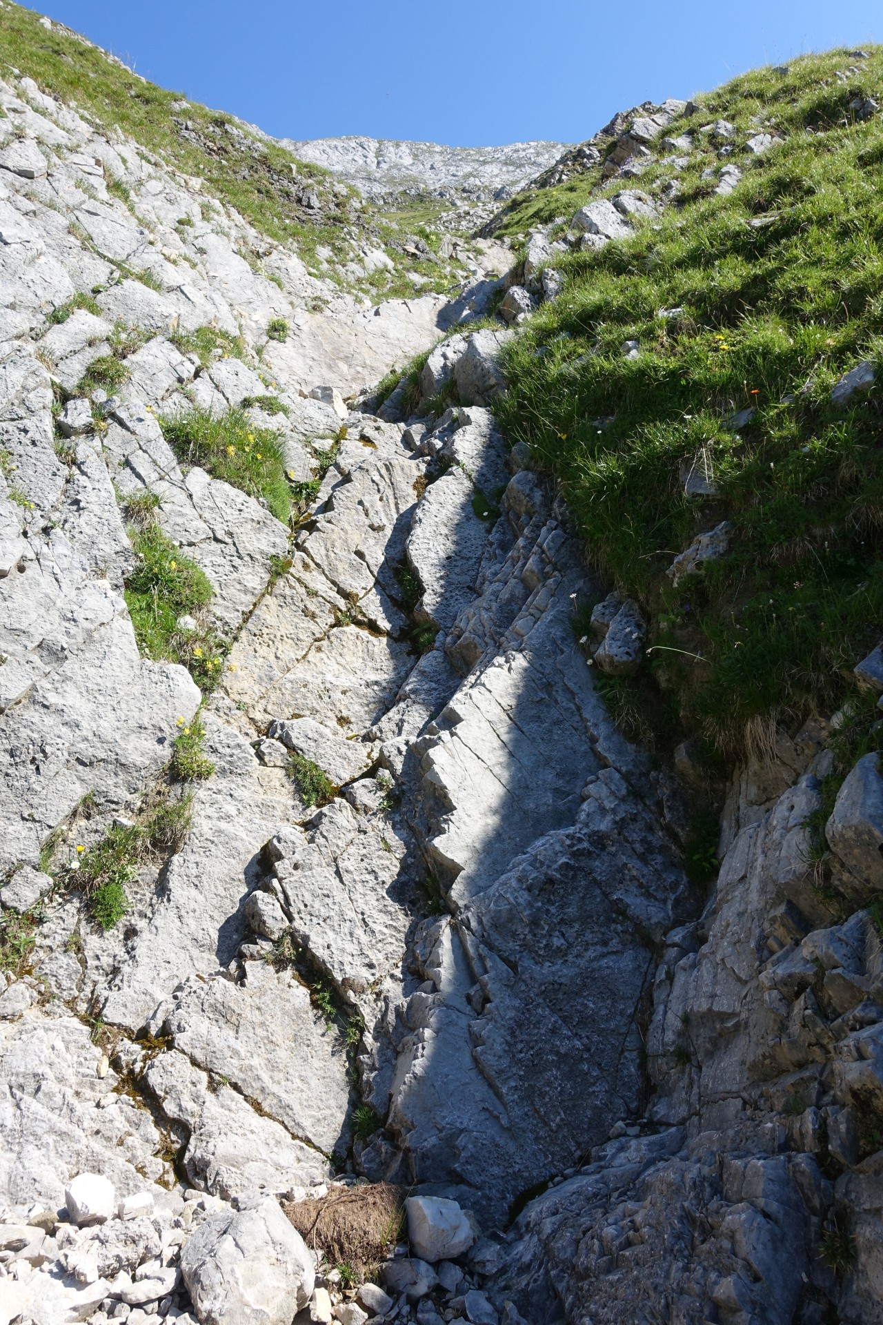 Einen Abzweig gibt es nicht vom Hauptweg, auch keine Markierung oder Pfadspur. Also stiegen wir durch eine Rinne in leichter interessanter Kletterei so lange auf, bis wir auf einen Steig trafen.