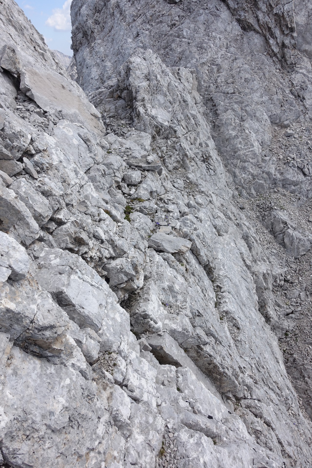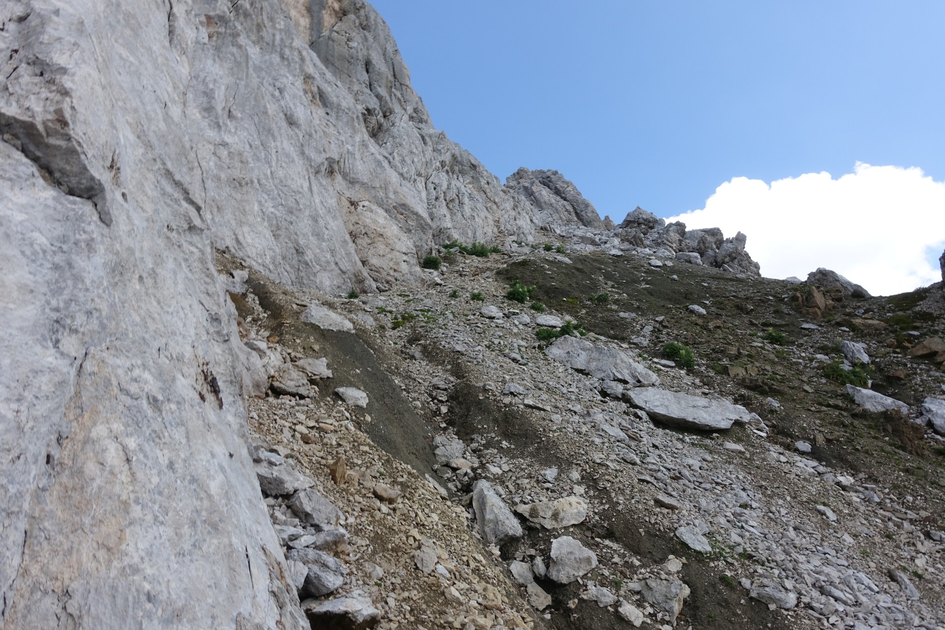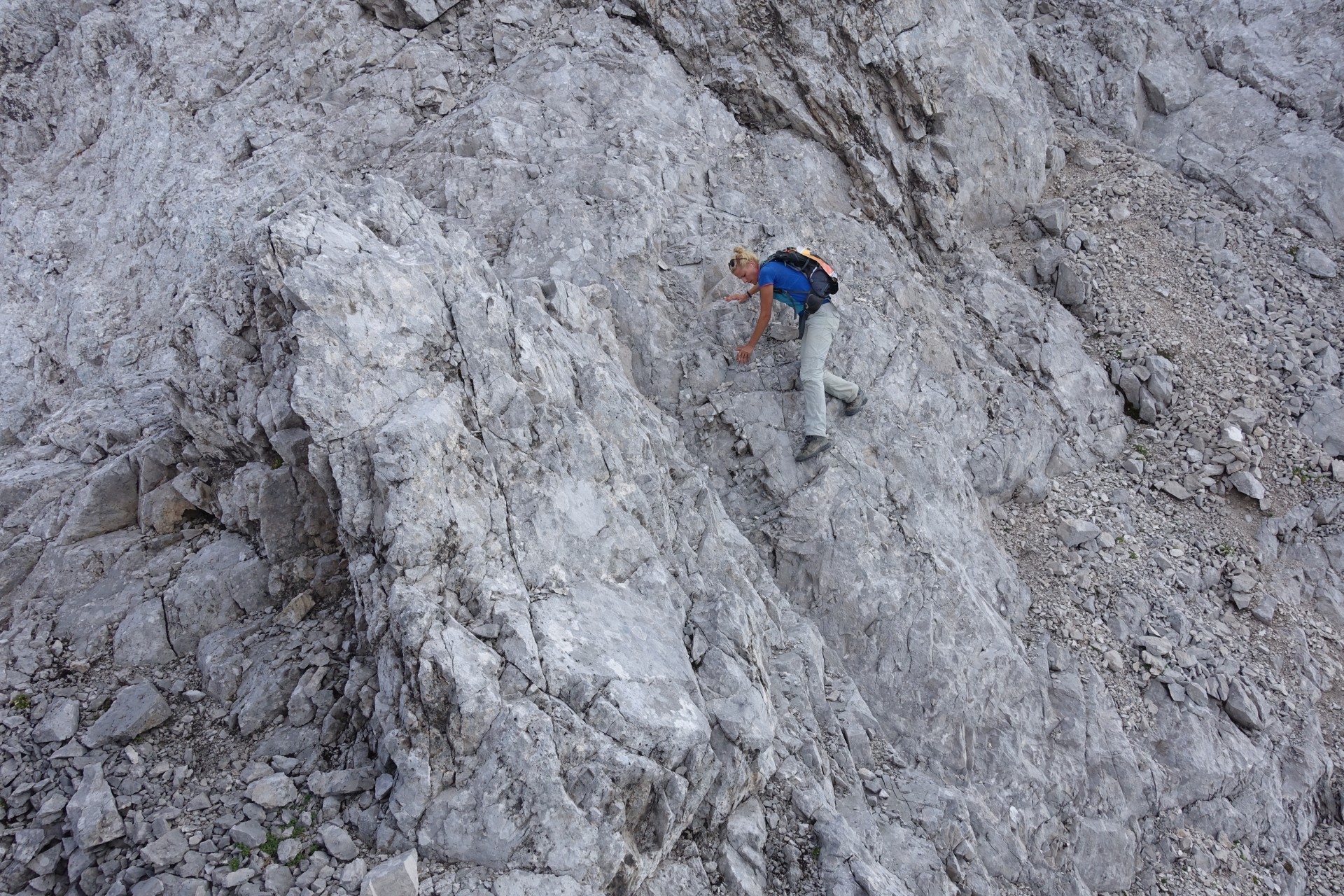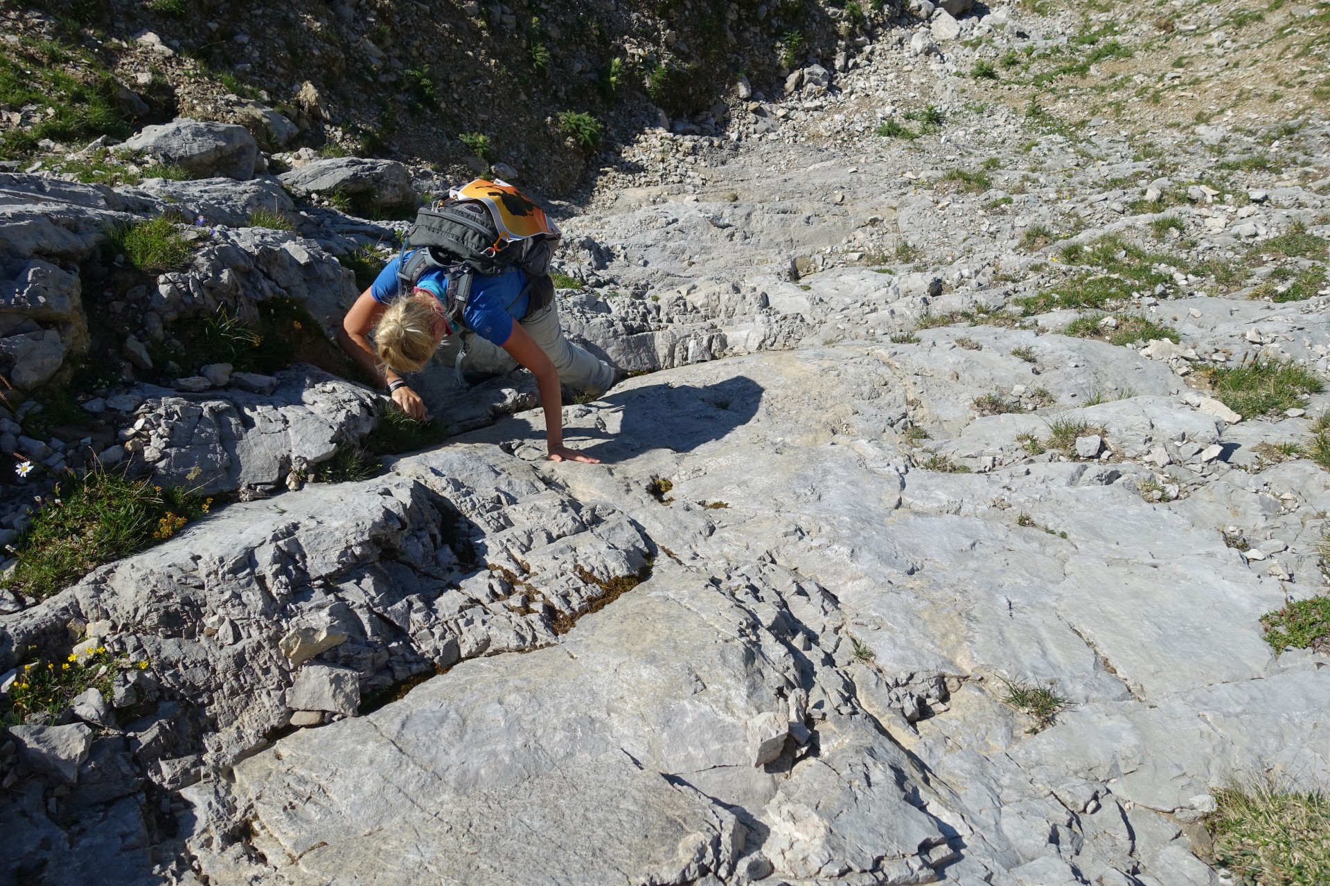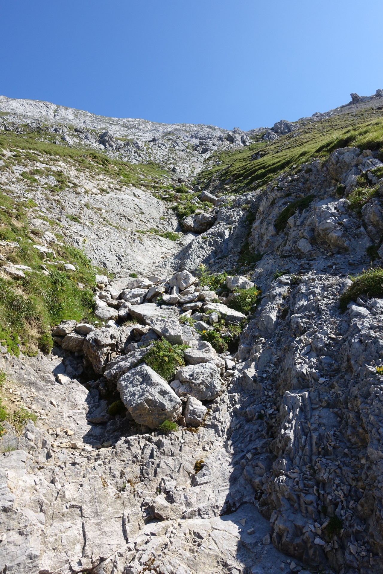 Einen Abzweig gibt es nicht vom Hauptweg, auch keine Markierung oder Pfadspur. Also stiegen wir durch eine Rinne in leichter interessanter Kletterei so lange auf, bis wir auf einen Steig trafen.