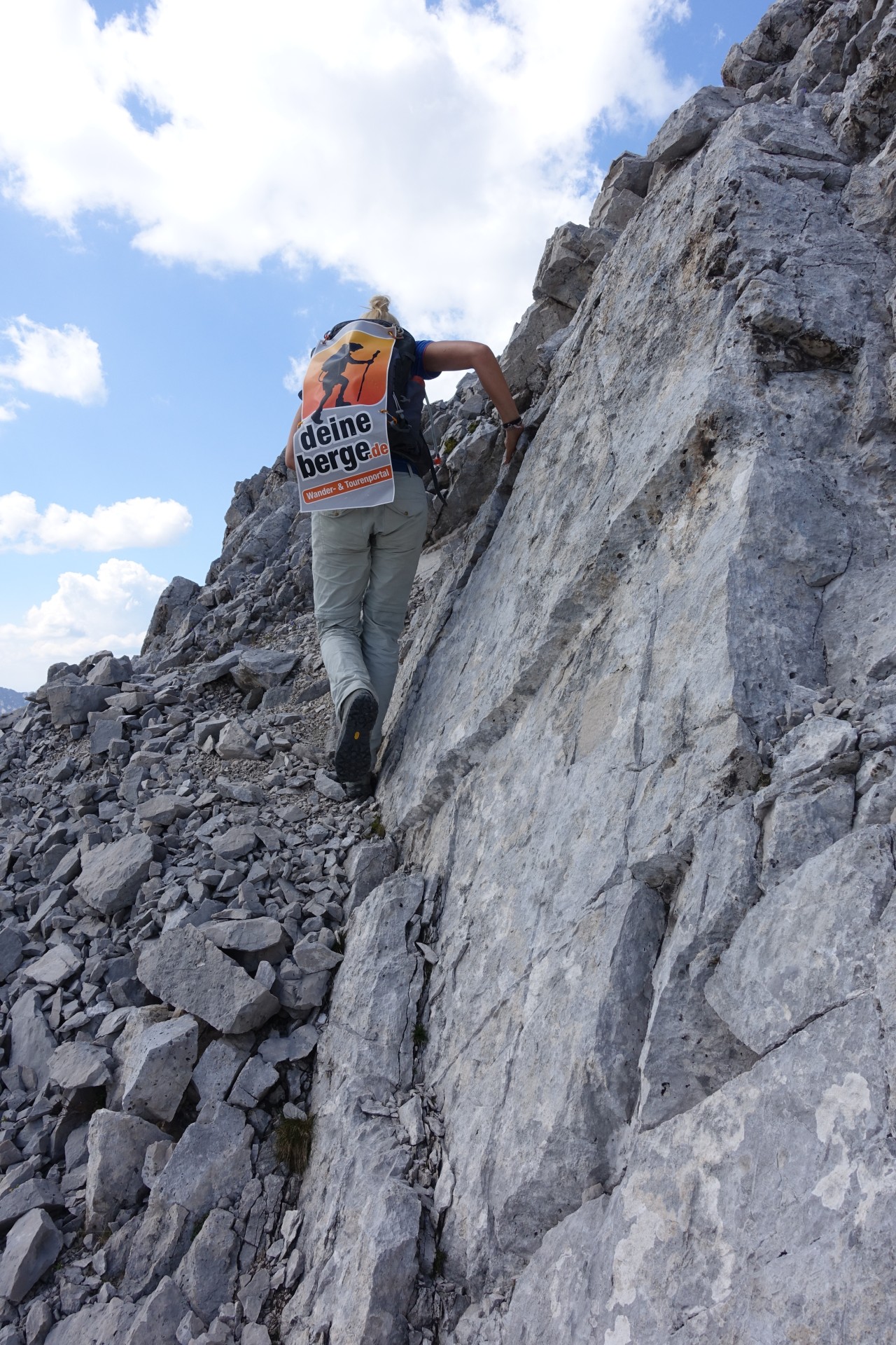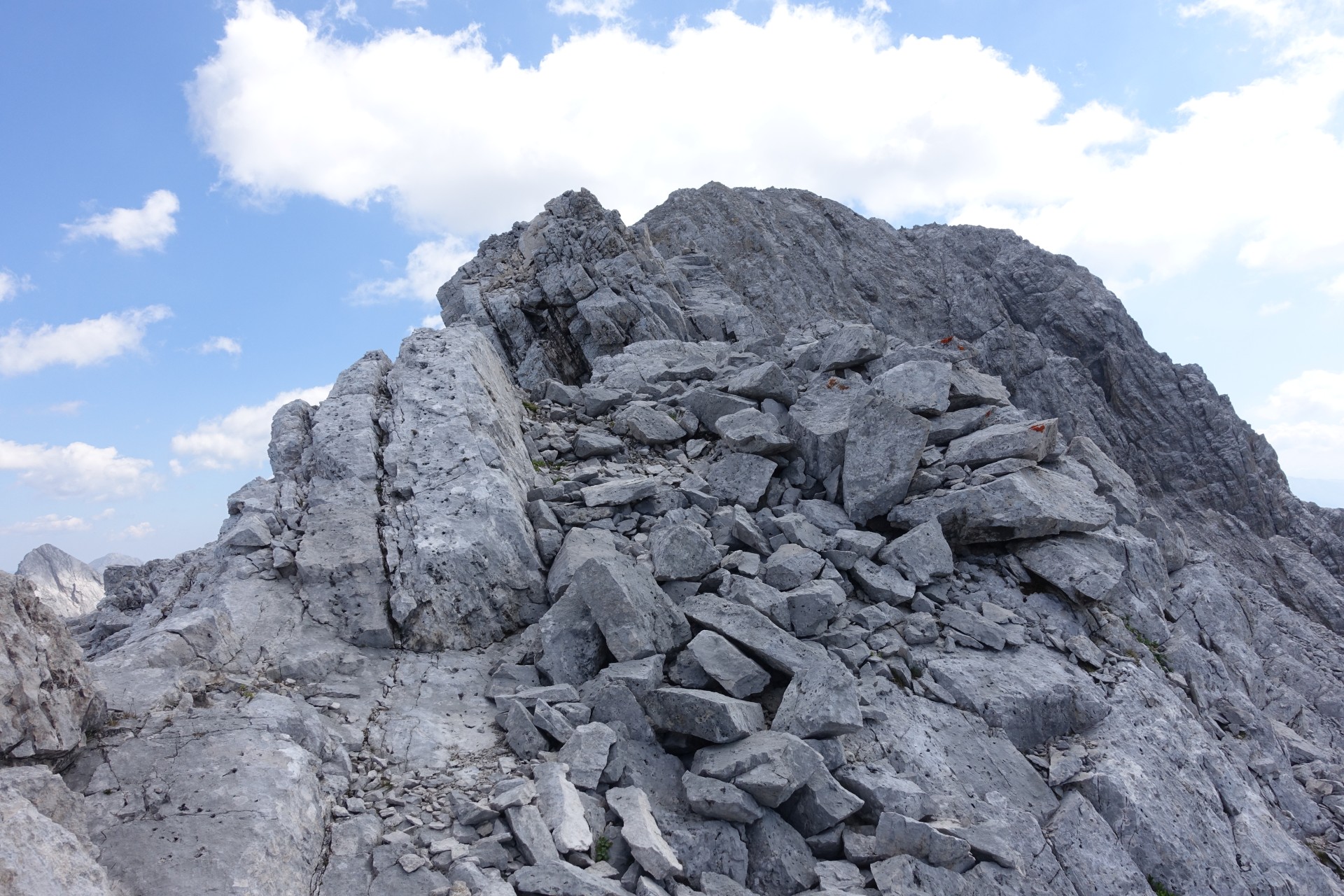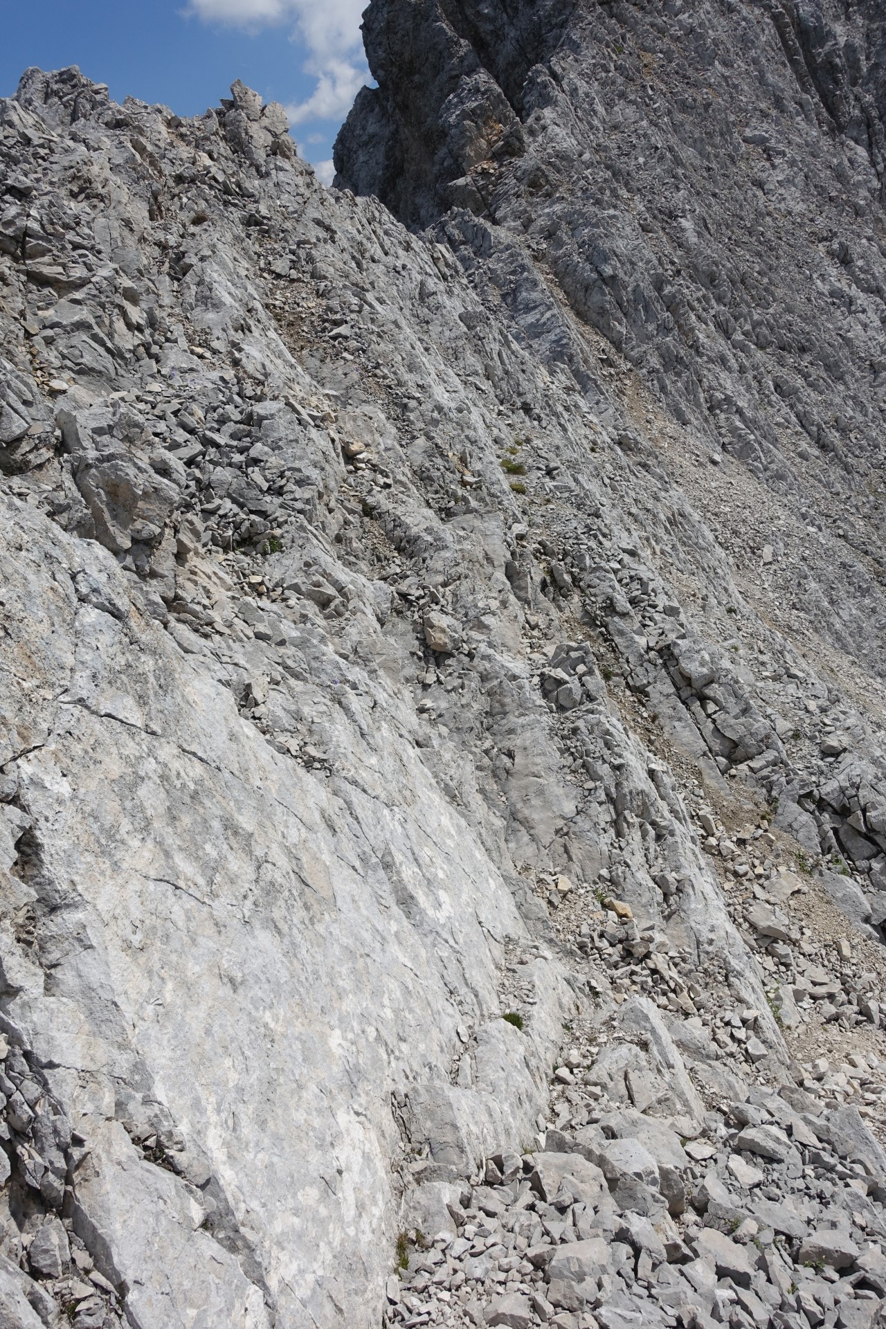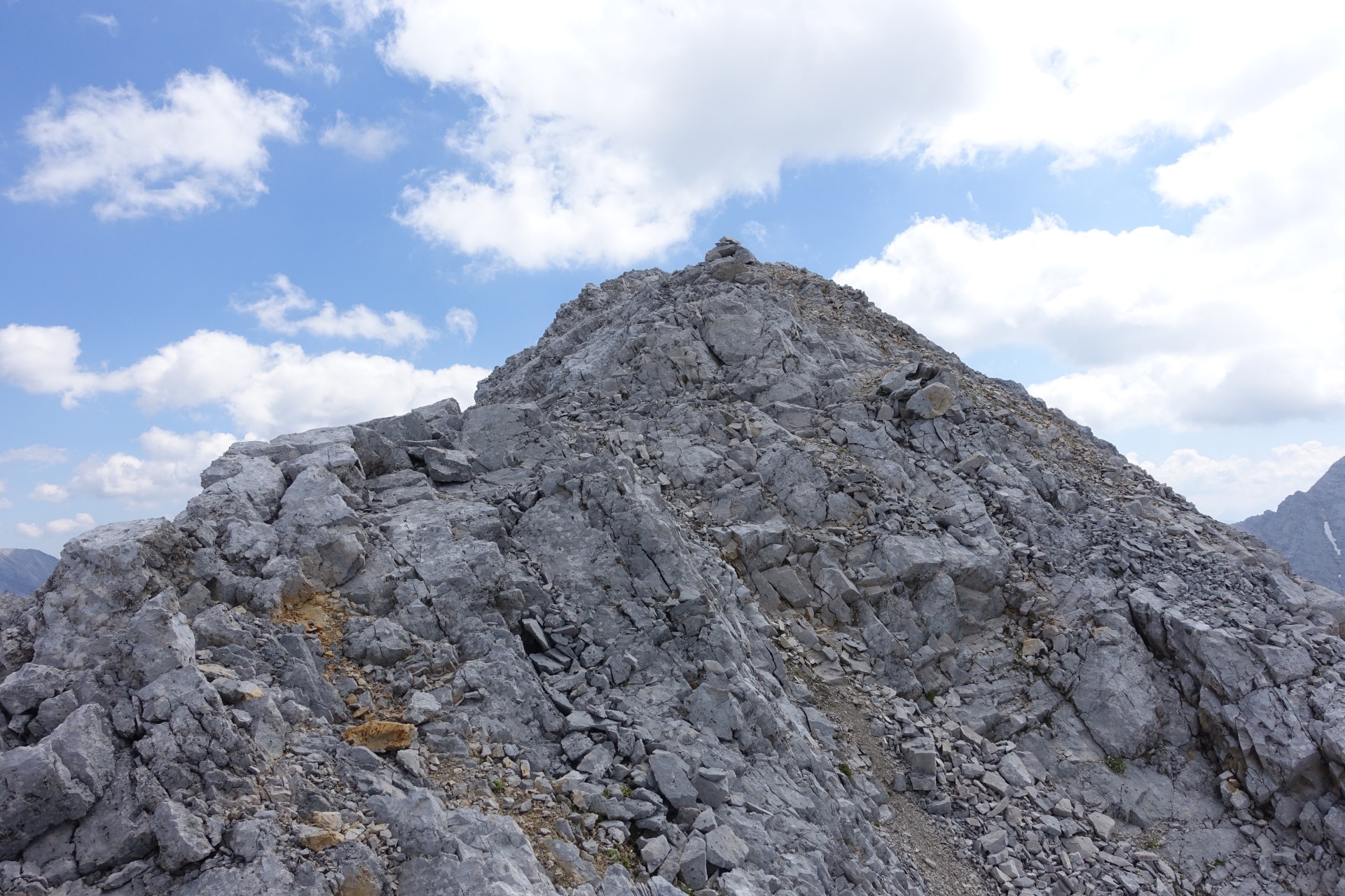 Über steile Wiesen und Geröll nun hinauf bis an den Fels. Im typischen Karwendelbruch bis auf den Grat. Auf diesem in leichter Kletterei bis zum unscheinbaren Gipfel mit Steinmann.