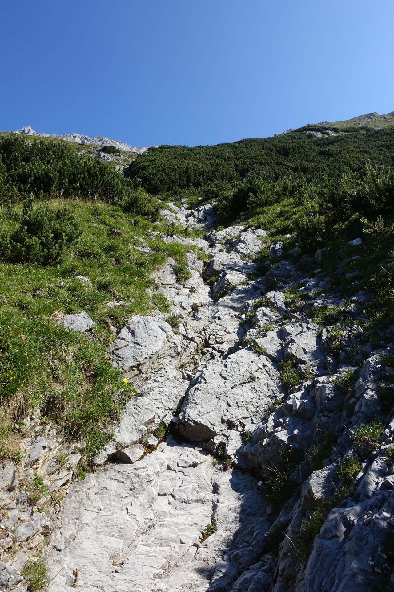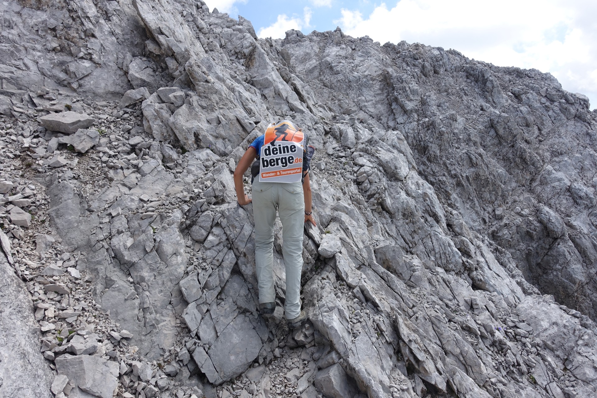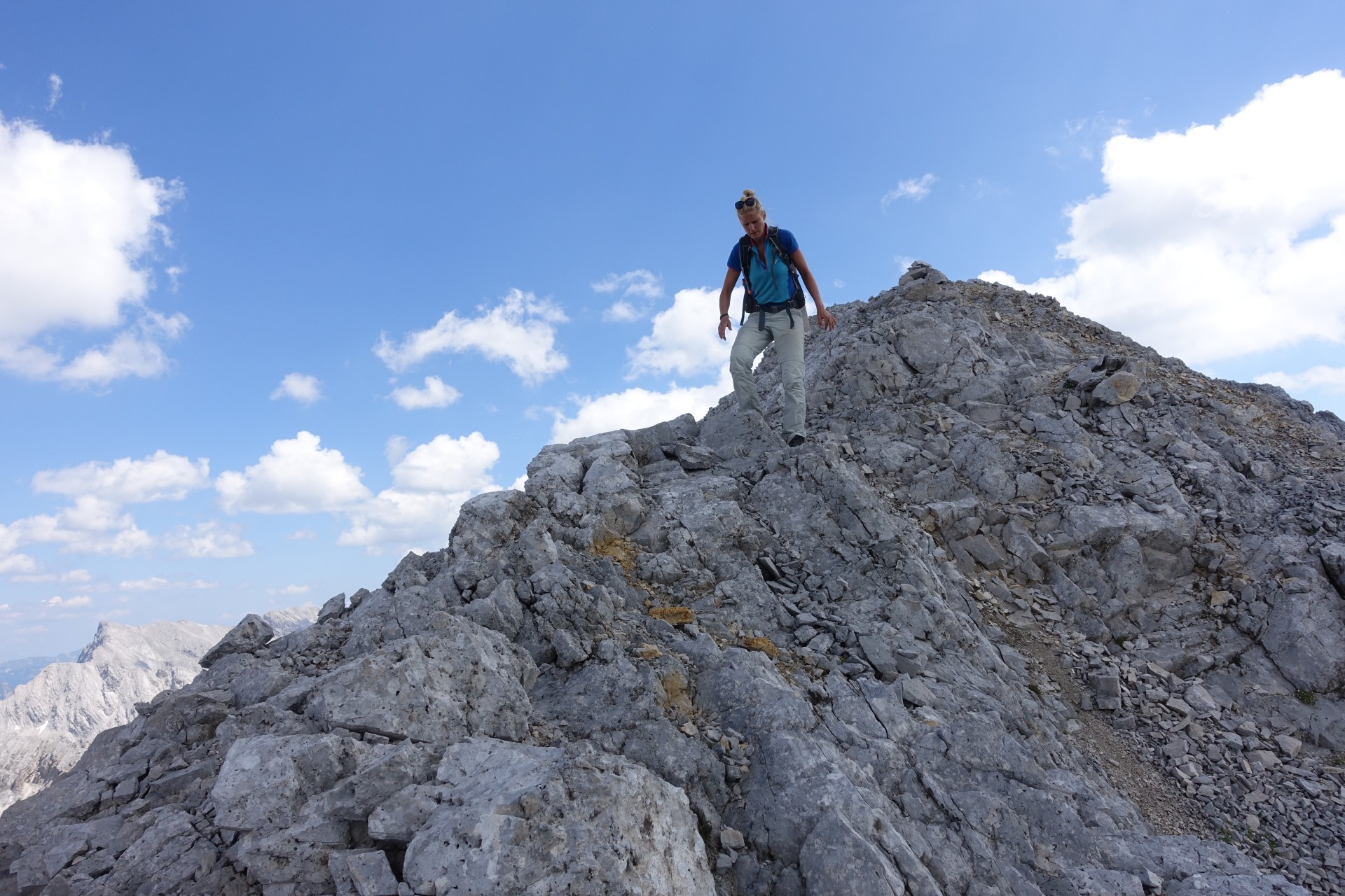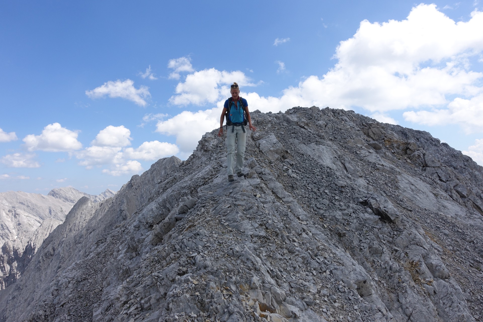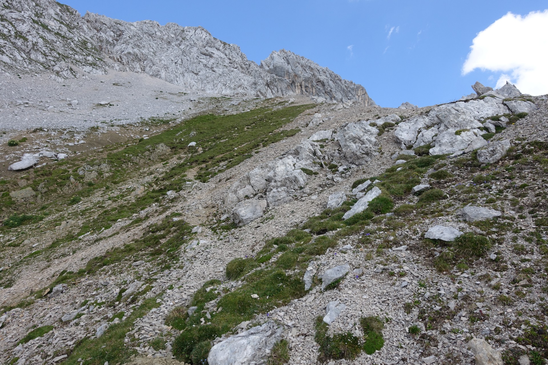 Über steile Wiesen und Geröll nun hinauf bis an den Fels. Im typischen Karwendelbruch bis auf den Grat. Auf diesem in leichter Kletterei bis zum unscheinbaren Gipfel mit Steinmann.