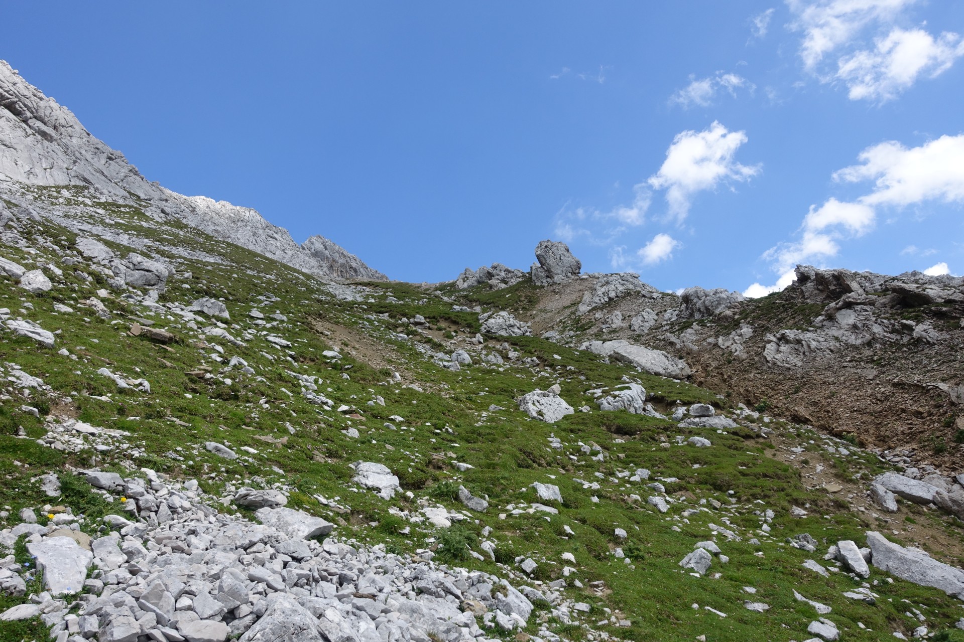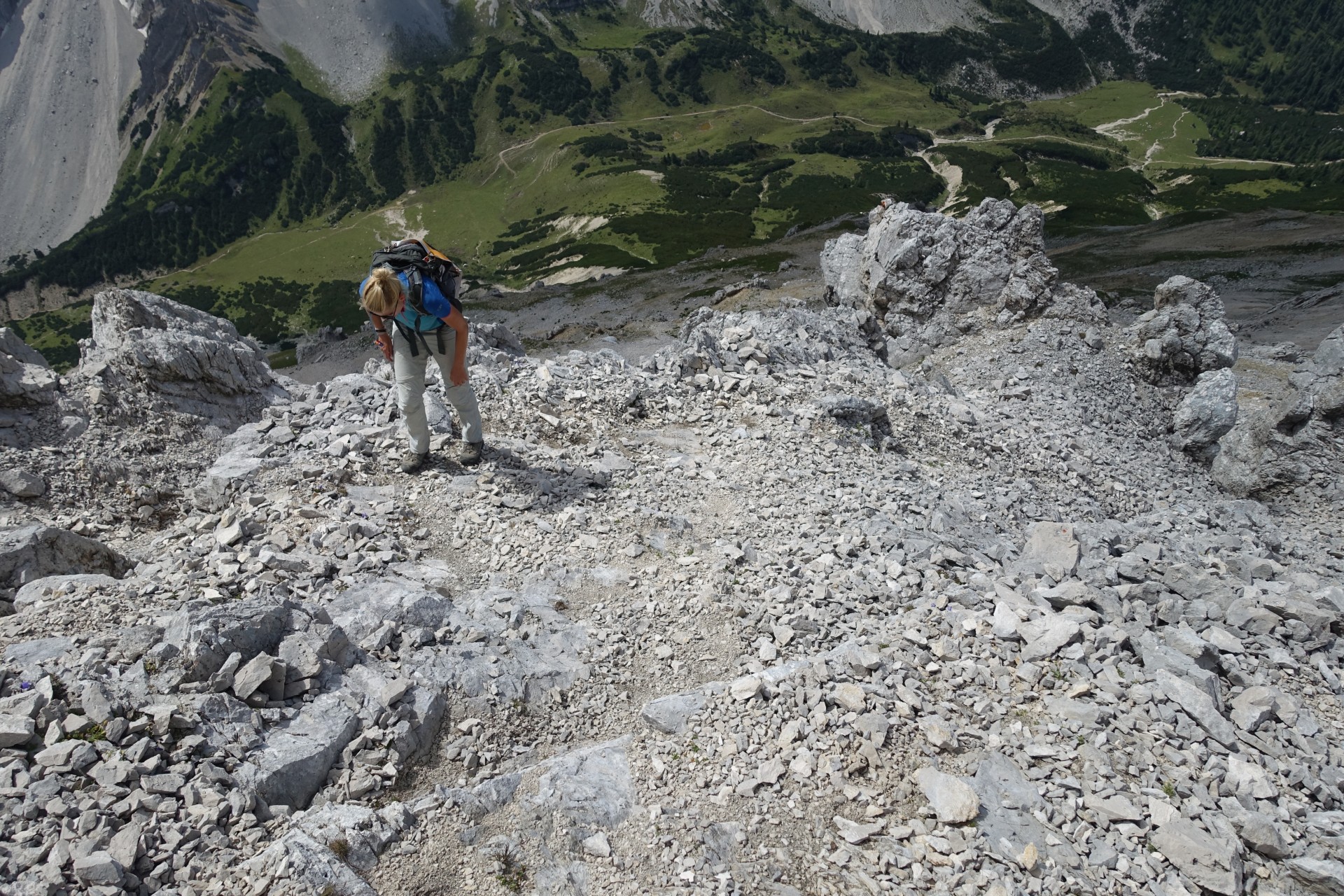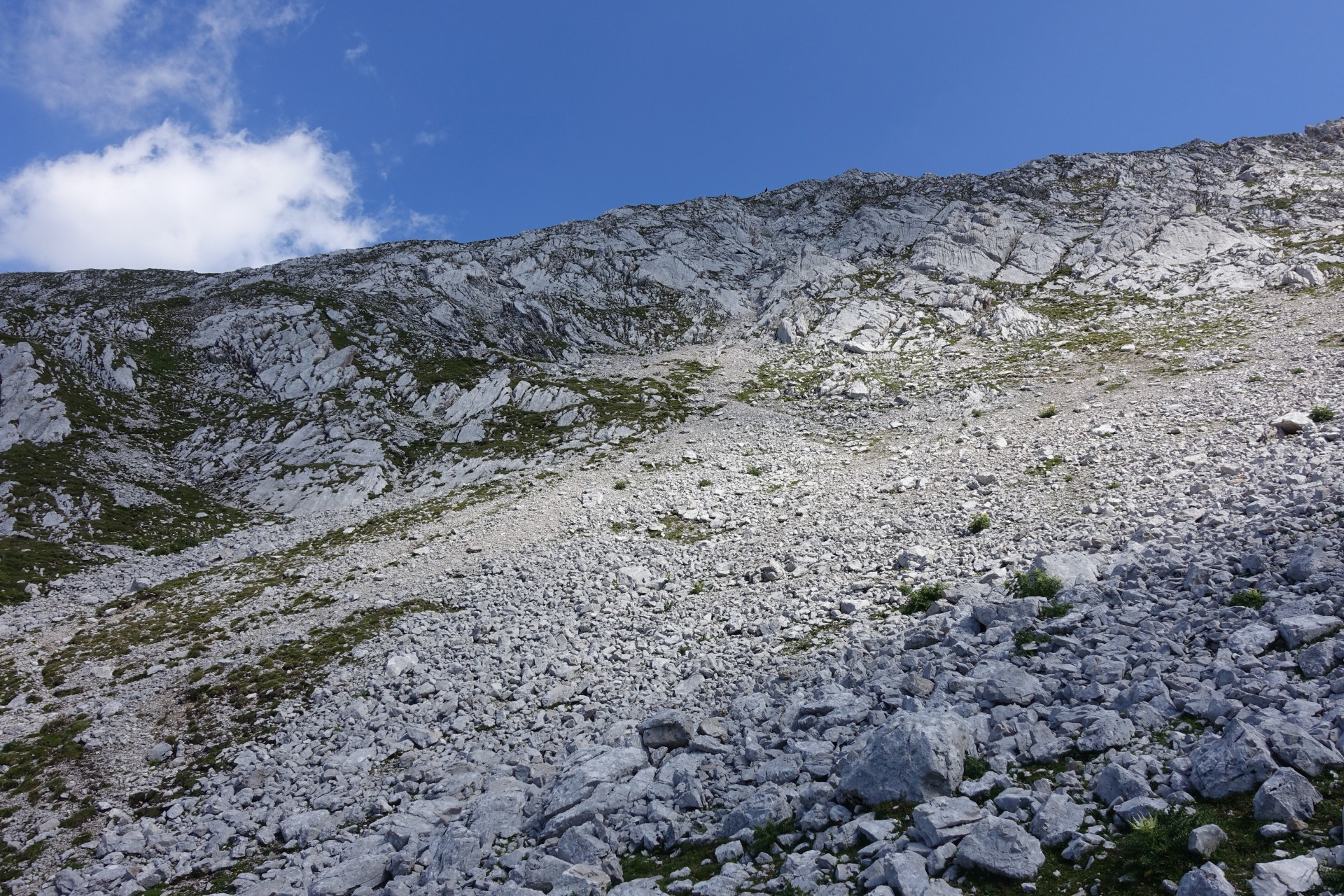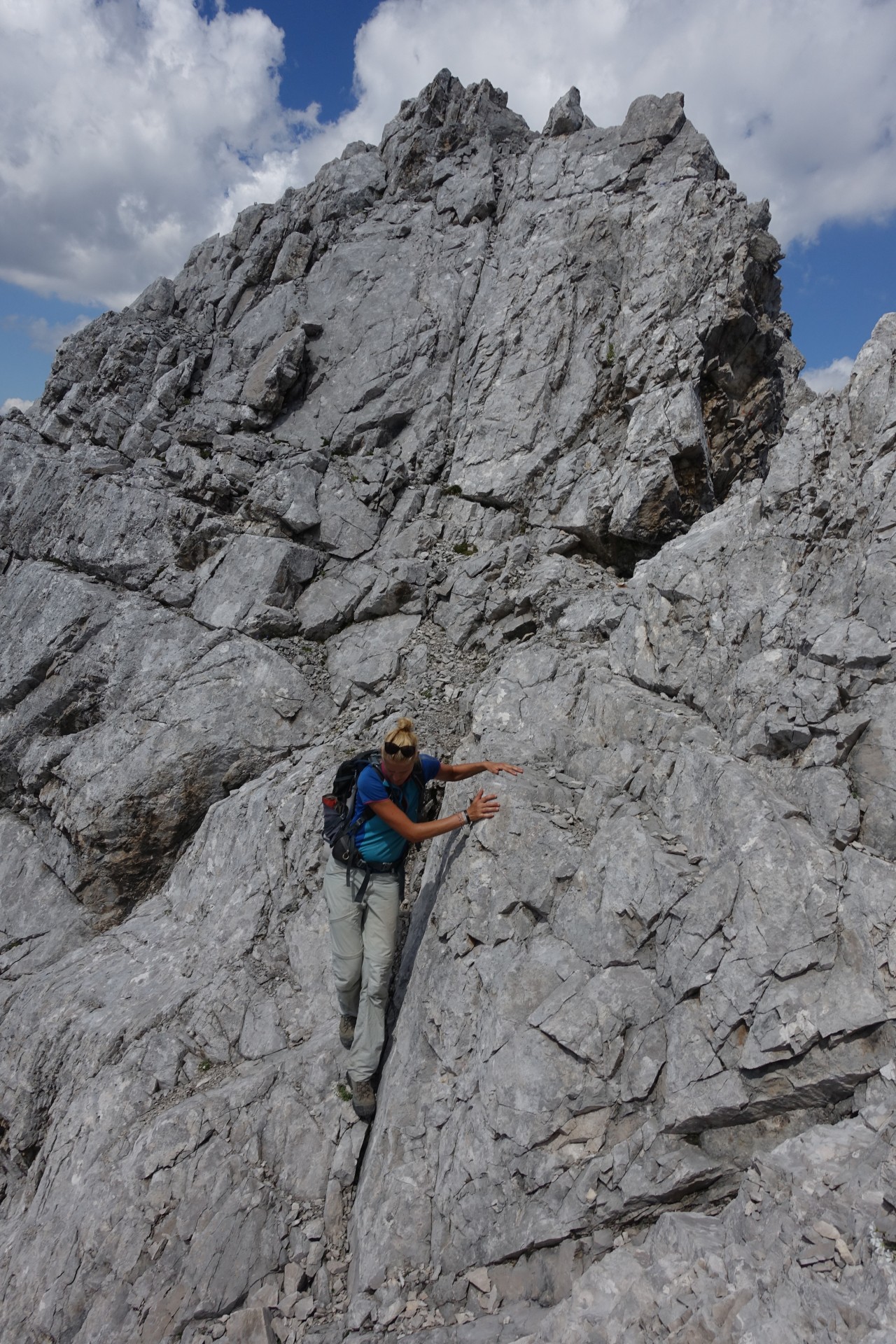 Über steile Wiesen und Geröll nun hinauf bis an den Fels. Im typischen Karwendelbruch bis auf den Grat. Auf diesem in leichter Kletterei bis zum unscheinbaren Gipfel mit Steinmann.
