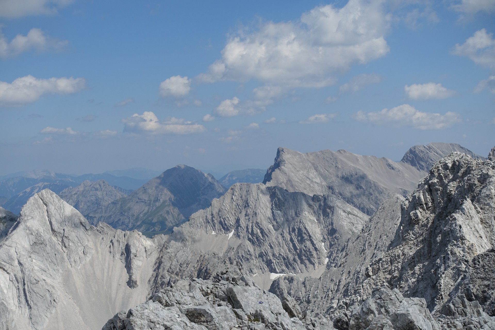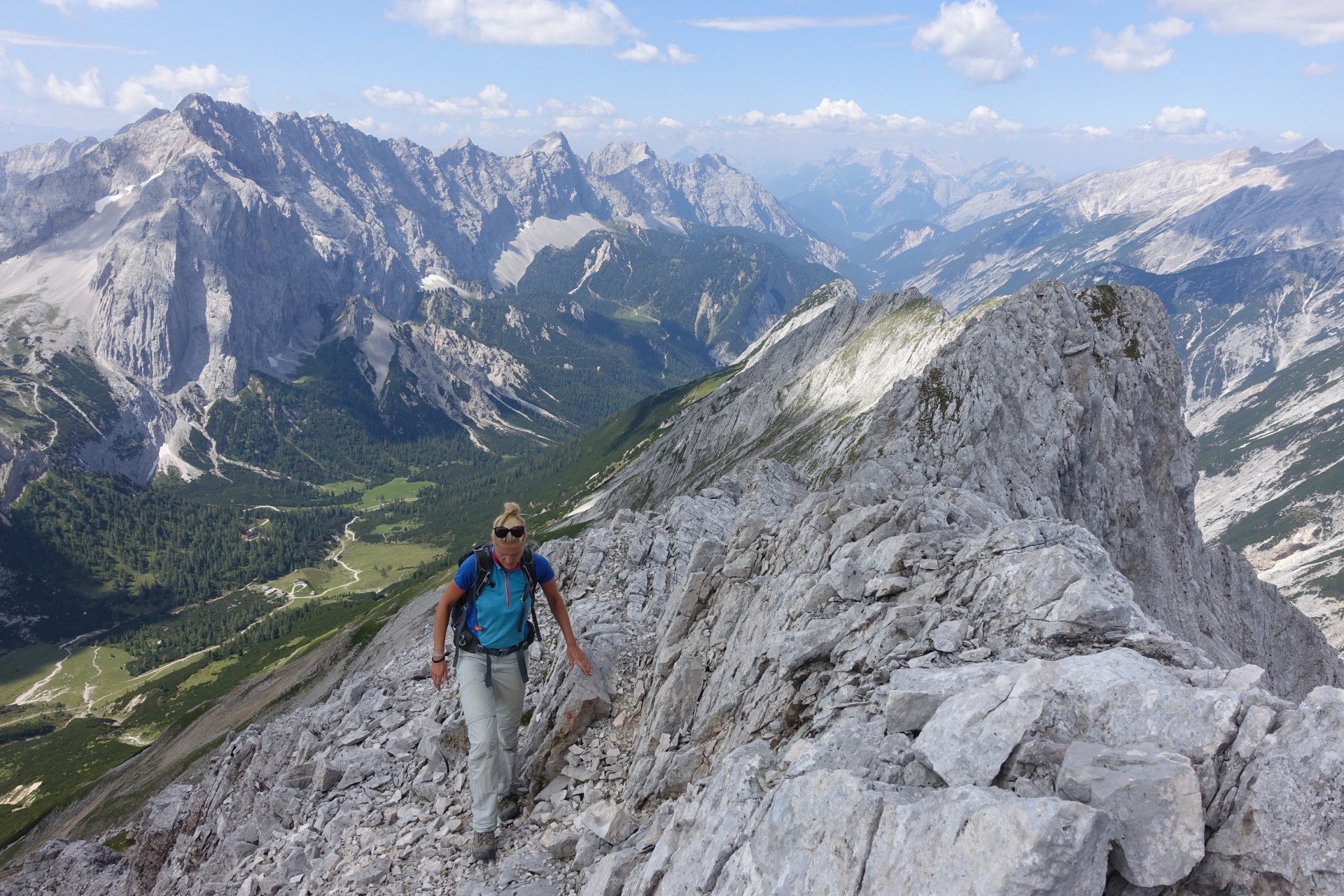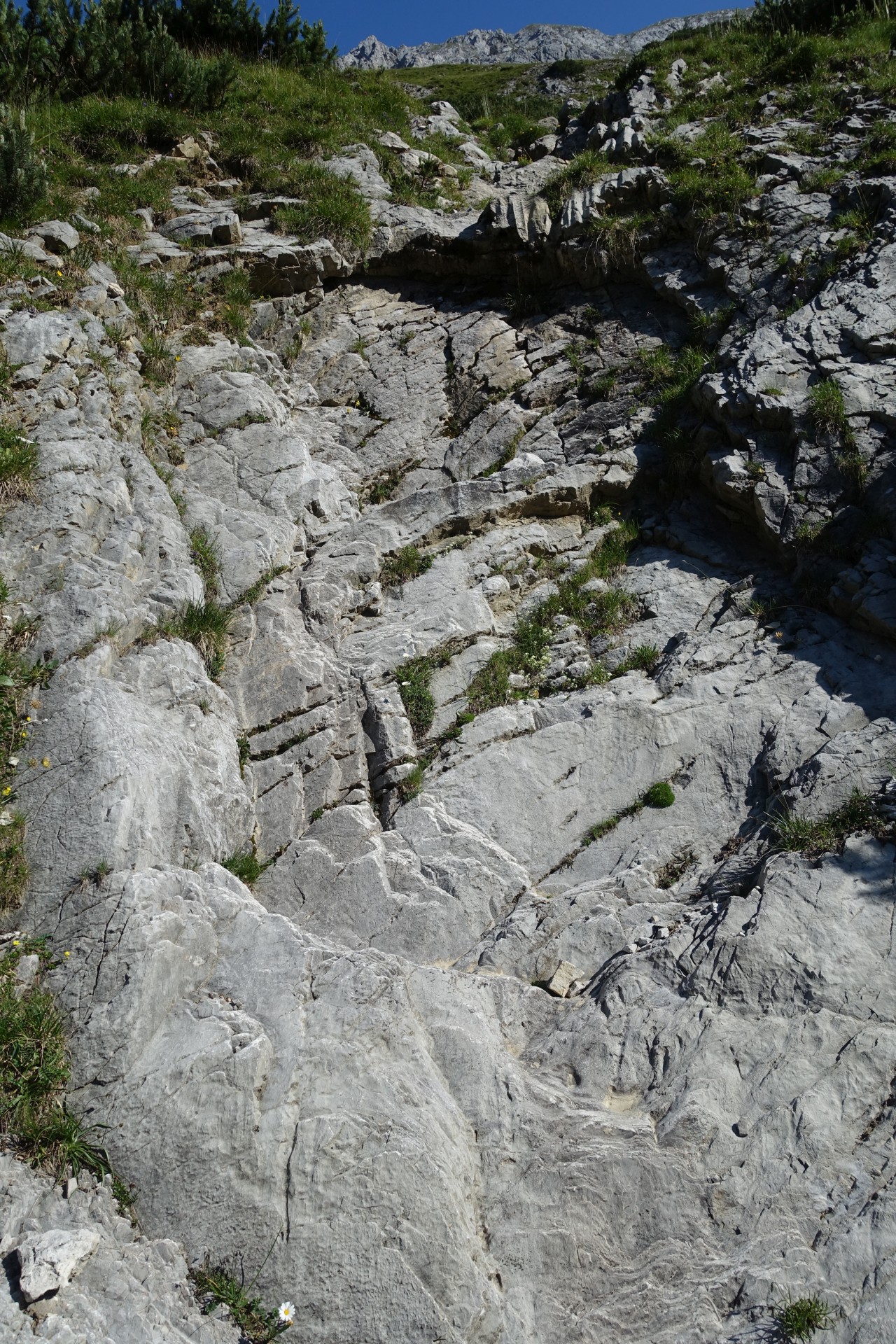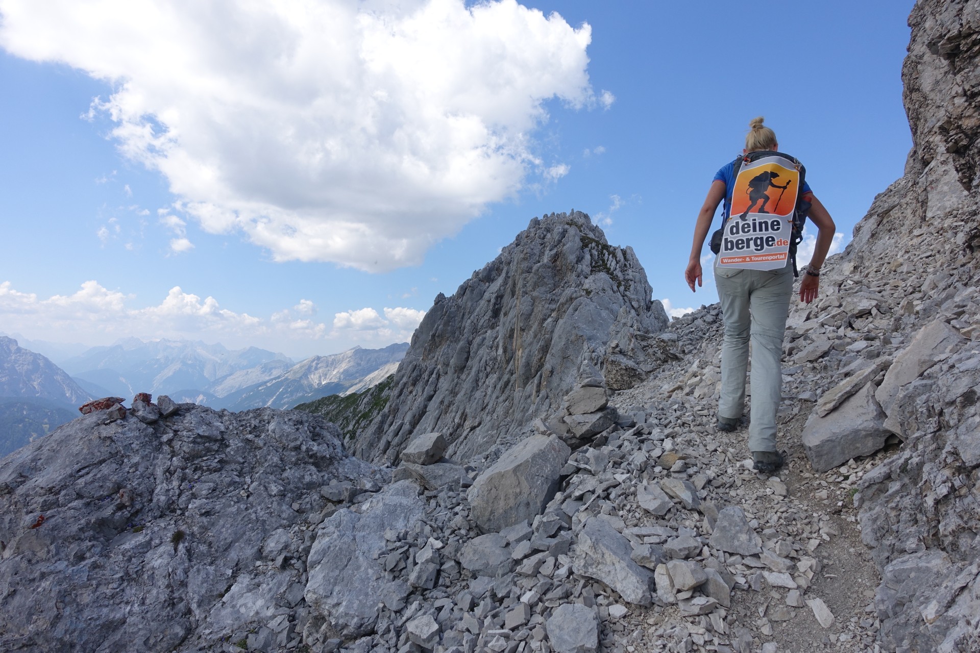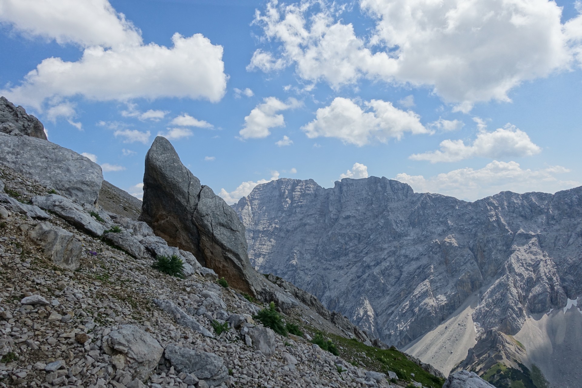 Über steile Wiesen und Geröll nun hinauf bis an den Fels. Im typischen Karwendelbruch bis auf den Grat. Auf diesem in leichter Kletterei bis zum unscheinbaren Gipfel mit Steinmann.