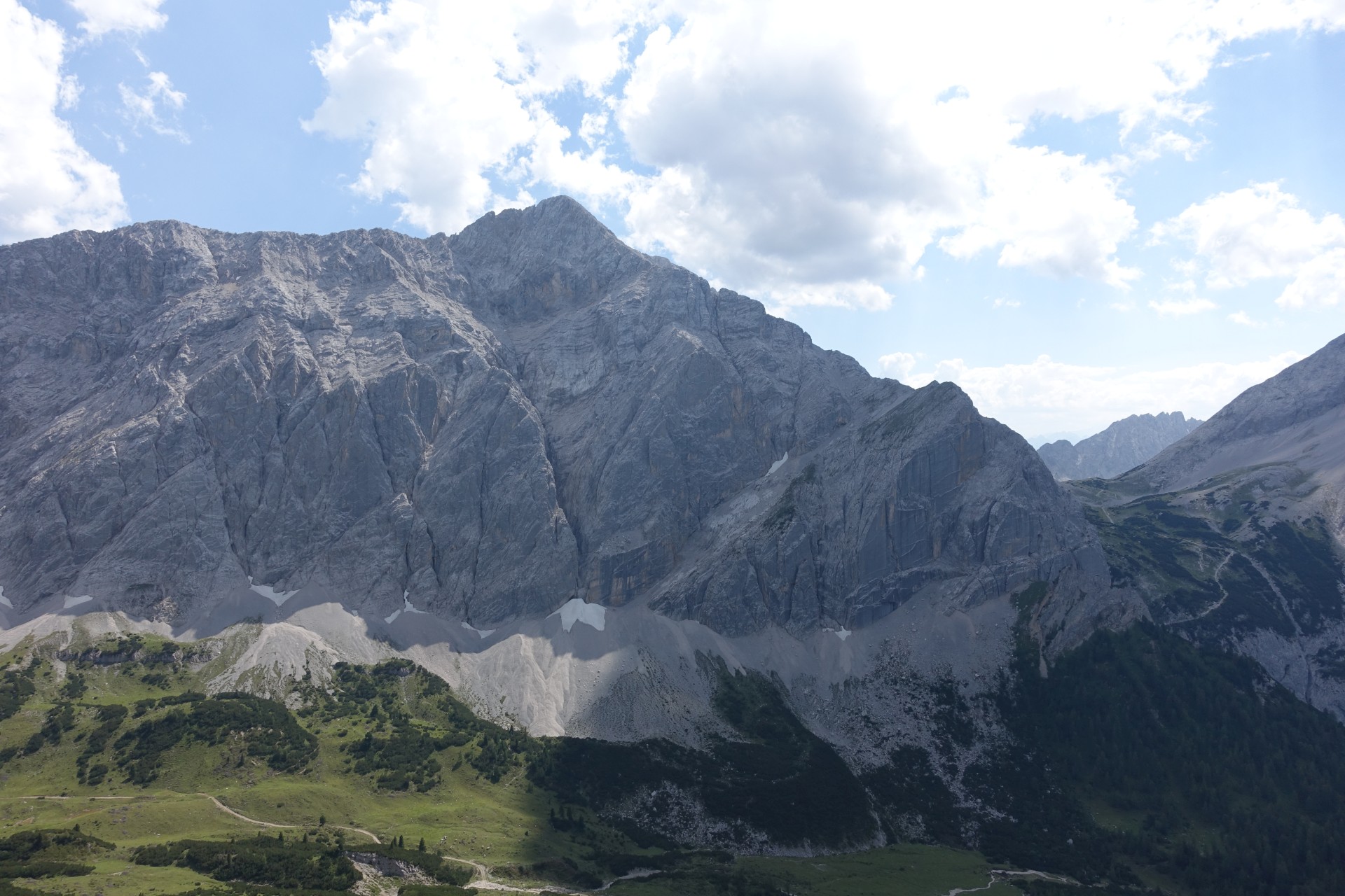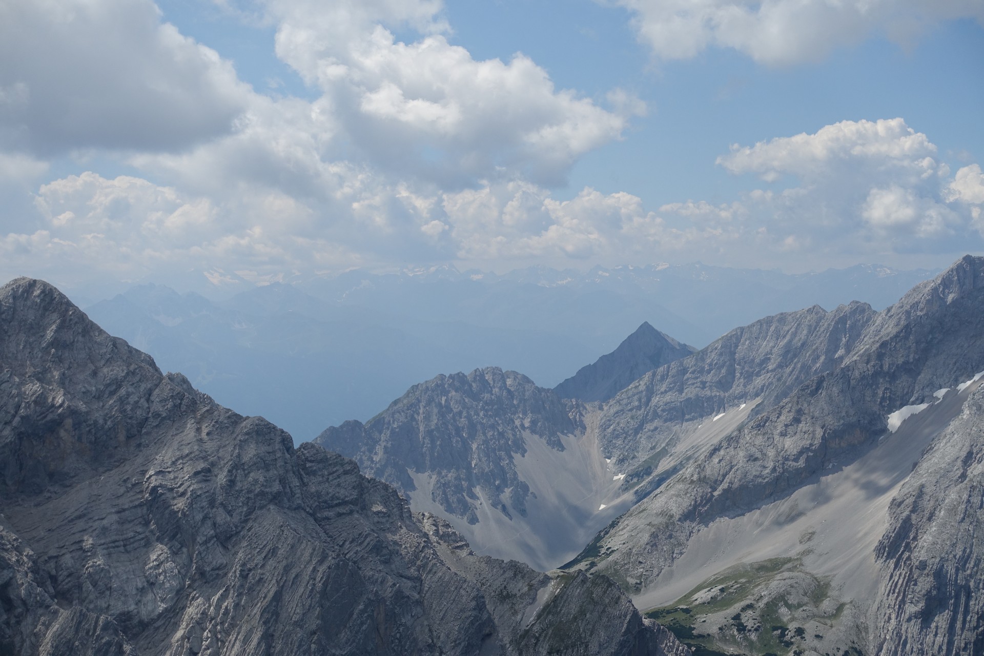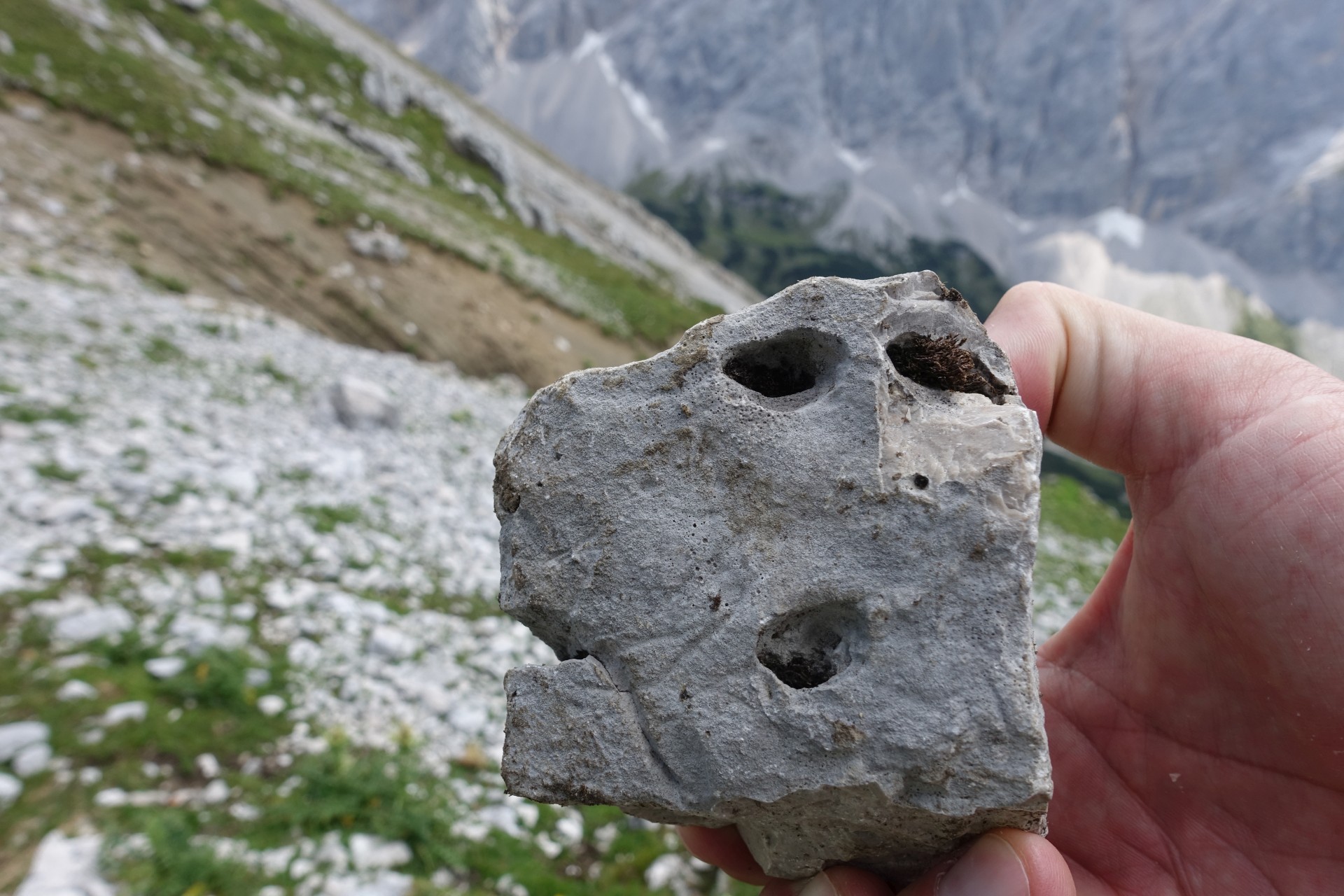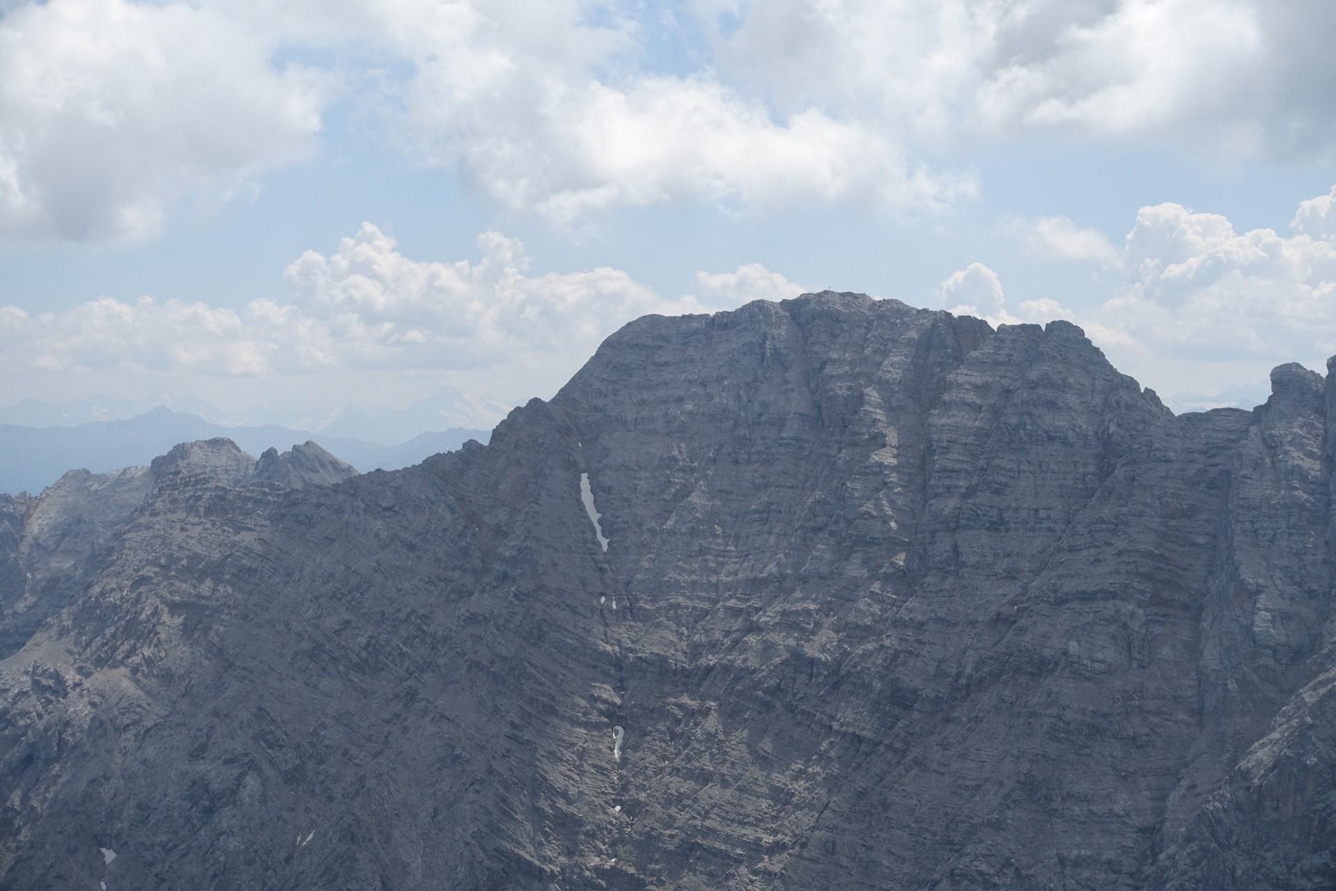 Über steile Wiesen und Geröll nun hinauf bis an den Fels. Im typischen Karwendelbruch bis auf den Grat. Auf diesem in leichter Kletterei bis zum unscheinbaren Gipfel mit Steinmann.