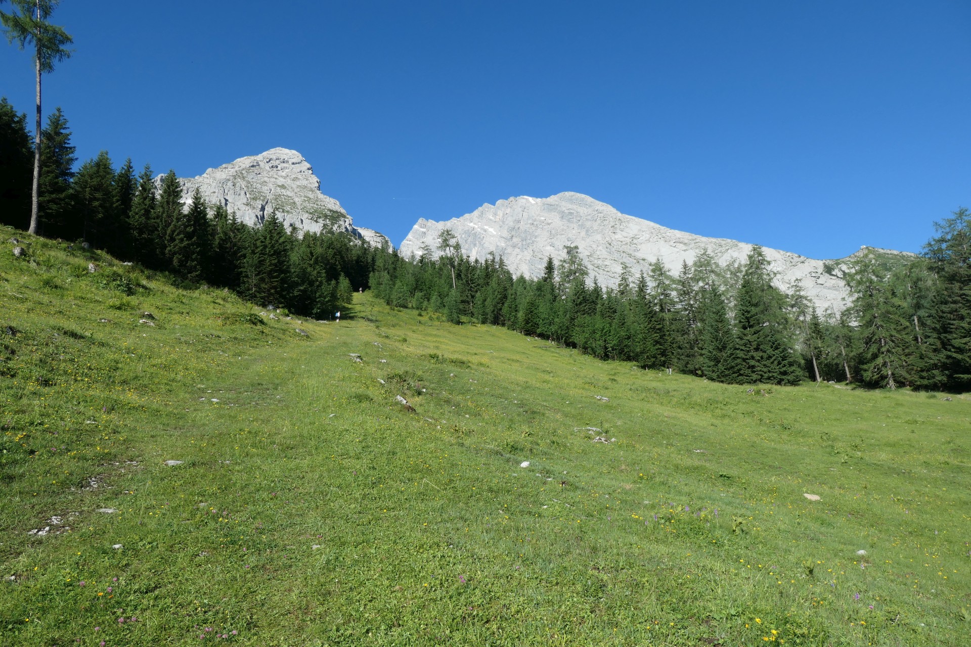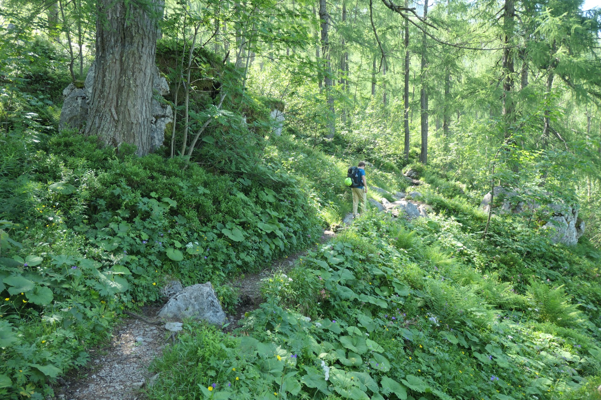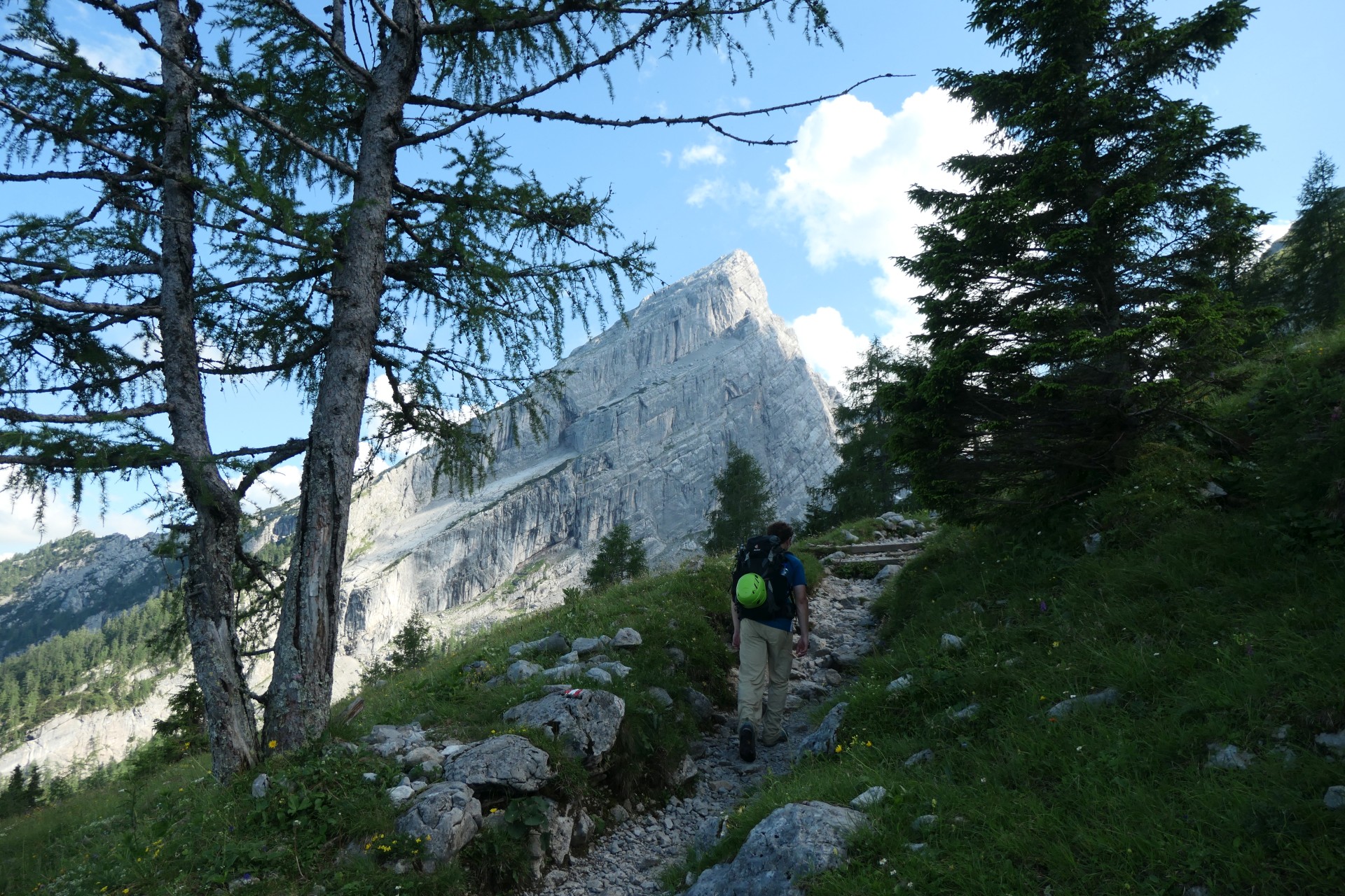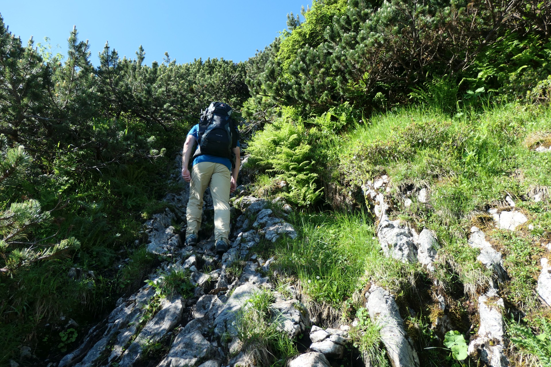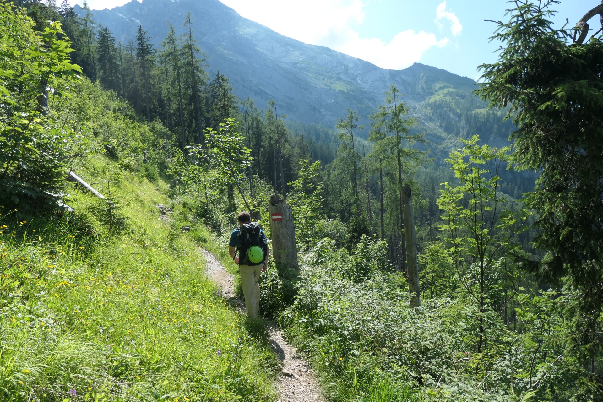 Wegen geplanter Watzmannüberschreitung nach Rast in Kühroint Aufstieg zum Watzmannhaus. Anfangs sehr idyllisch flach durch den Lärchenwald. Dann kurze Felspassage zur Falzalm und weiter über Falzsteig in Serpentinen hinauf zur Hütte.