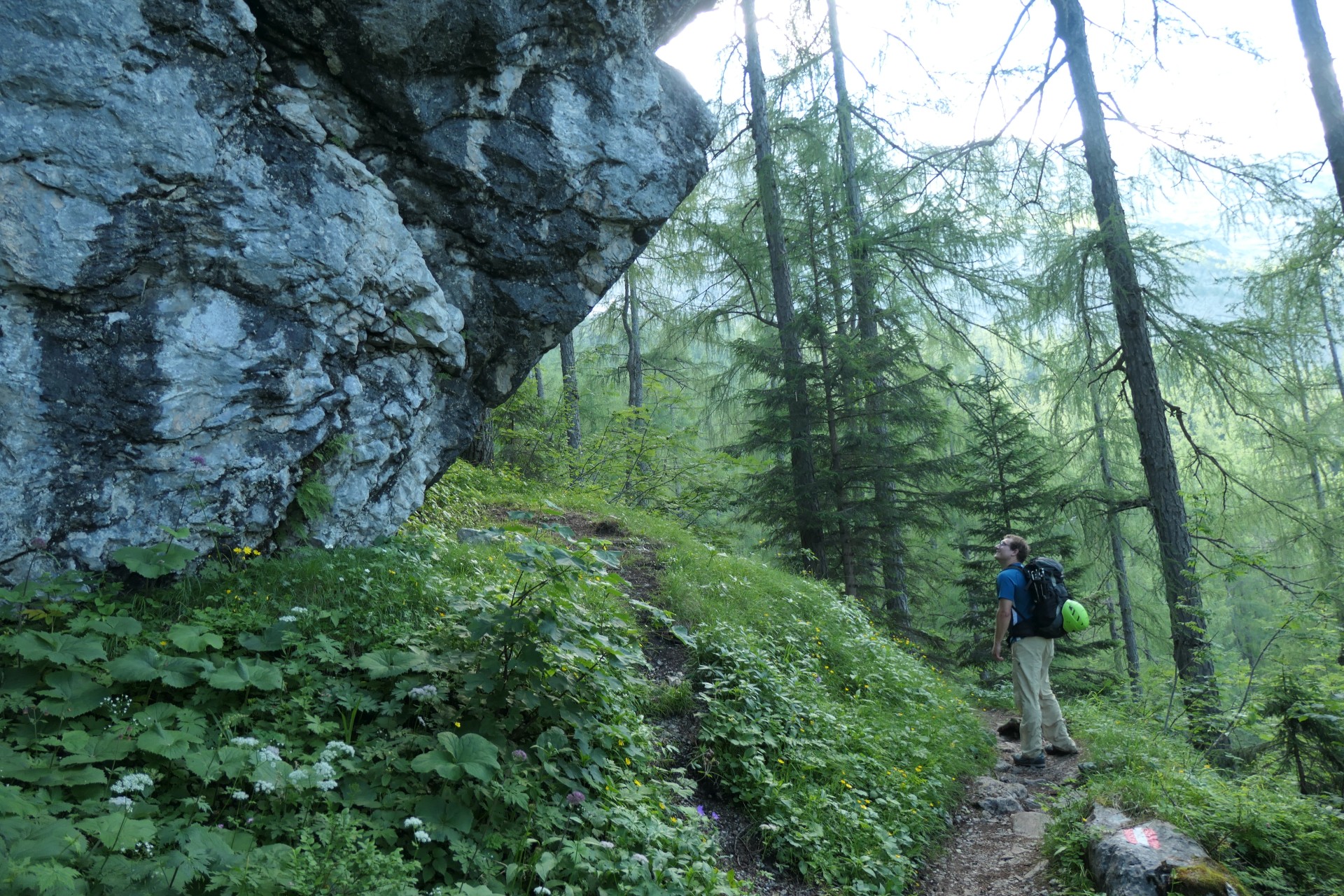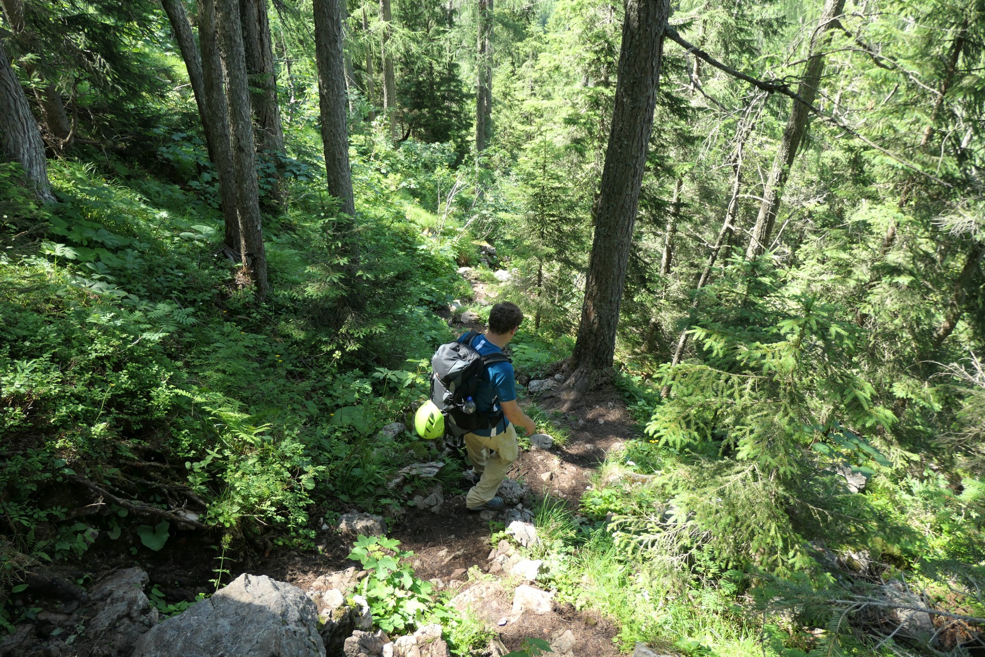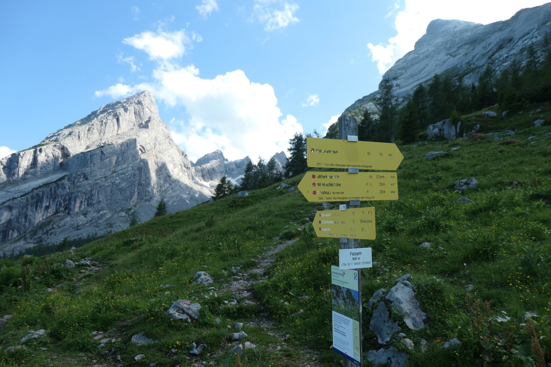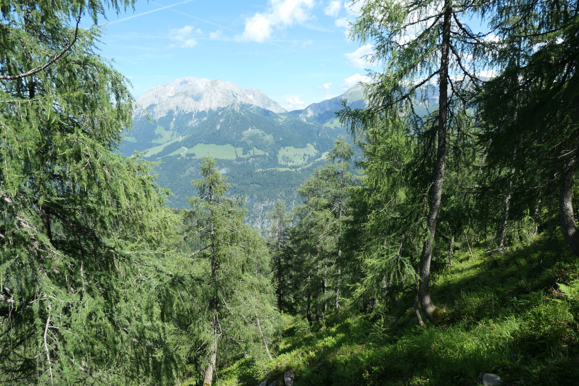 Wegen geplanter Watzmannüberschreitung nach Rast in Kühroint Aufstieg zum Watzmannhaus. Anfangs sehr idyllisch flach durch den Lärchenwald. Dann kurze Felspassage zur Falzalm und weiter über Falzsteig in Serpentinen hinauf zur Hütte.