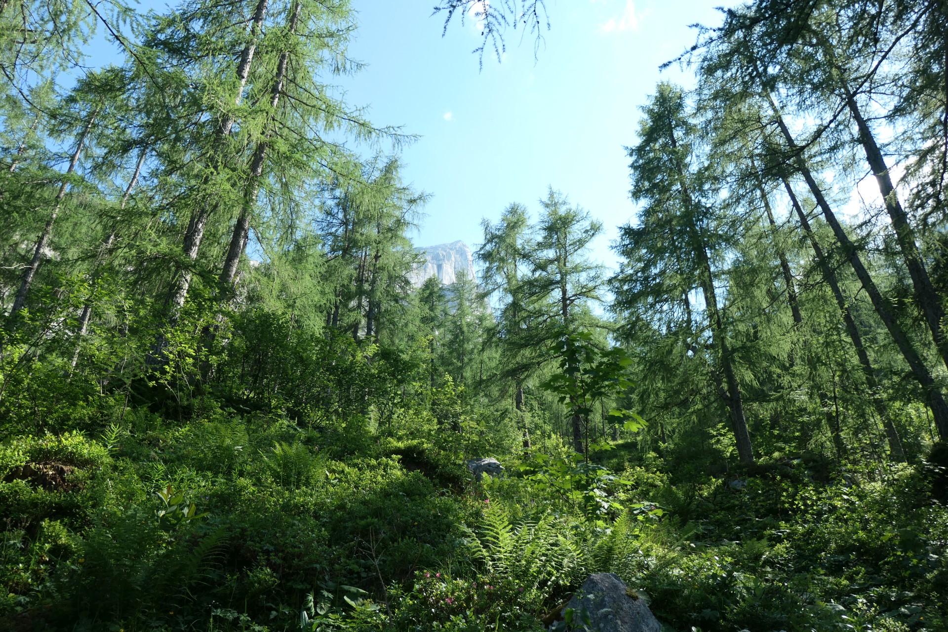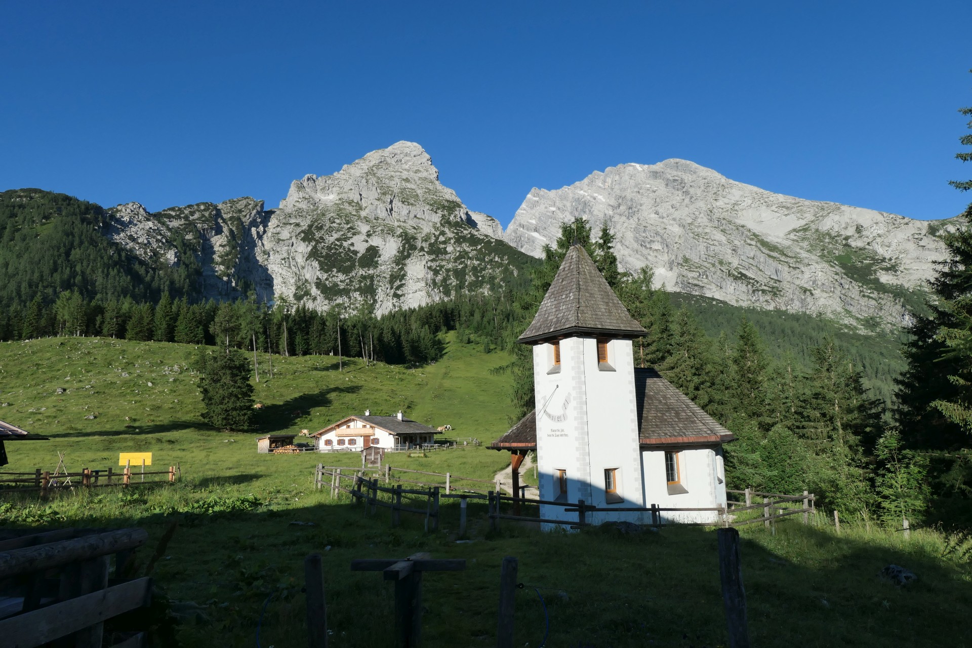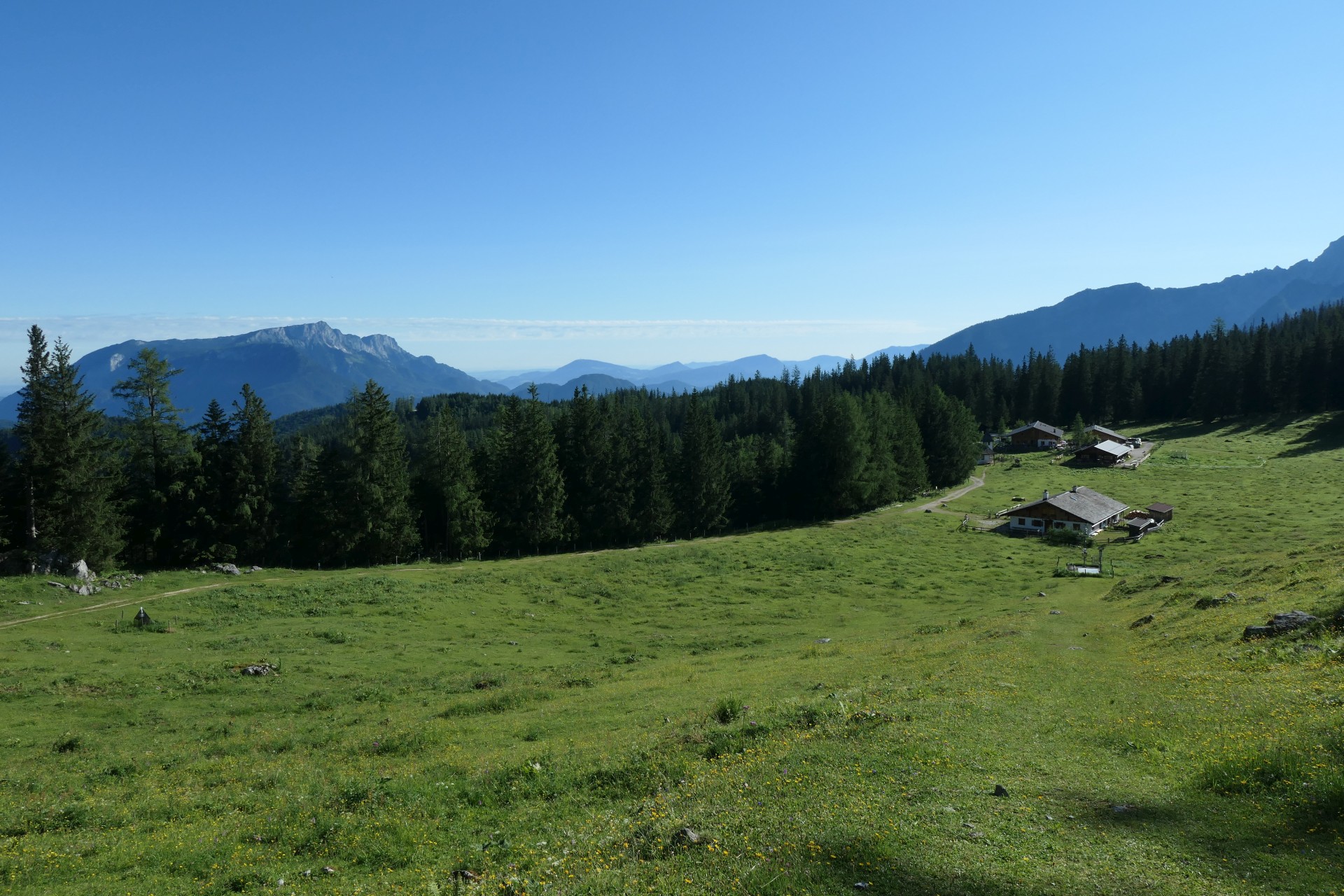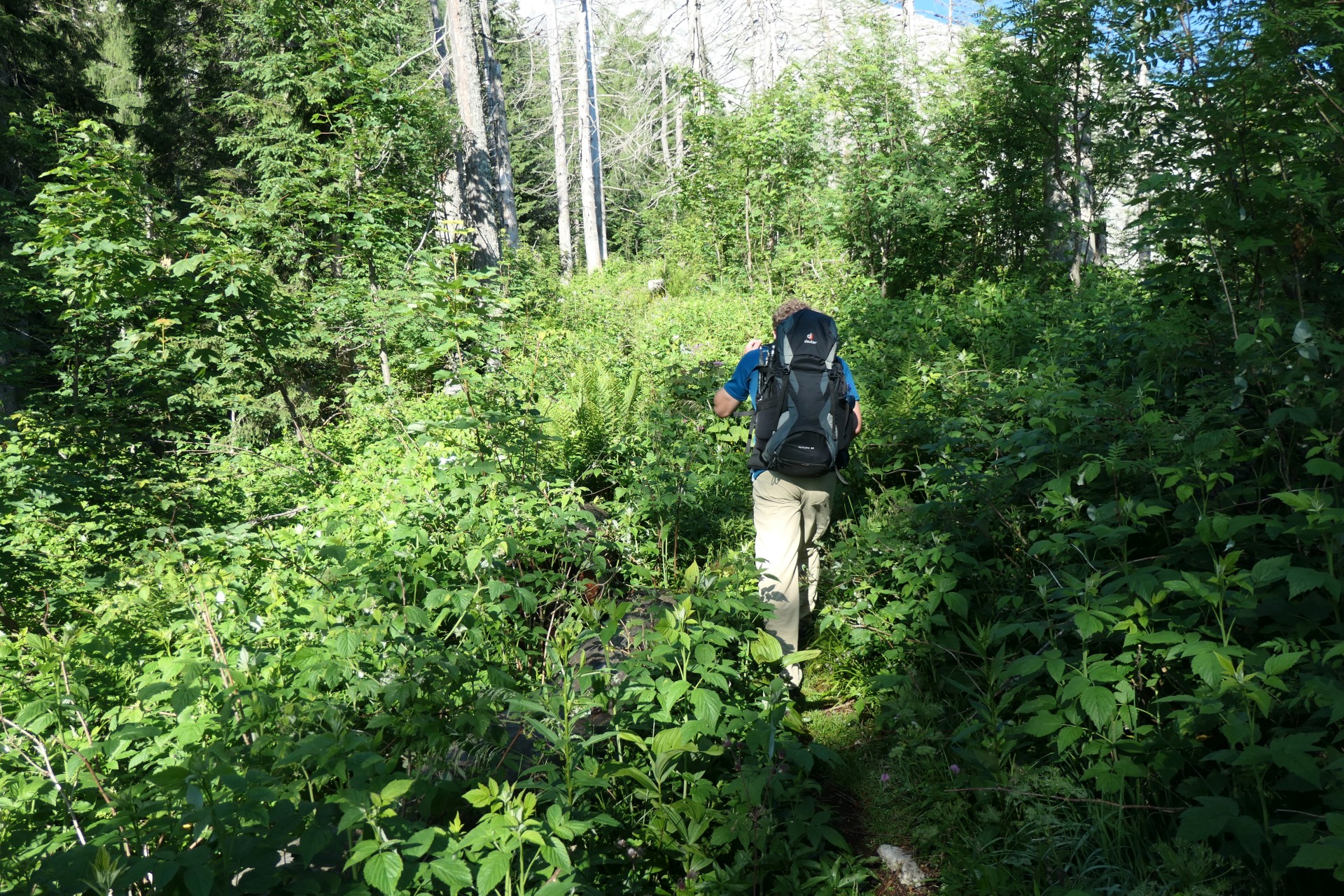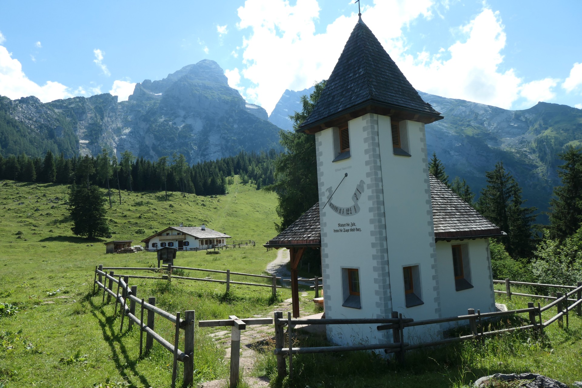 Wegen geplanter Watzmannüberschreitung nach Rast in Kühroint Aufstieg zum Watzmannhaus. Anfangs sehr idyllisch flach durch den Lärchenwald. Dann kurze Felspassage zur Falzalm und weiter über Falzsteig in Serpentinen hinauf zur Hütte.