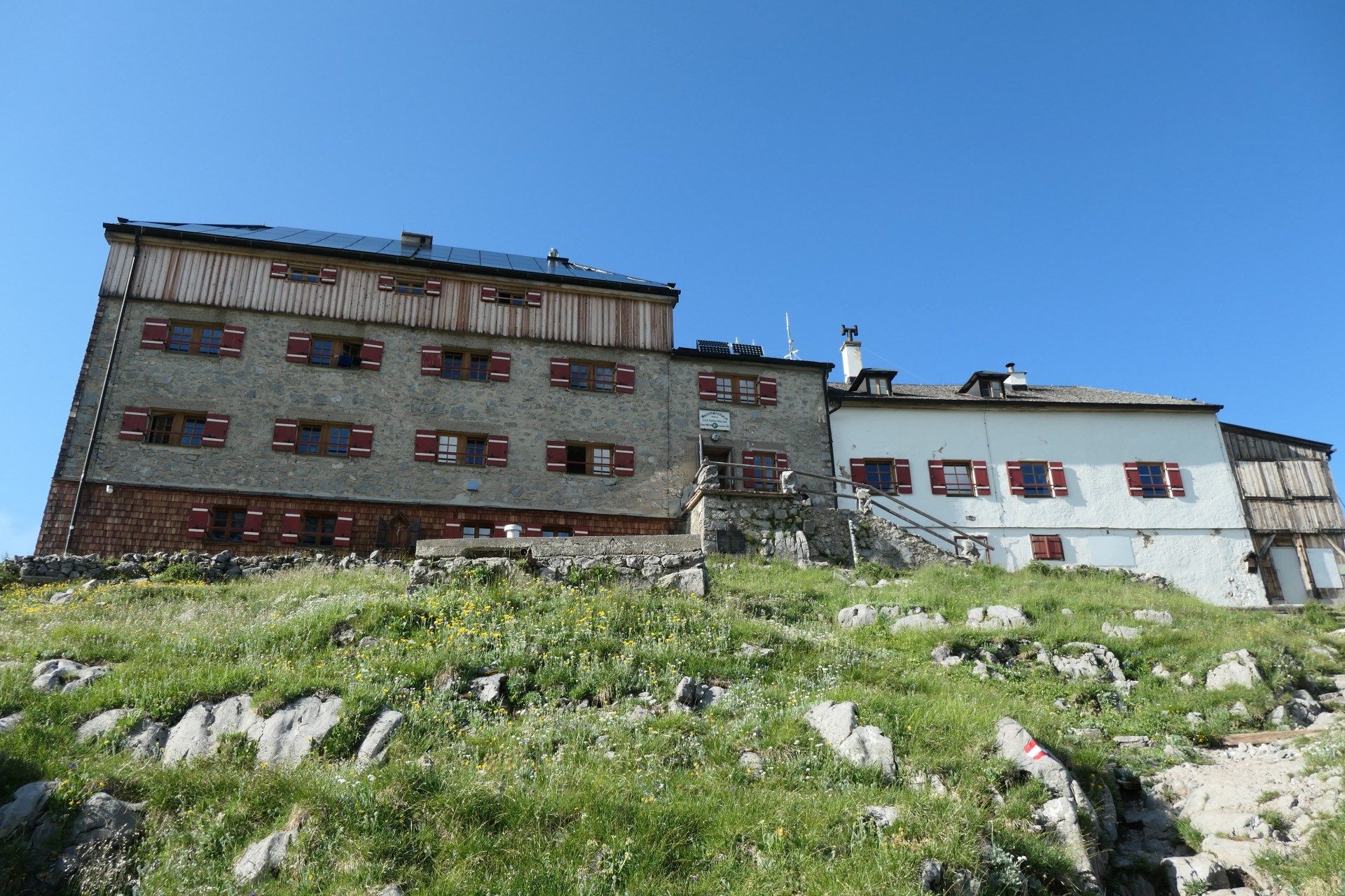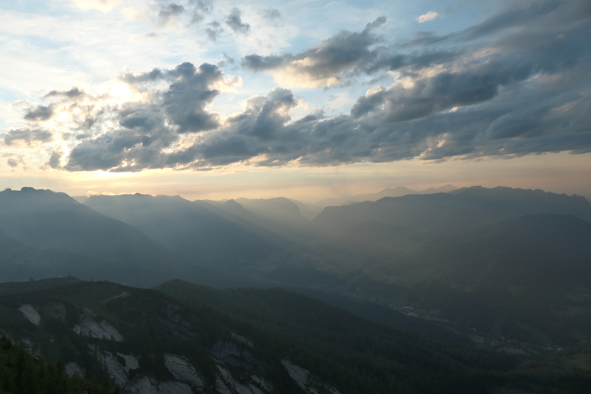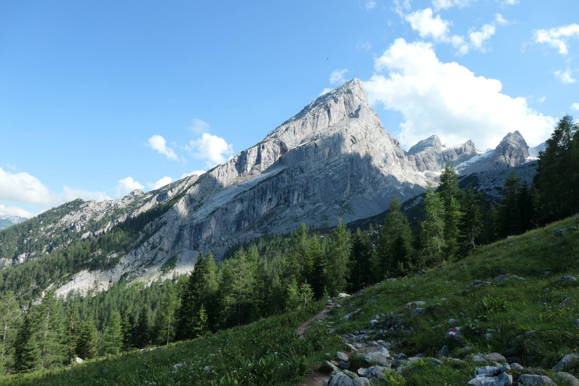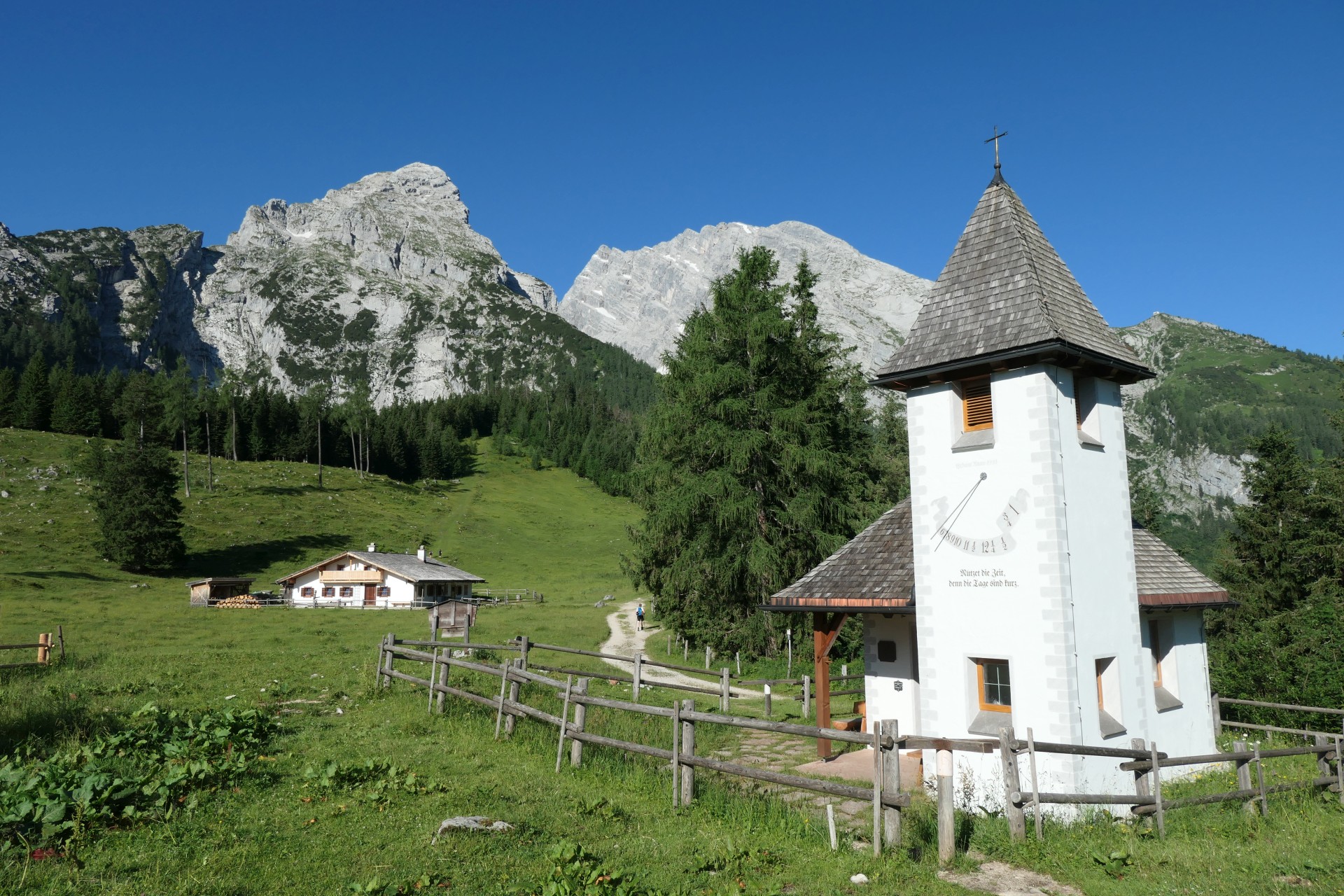 Wegen geplanter Watzmannüberschreitung nach Rast in Kühroint Aufstieg zum Watzmannhaus. Anfangs sehr idyllisch flach durch den Lärchenwald. Dann kurze Felspassage zur Falzalm und weiter über Falzsteig in Serpentinen hinauf zur Hütte.