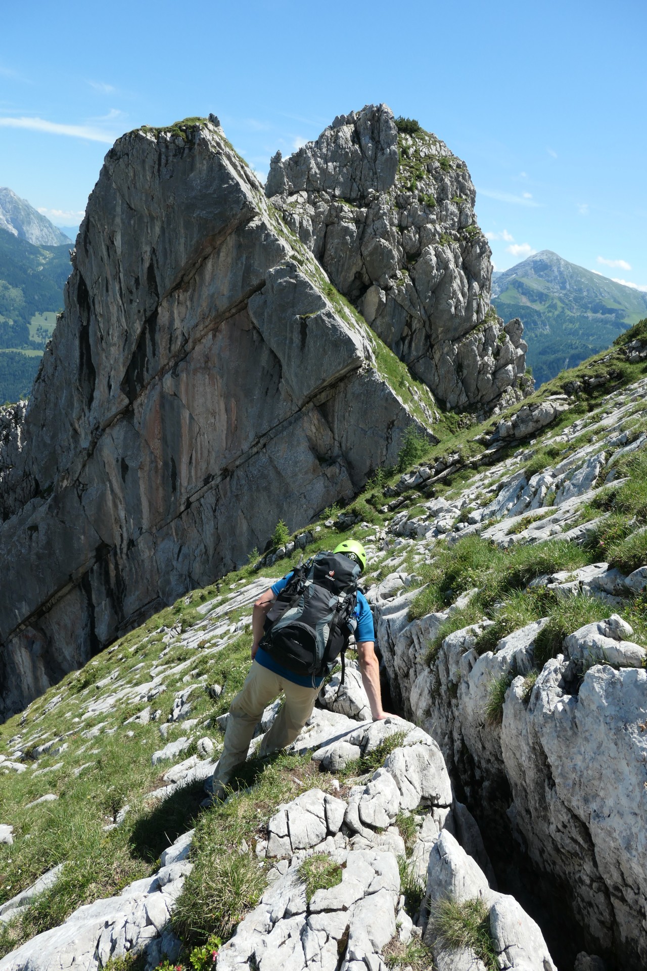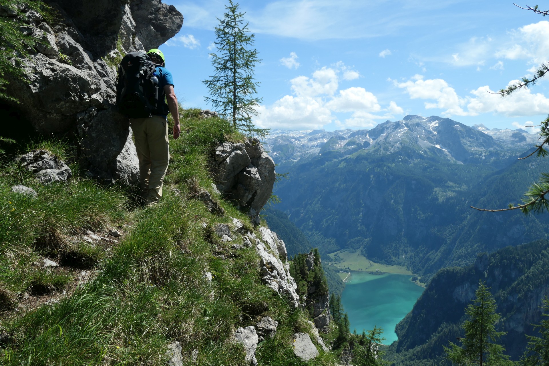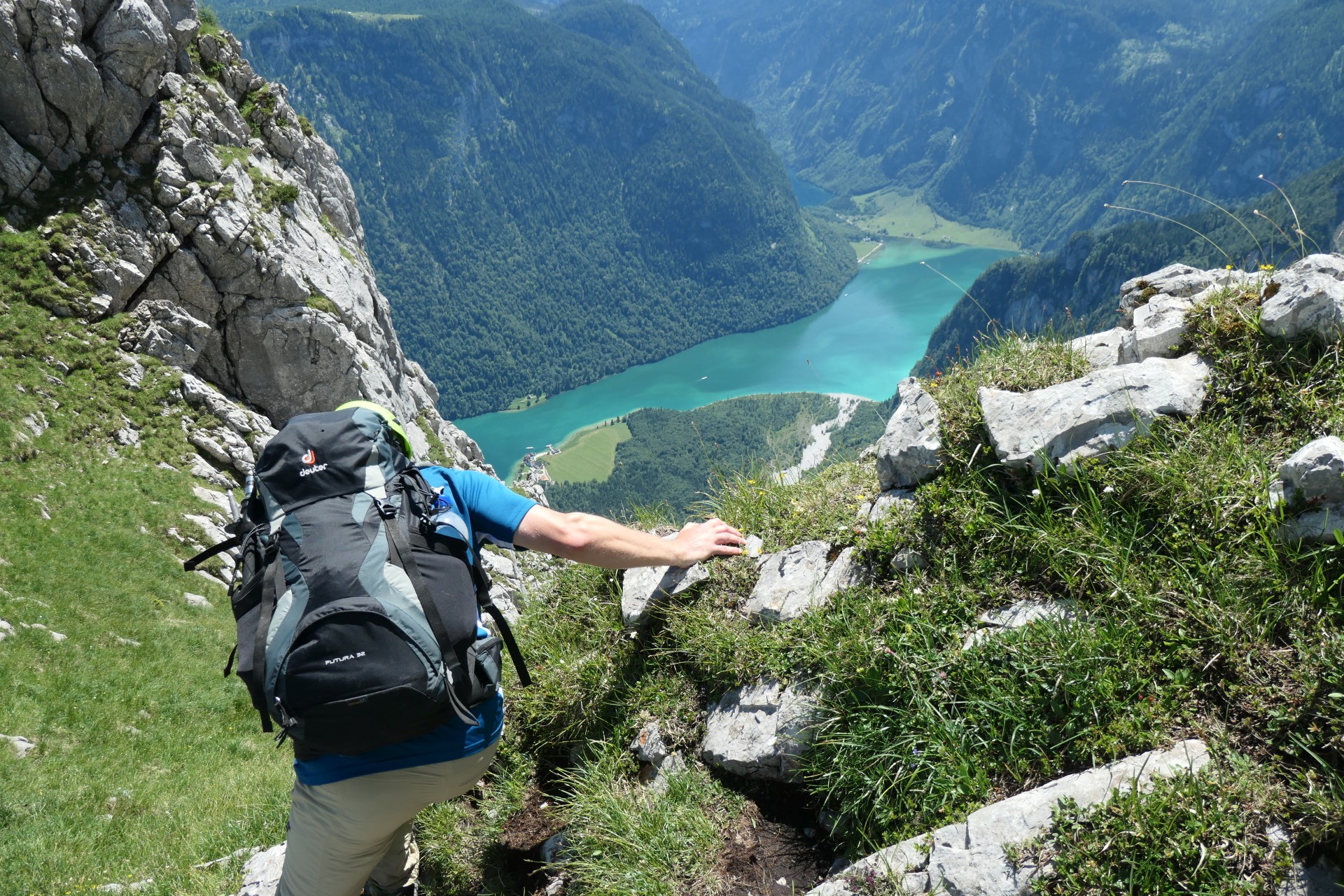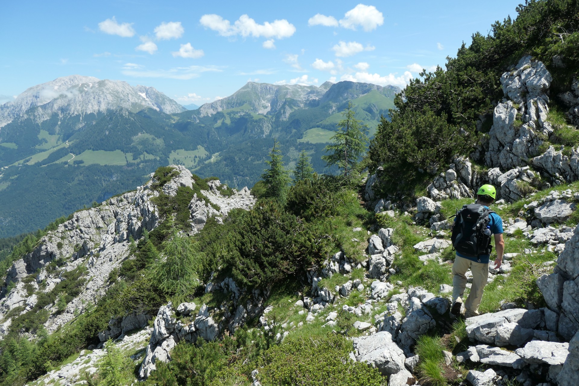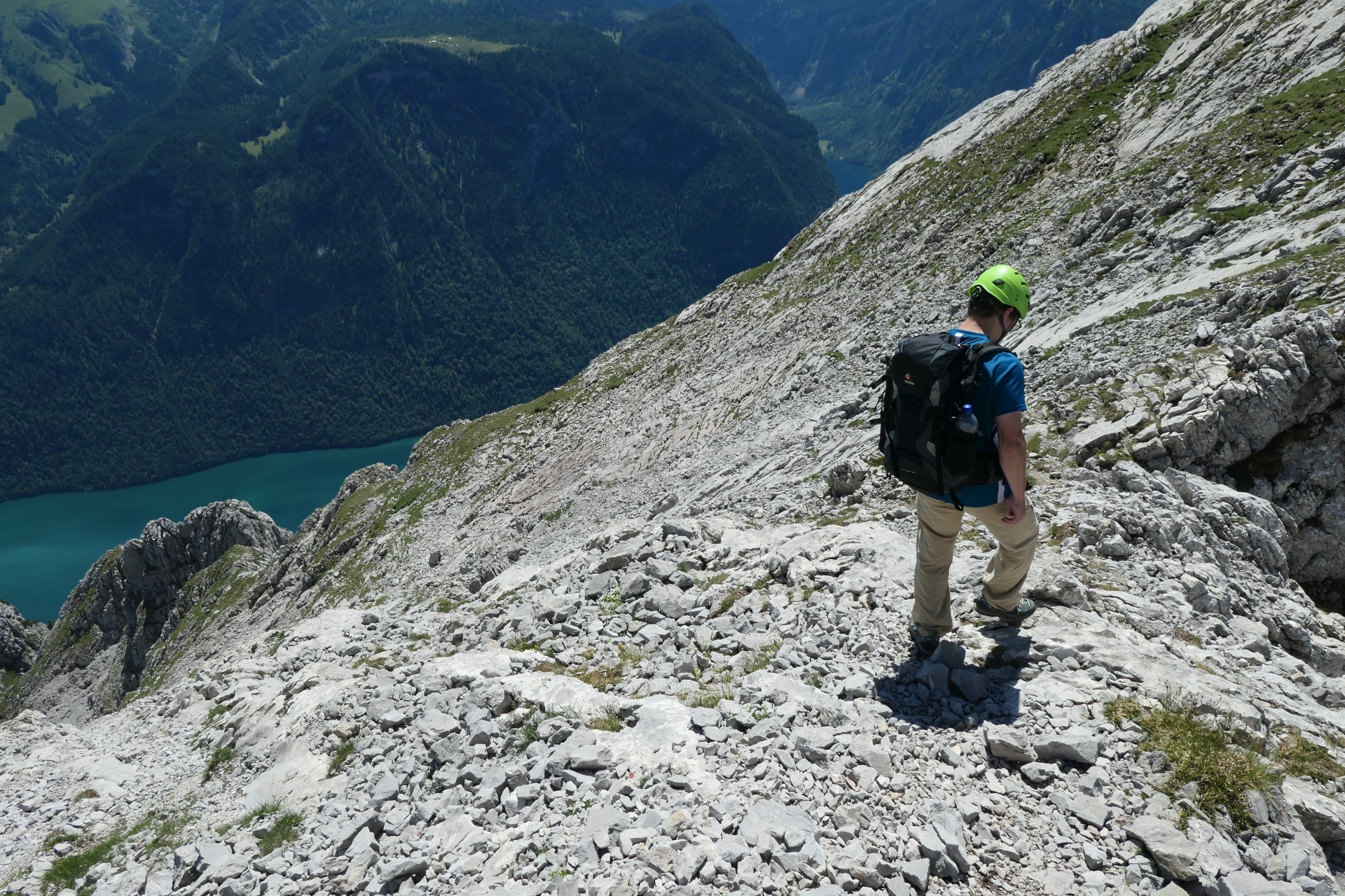 Abstieg über die steile Ostflanke mit zahlreichen Steinmännchen markiert und gut zu finden. Einige leichte Klettereien. Kurz vor dem Fensterl steile Graspassage. Bei Nässe sicher heikel. Nach dem Fensterl mit Tiefblick auf Königssee spannend bergab einigen Türmen ausweichend. Teils extrem rutschig und steil. Zuletzt schmal und eng hinauf zum Mooslahner.