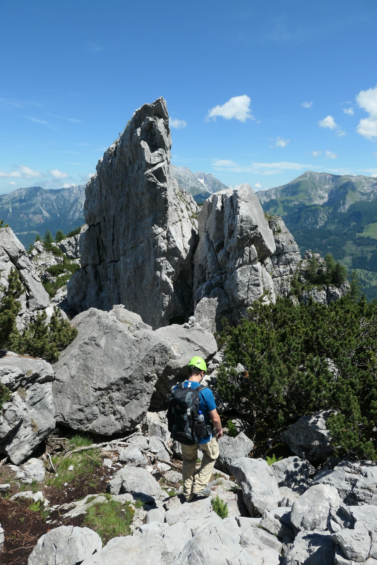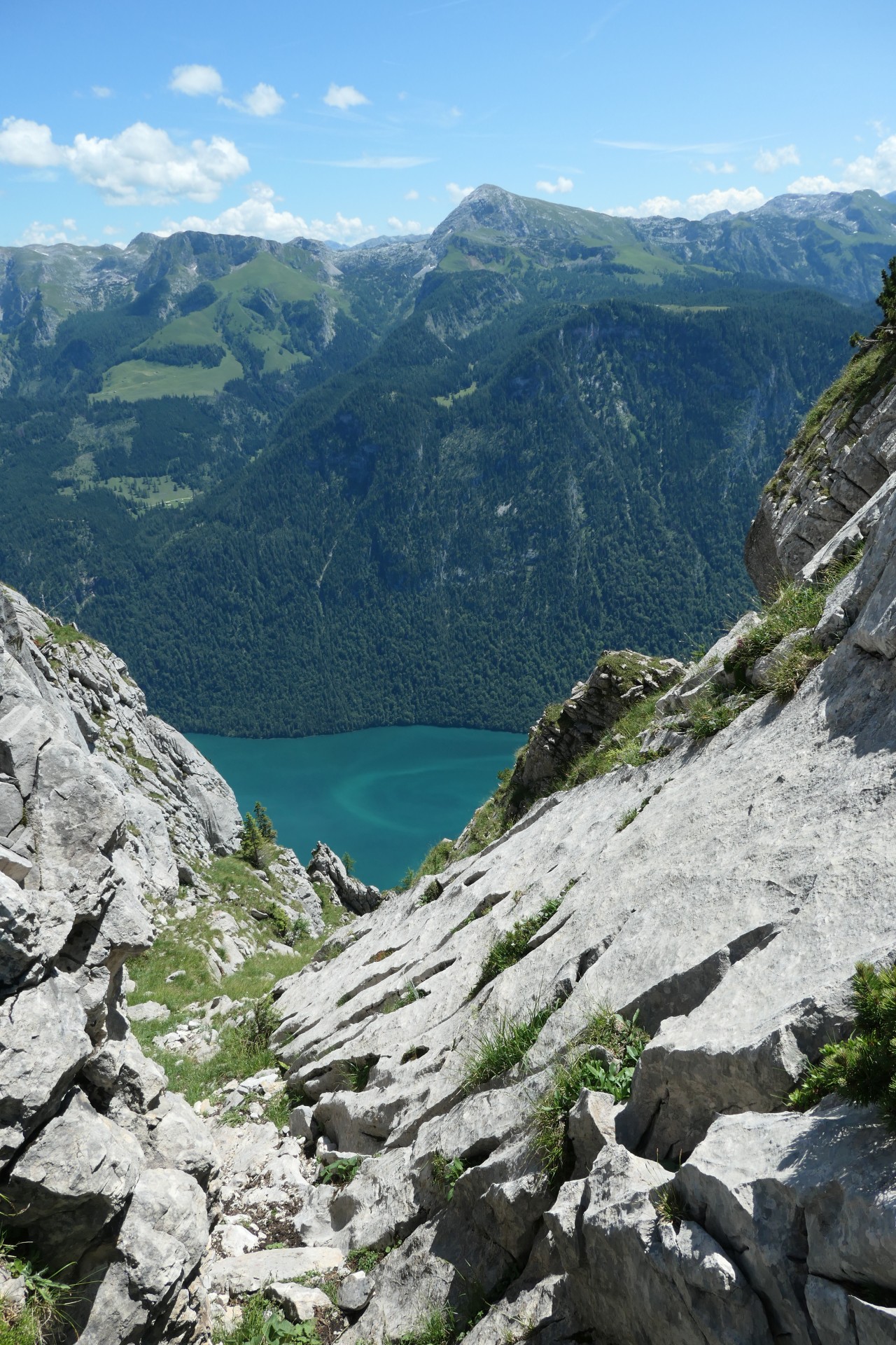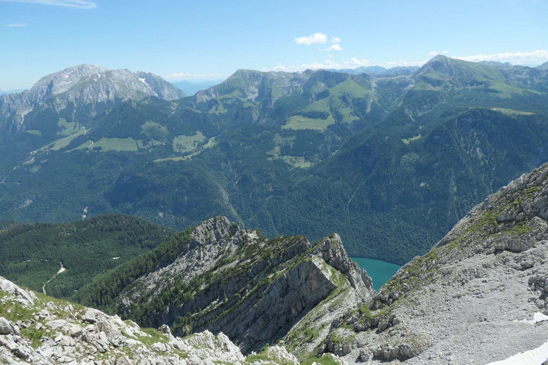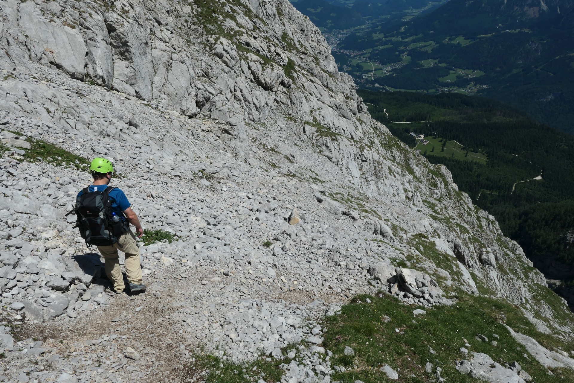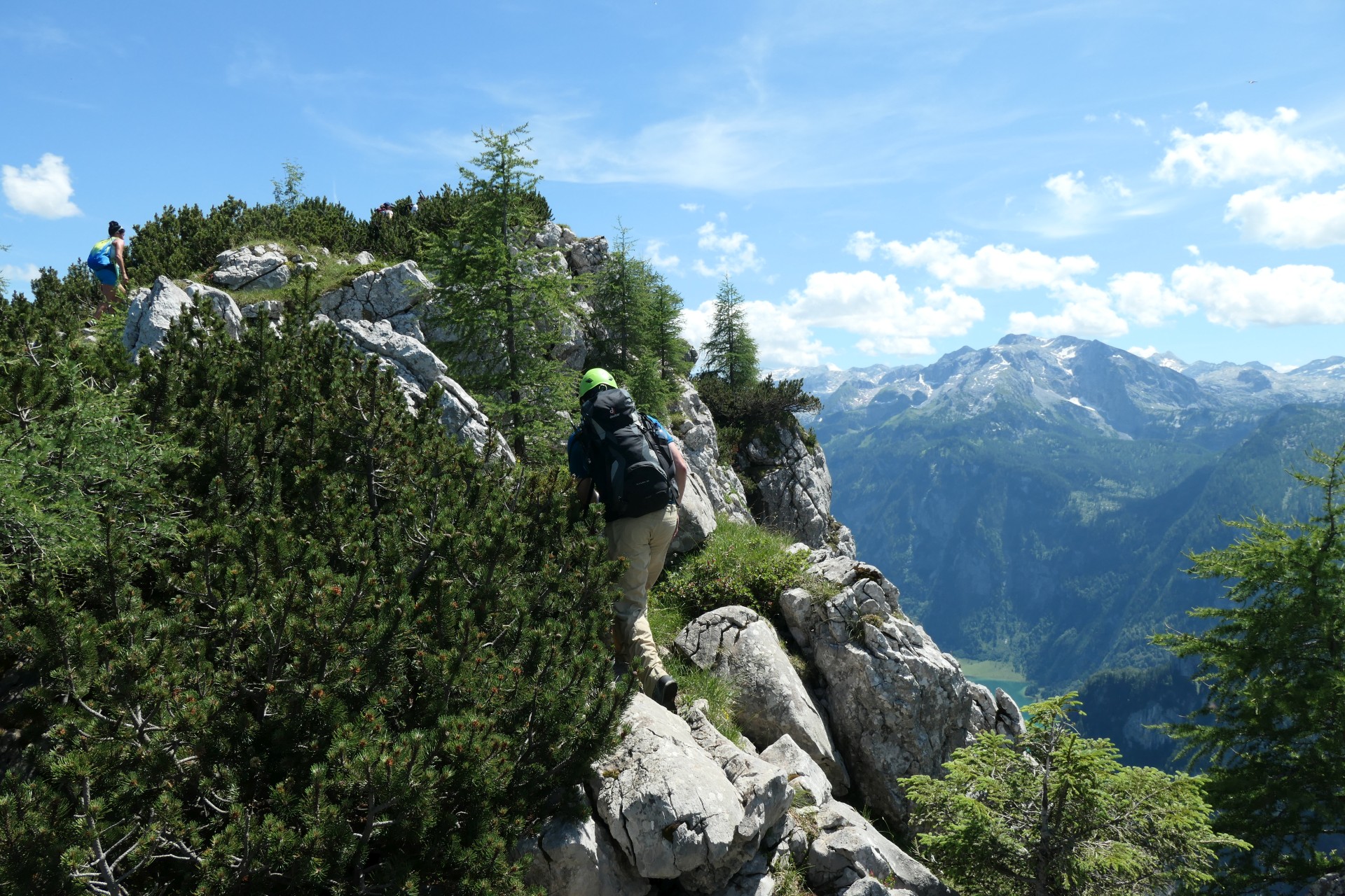 Abstieg über die steile Ostflanke mit zahlreichen Steinmännchen markiert und gut zu finden. Einige leichte Klettereien. Kurz vor dem Fensterl steile Graspassage. Bei Nässe sicher heikel. Nach dem Fensterl mit Tiefblick auf Königssee spannend bergab einigen Türmen ausweichend. Teils extrem rutschig und steil. Zuletzt schmal und eng hinauf zum Mooslahner.