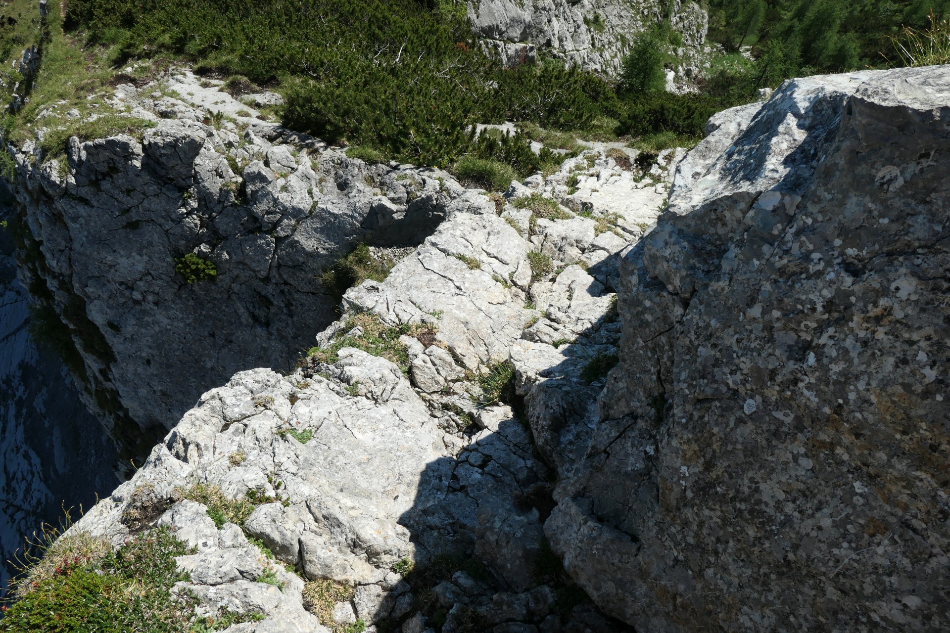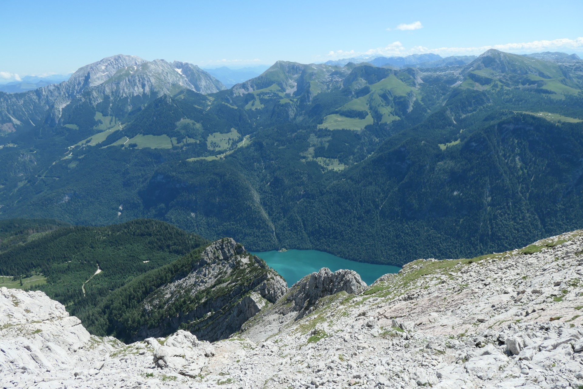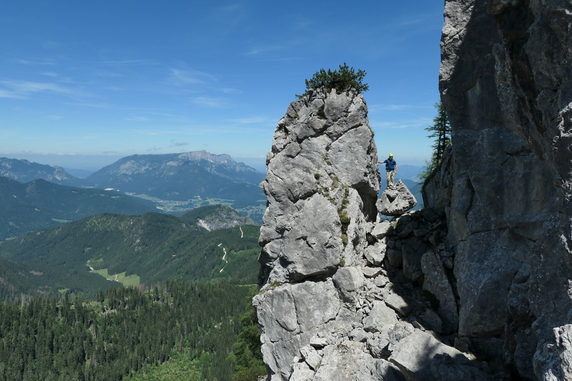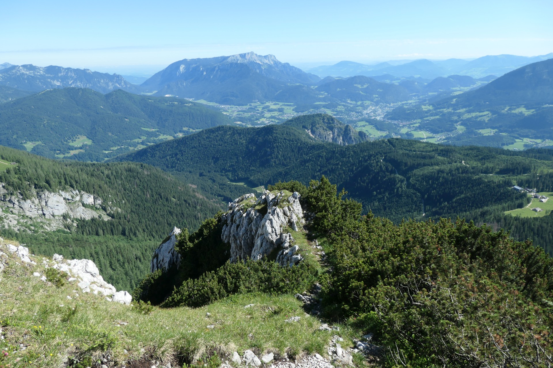 Abstieg über die steile Ostflanke mit zahlreichen Steinmännchen markiert und gut zu finden. Einige leichte Klettereien. Kurz vor dem Fensterl steile Graspassage. Bei Nässe sicher heikel. Nach dem Fensterl mit Tiefblick auf Königssee spannend bergab einigen Türmen ausweichend. Teils extrem rutschig und steil. Zuletzt schmal und eng hinauf zum Mooslahner.
