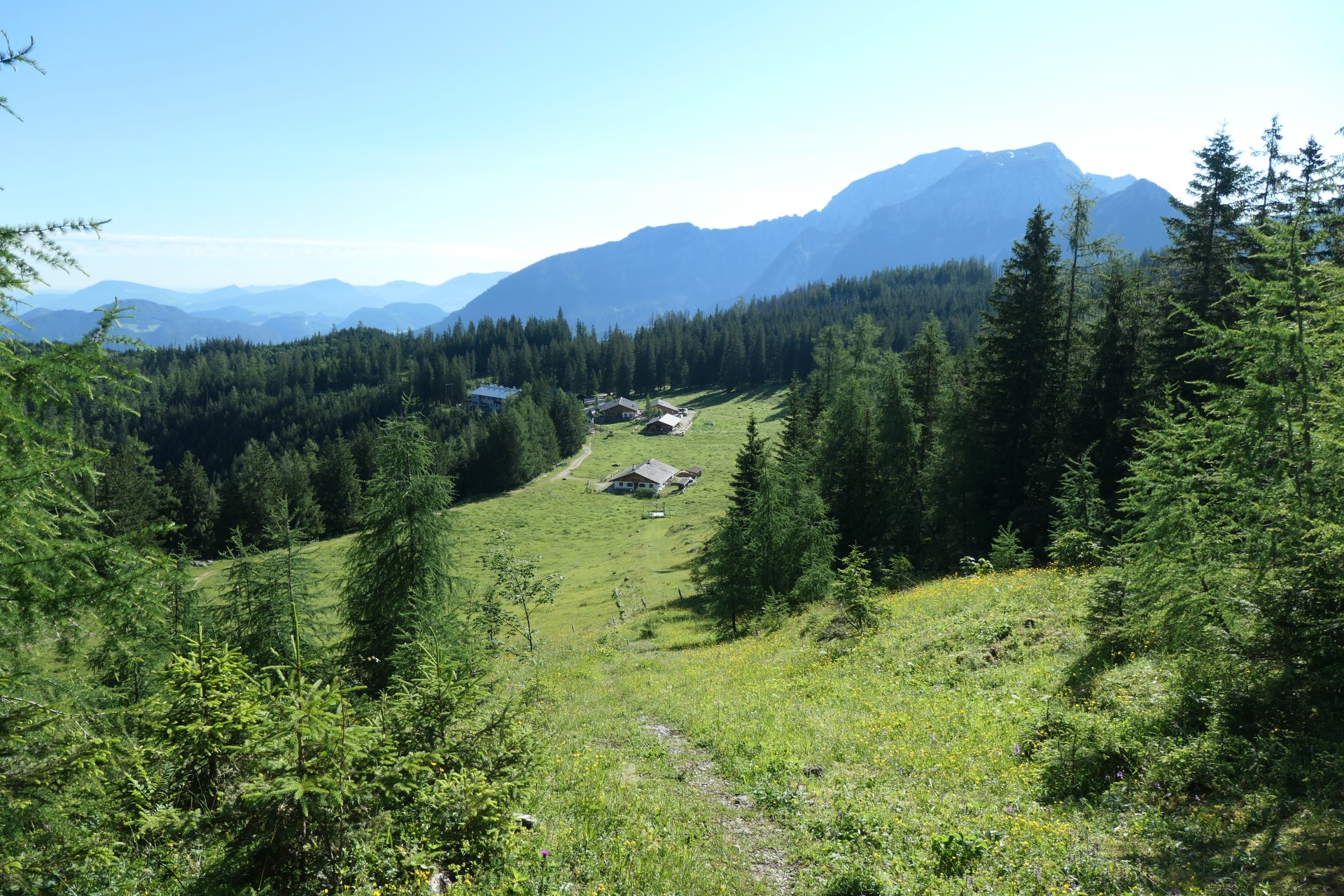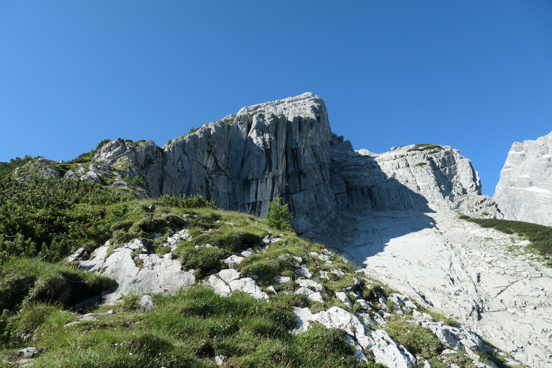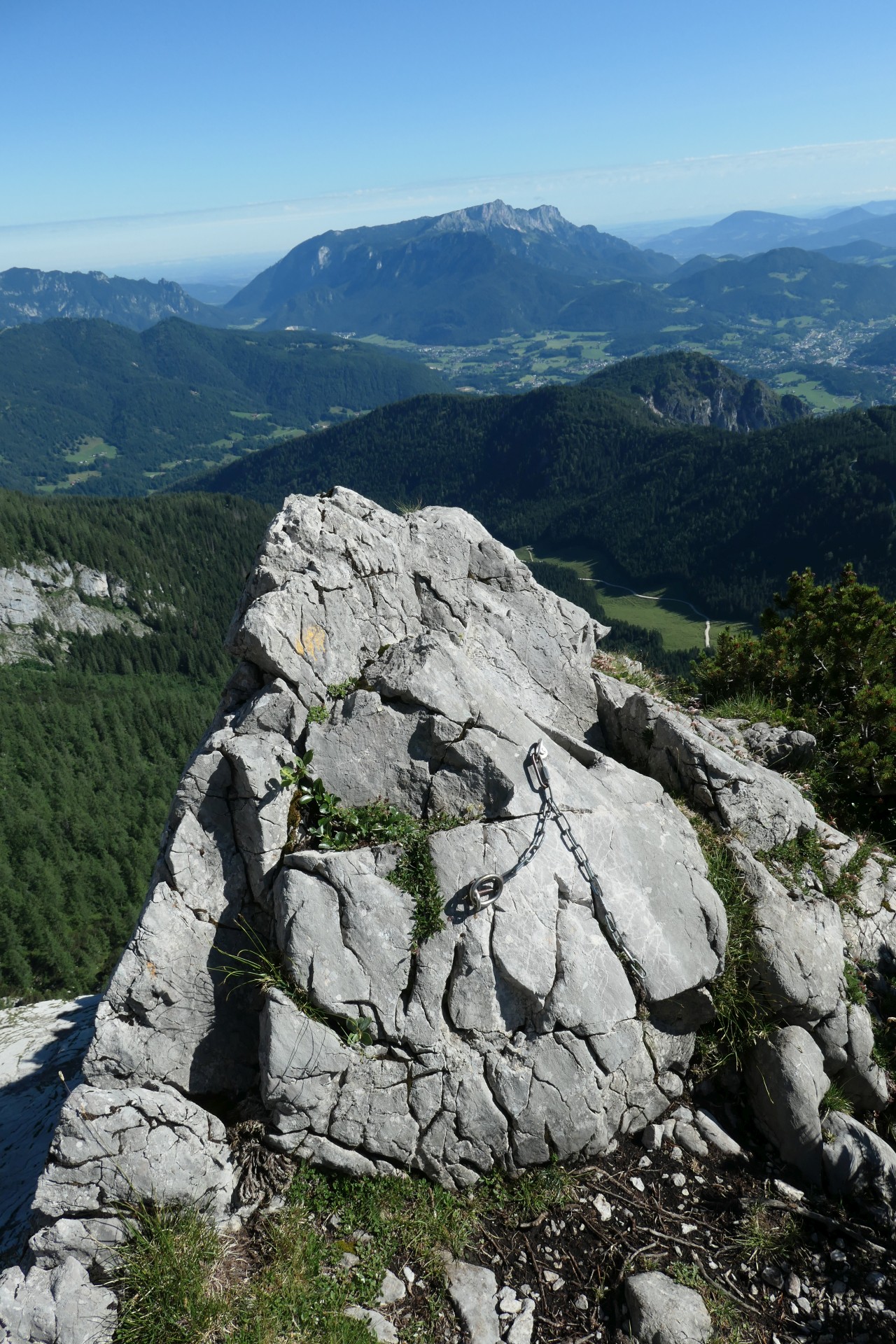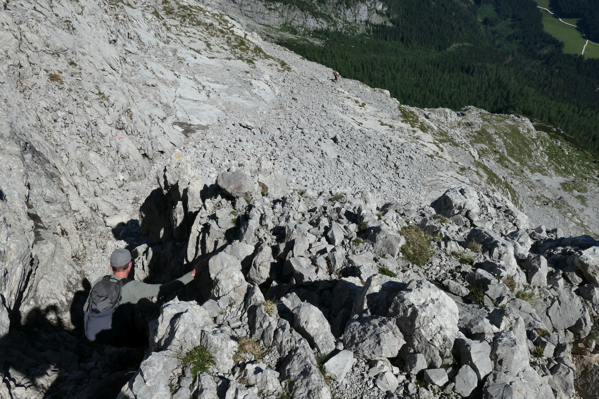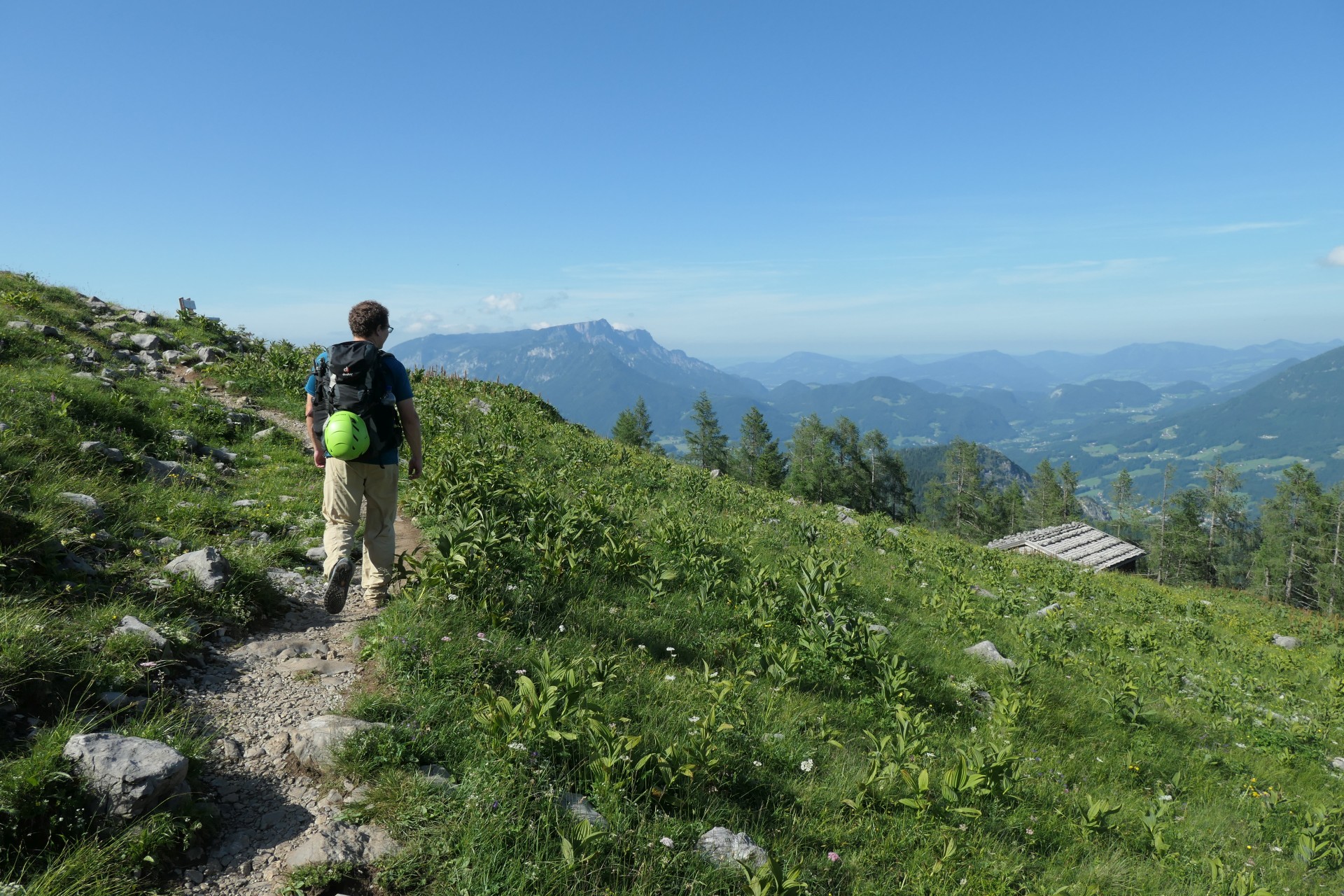 Abstieg über die steile Ostflanke mit zahlreichen Steinmännchen markiert und gut zu finden. Einige leichte Klettereien. Kurz vor dem Fensterl steile Graspassage. Bei Nässe sicher heikel. Nach dem Fensterl mit Tiefblick auf Königssee spannend bergab einigen Türmen ausweichend. Teils extrem rutschig und steil. Zuletzt schmal und eng hinauf zum Mooslahner.