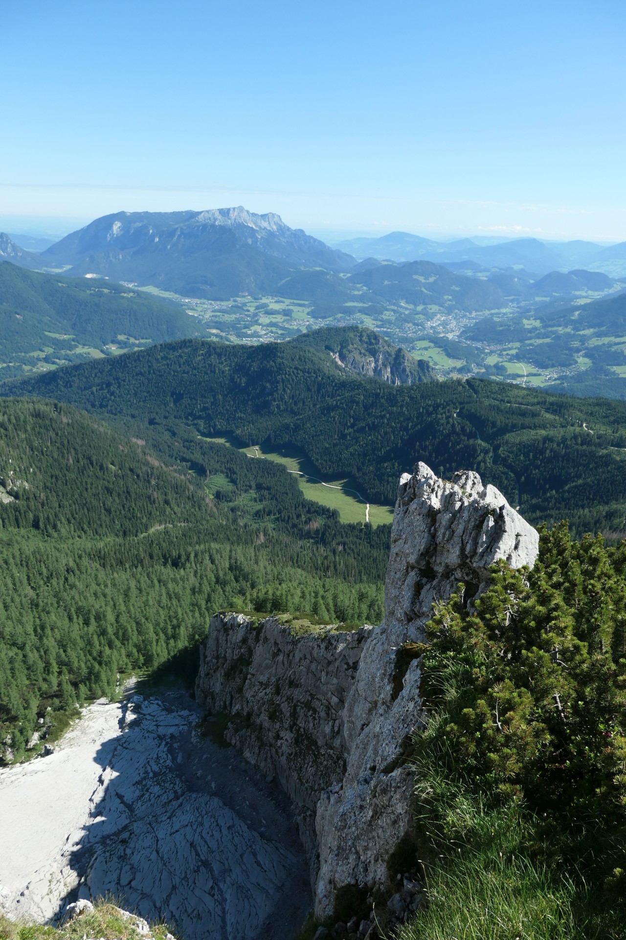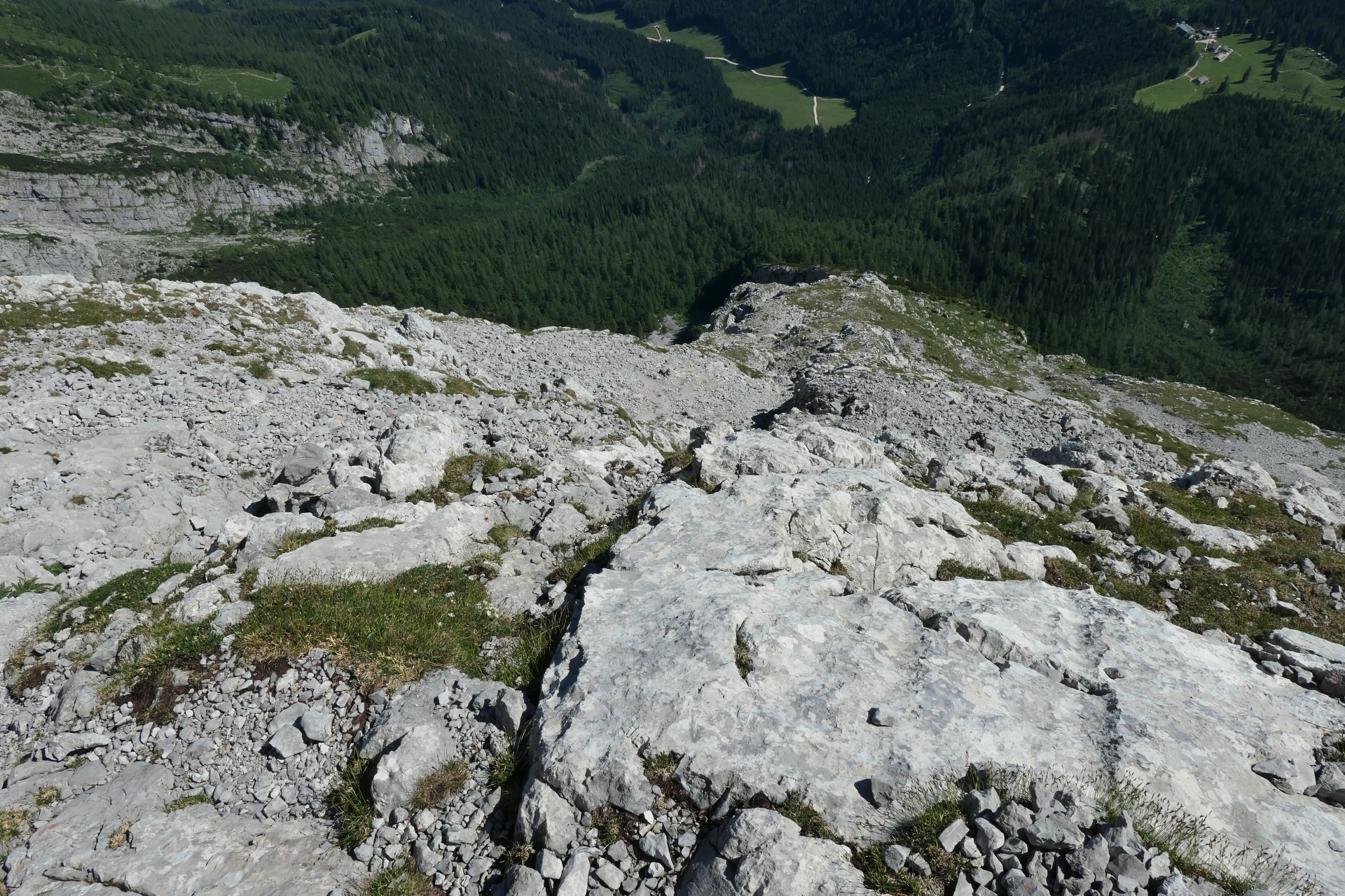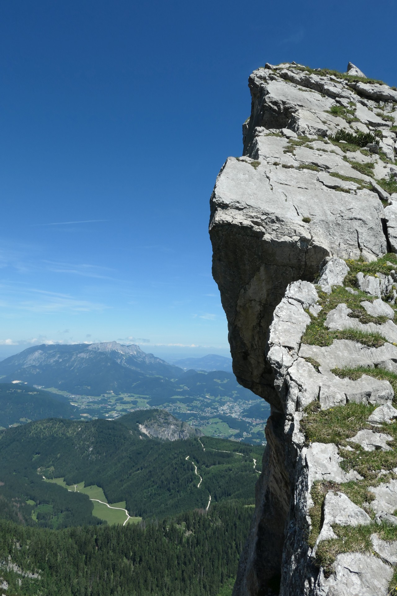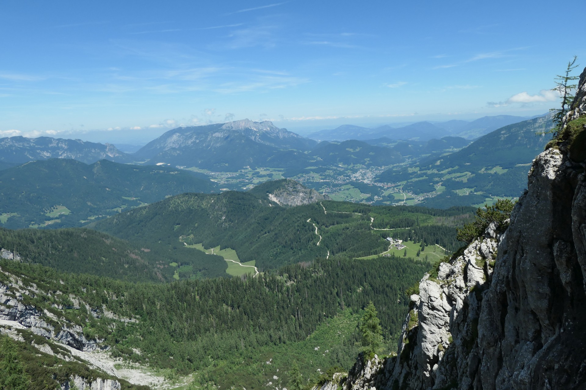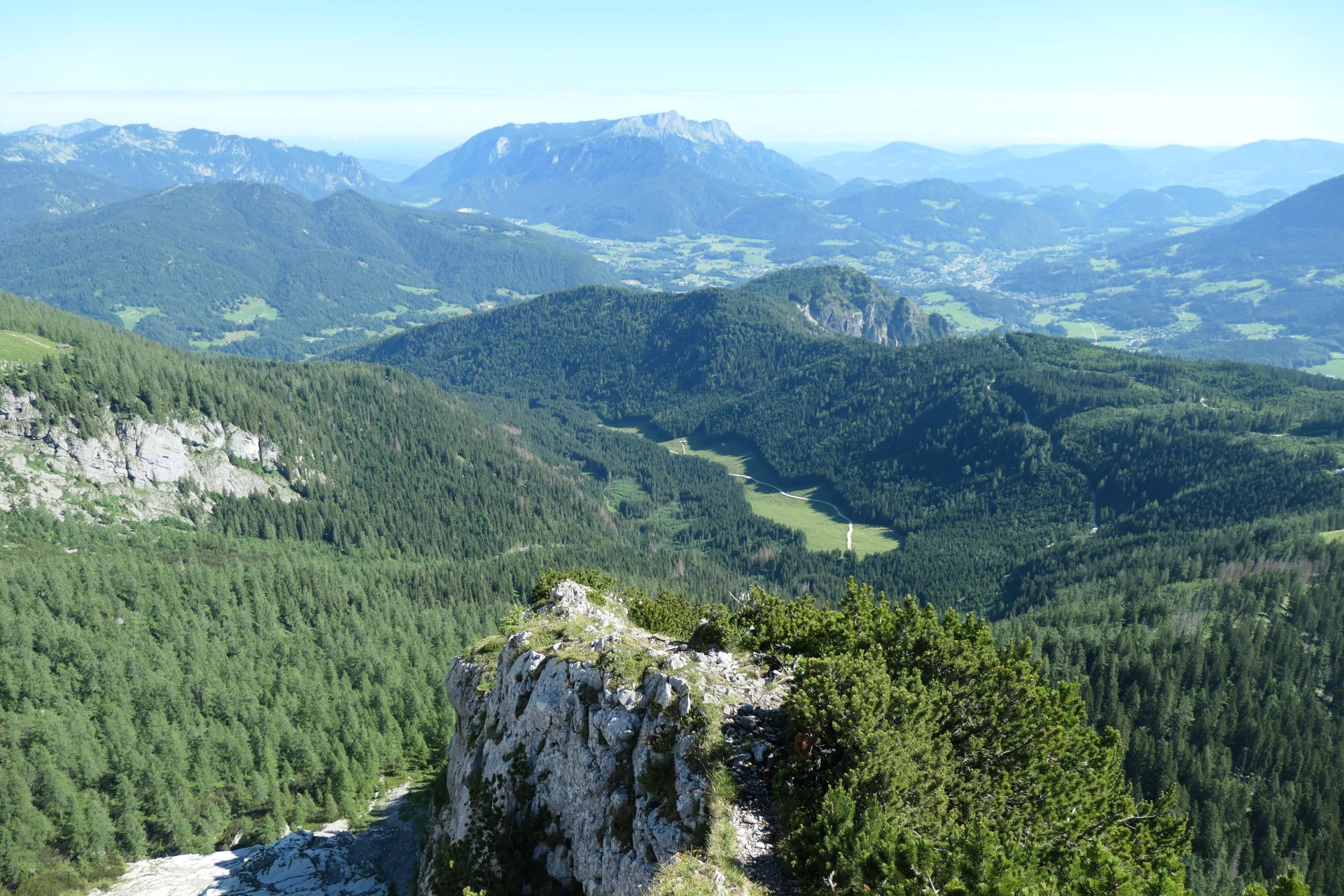 Abstieg über die steile Ostflanke mit zahlreichen Steinmännchen markiert und gut zu finden. Einige leichte Klettereien. Kurz vor dem Fensterl steile Graspassage. Bei Nässe sicher heikel. Nach dem Fensterl mit Tiefblick auf Königssee spannend bergab einigen Türmen ausweichend. Teils extrem rutschig und steil. Zuletzt schmal und eng hinauf zum Mooslahner.