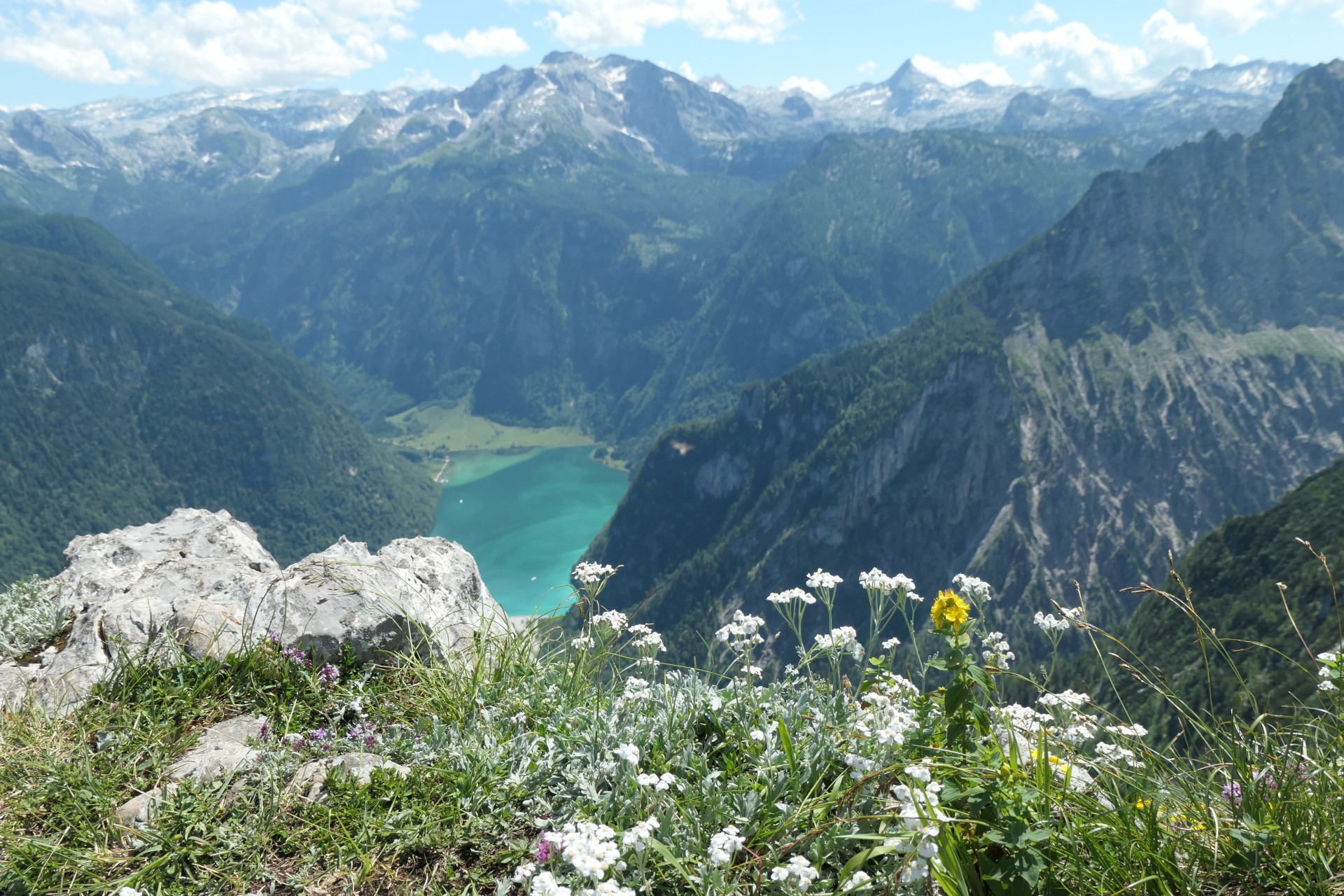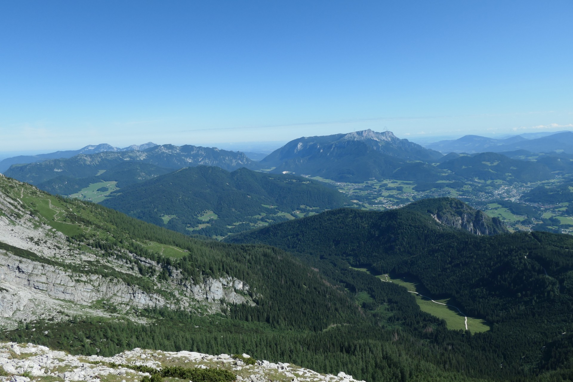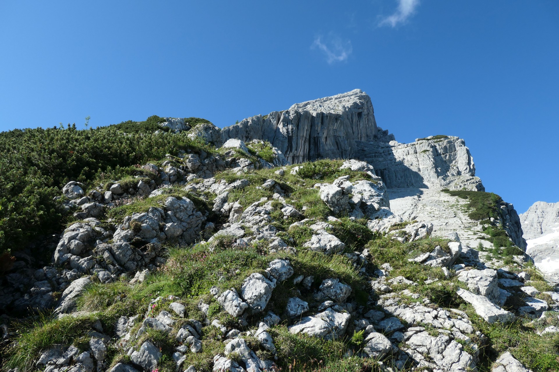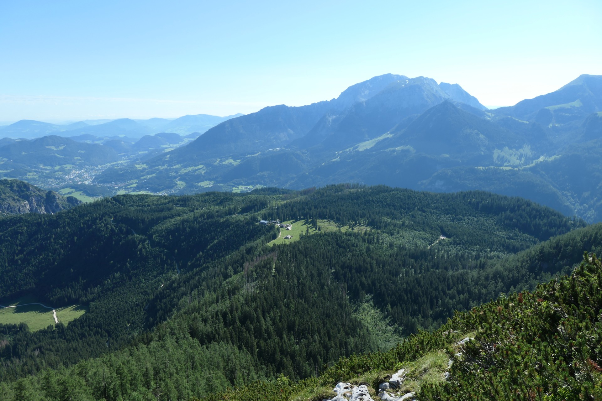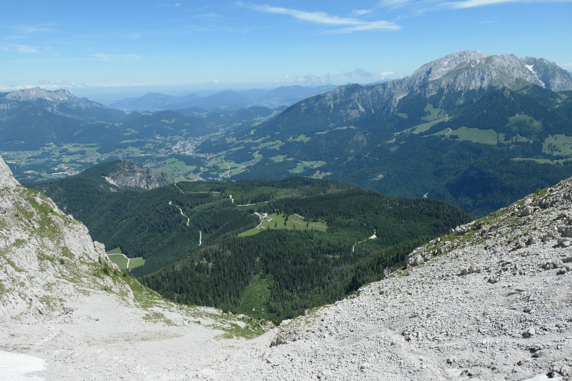 Abstieg über die steile Ostflanke mit zahlreichen Steinmännchen markiert und gut zu finden. Einige leichte Klettereien. Kurz vor dem Fensterl steile Graspassage. Bei Nässe sicher heikel. Nach dem Fensterl mit Tiefblick auf Königssee spannend bergab einigen Türmen ausweichend. Teils extrem rutschig und steil. Zuletzt schmal und eng hinauf zum Mooslahner.