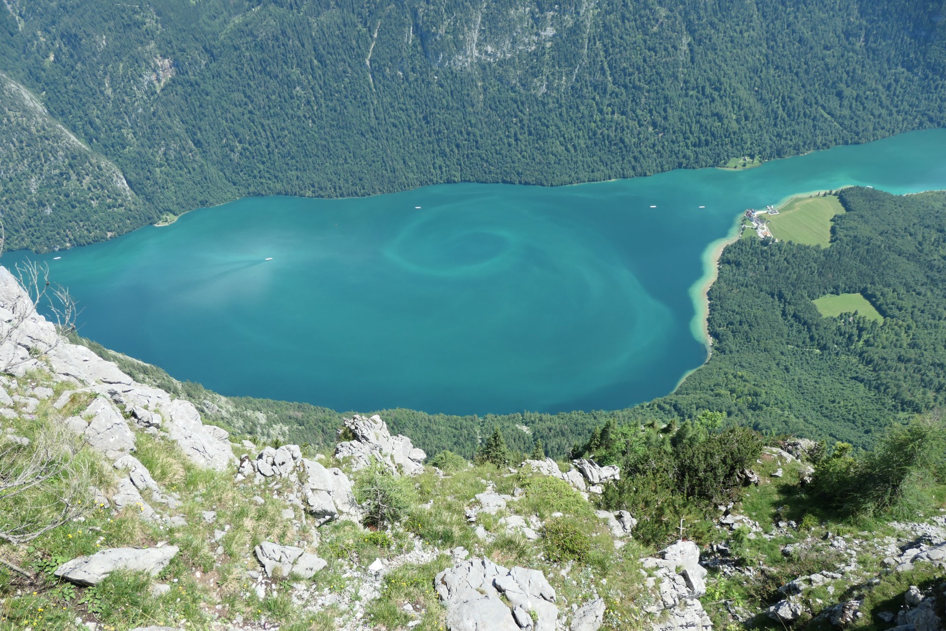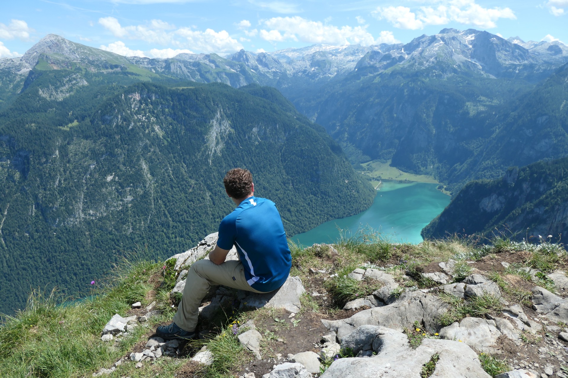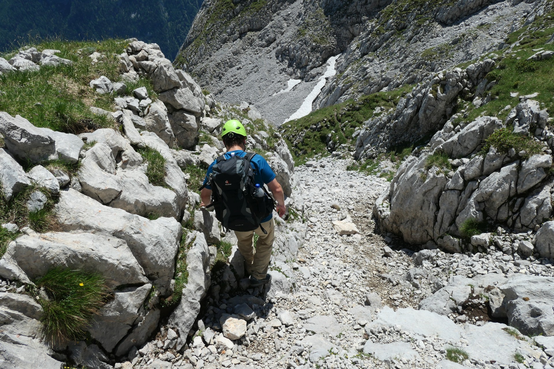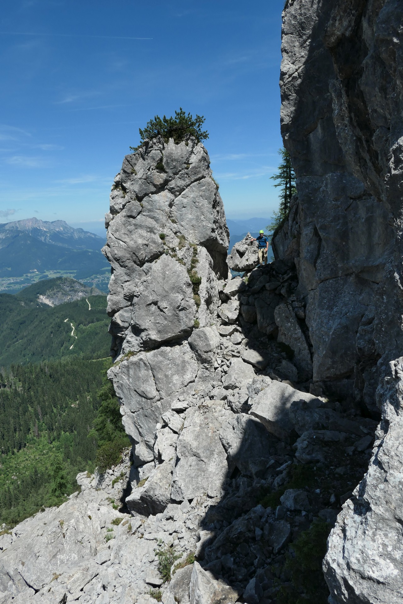 Abstieg über die steile Ostflanke mit zahlreichen Steinmännchen markiert und gut zu finden. Einige leichte Klettereien. Kurz vor dem Fensterl steile Graspassage. Bei Nässe sicher heikel. Nach dem Fensterl mit Tiefblick auf Königssee spannend bergab einigen Türmen ausweichend. Teils extrem rutschig und steil. Zuletzt schmal und eng hinauf zum Mooslahner.