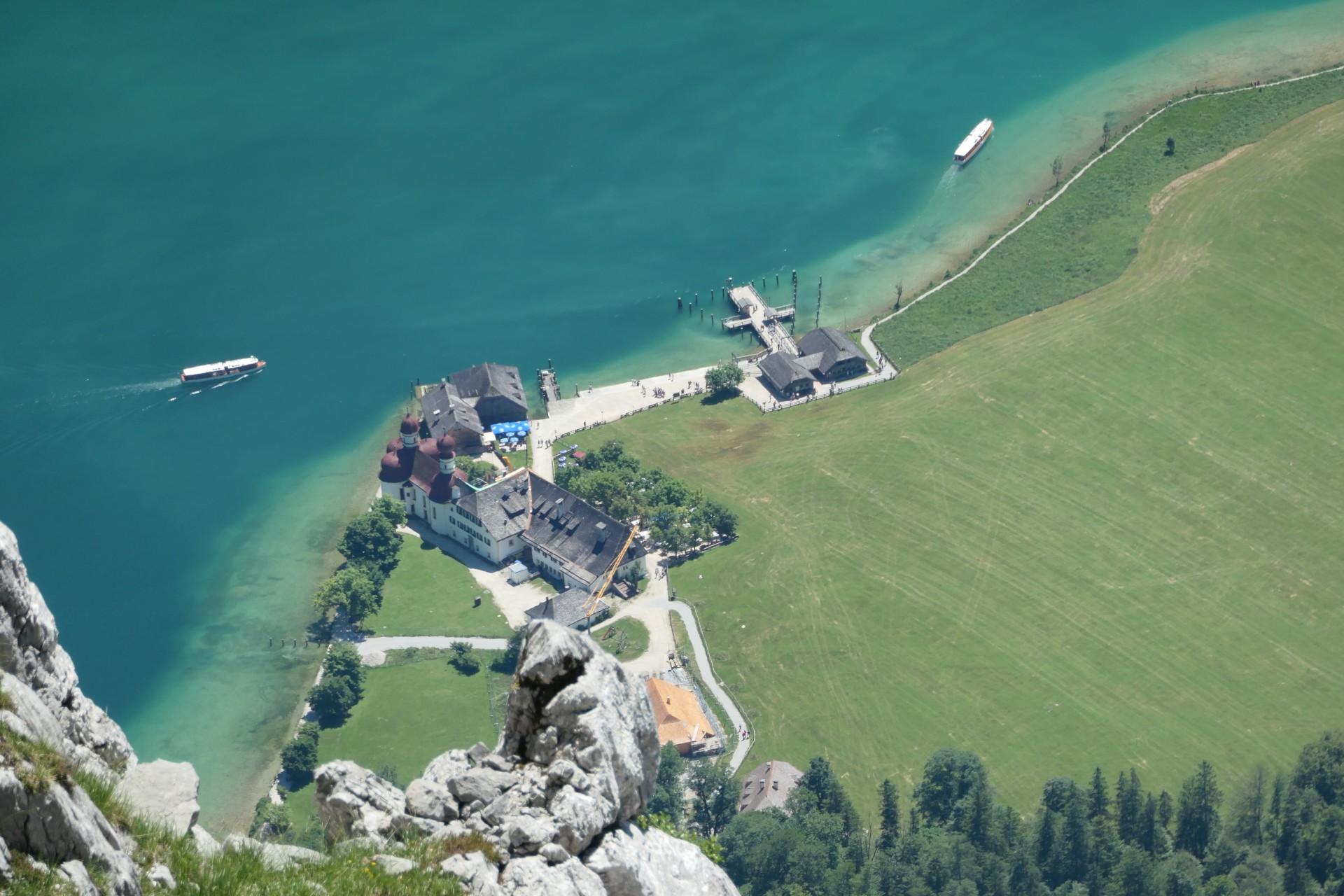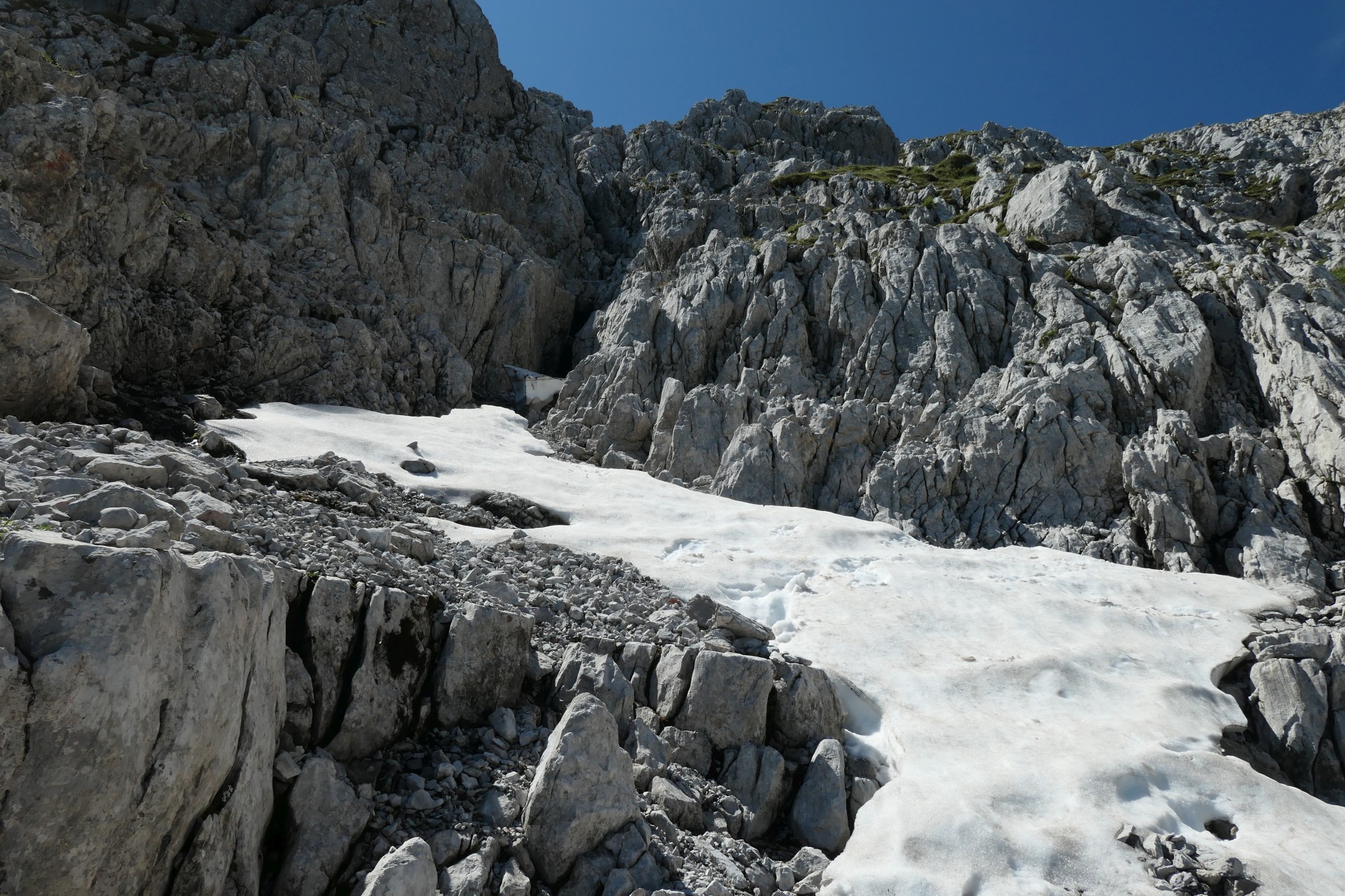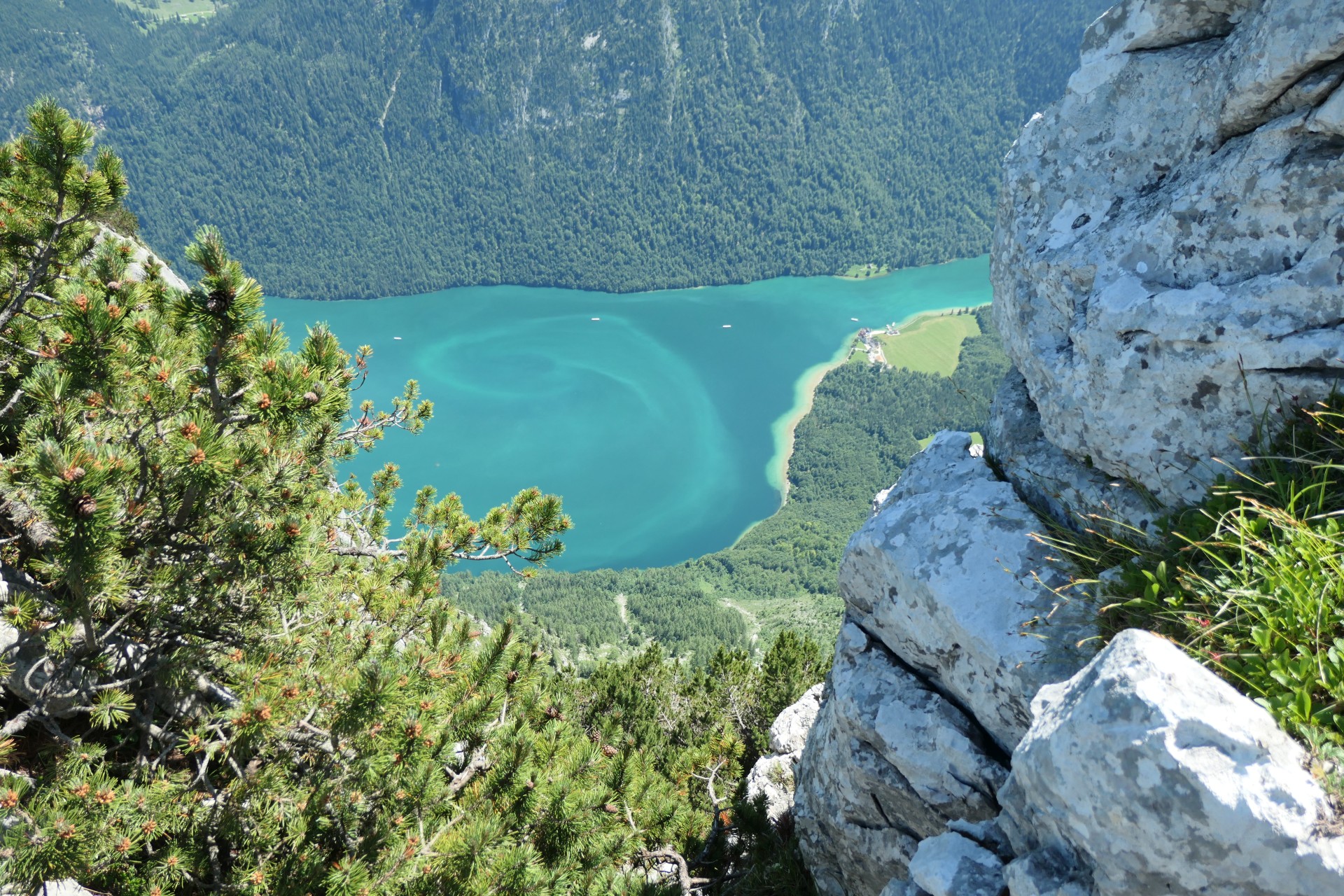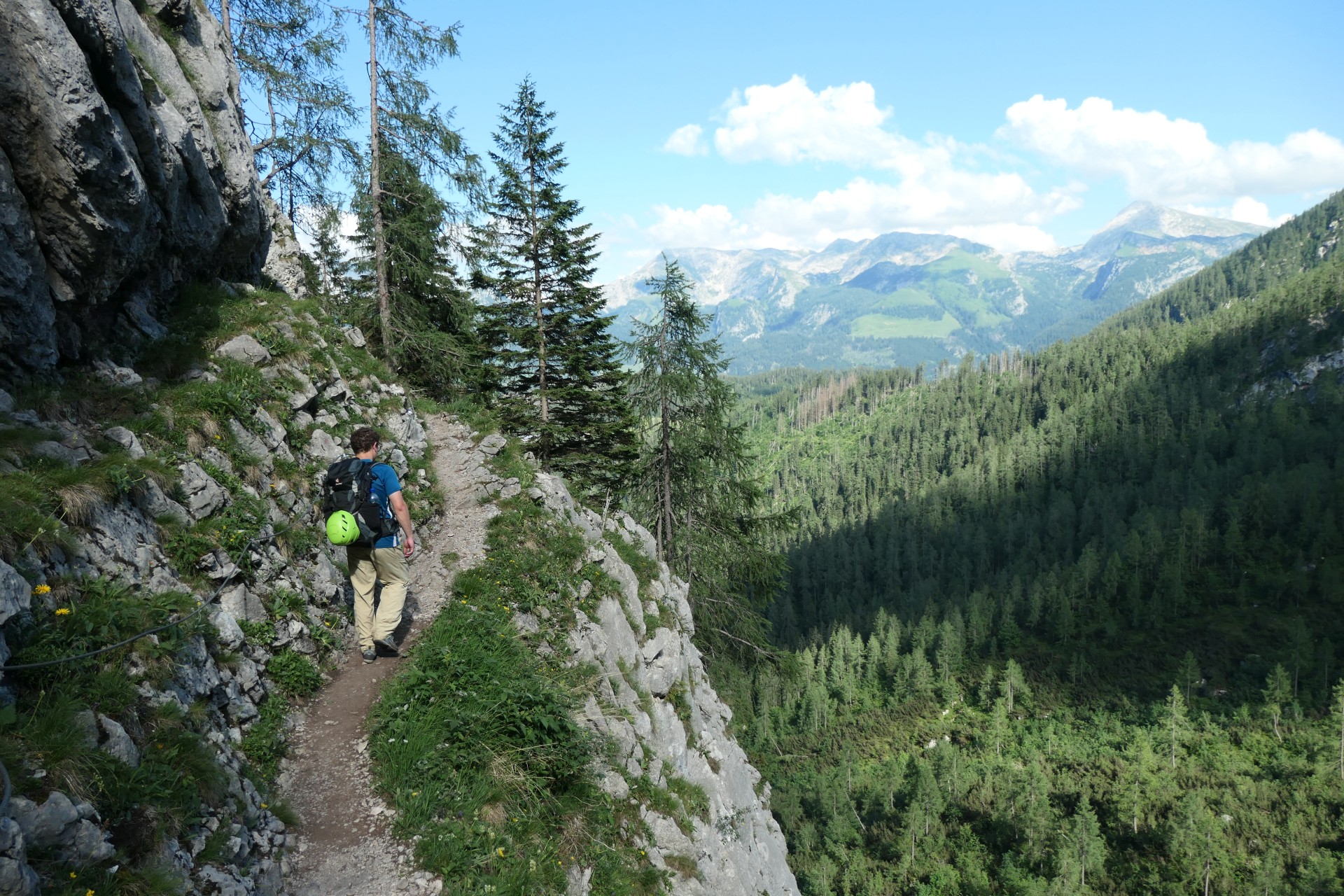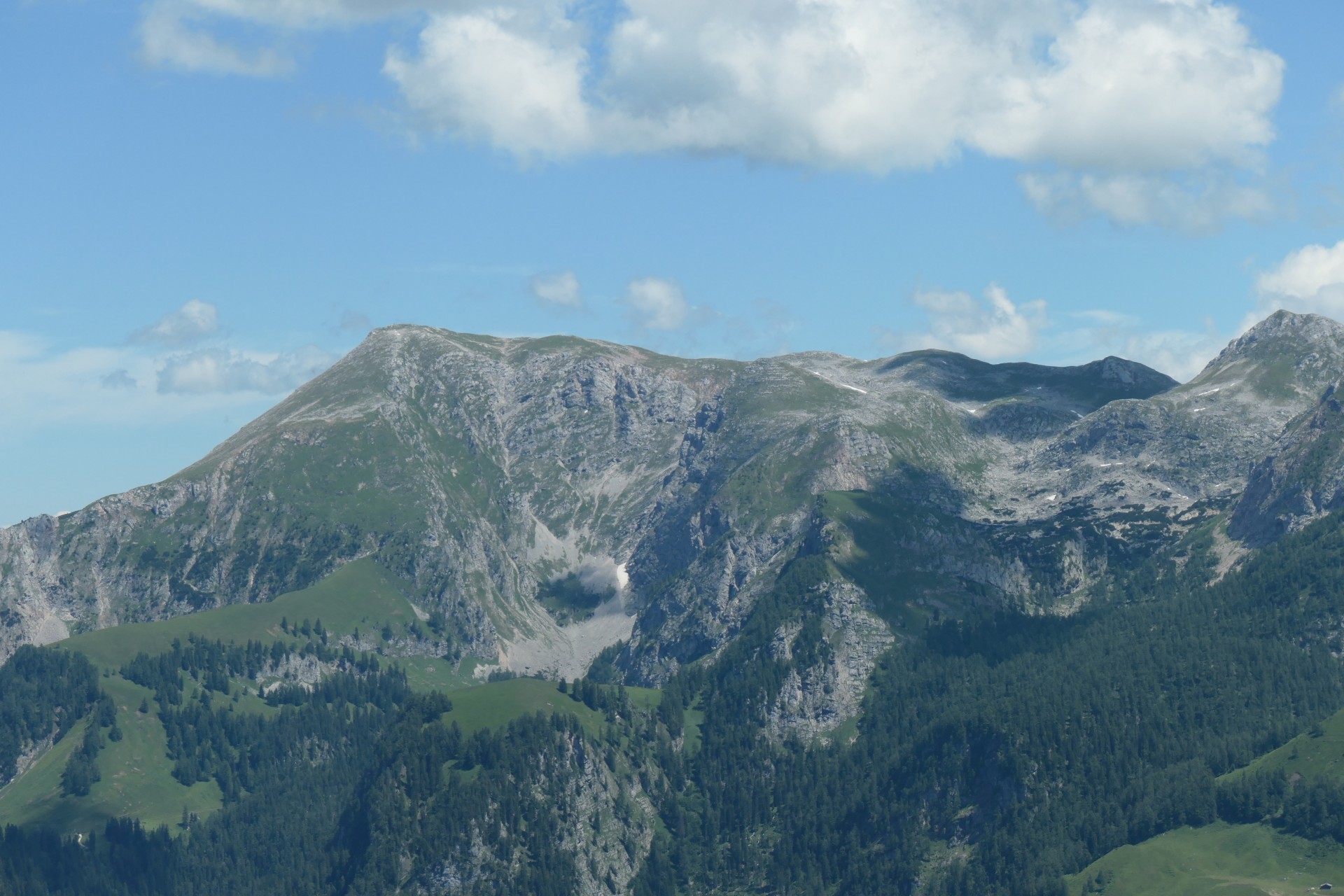 Abstieg über die steile Ostflanke mit zahlreichen Steinmännchen markiert und gut zu finden. Einige leichte Klettereien. Kurz vor dem Fensterl steile Graspassage. Bei Nässe sicher heikel. Nach dem Fensterl mit Tiefblick auf Königssee spannend bergab einigen Türmen ausweichend. Teils extrem rutschig und steil. Zuletzt schmal und eng hinauf zum Mooslahner.