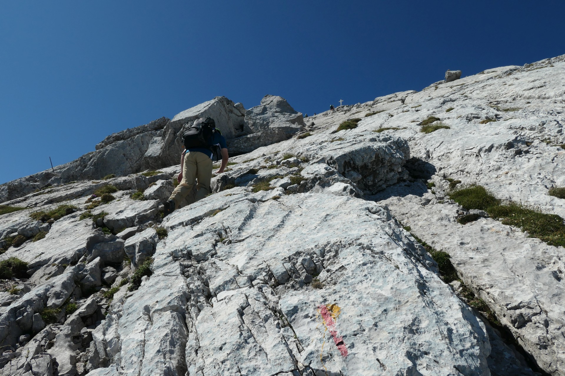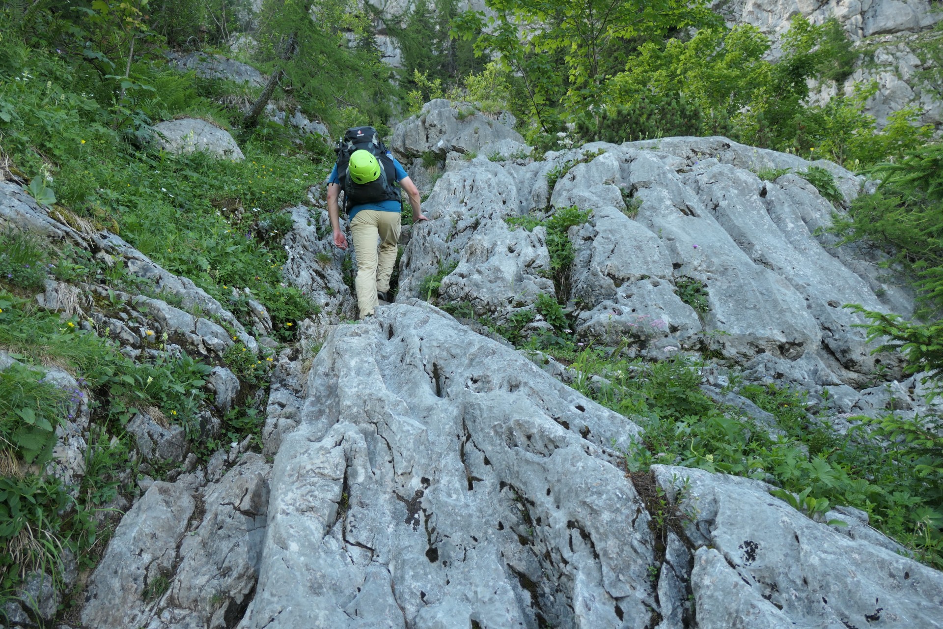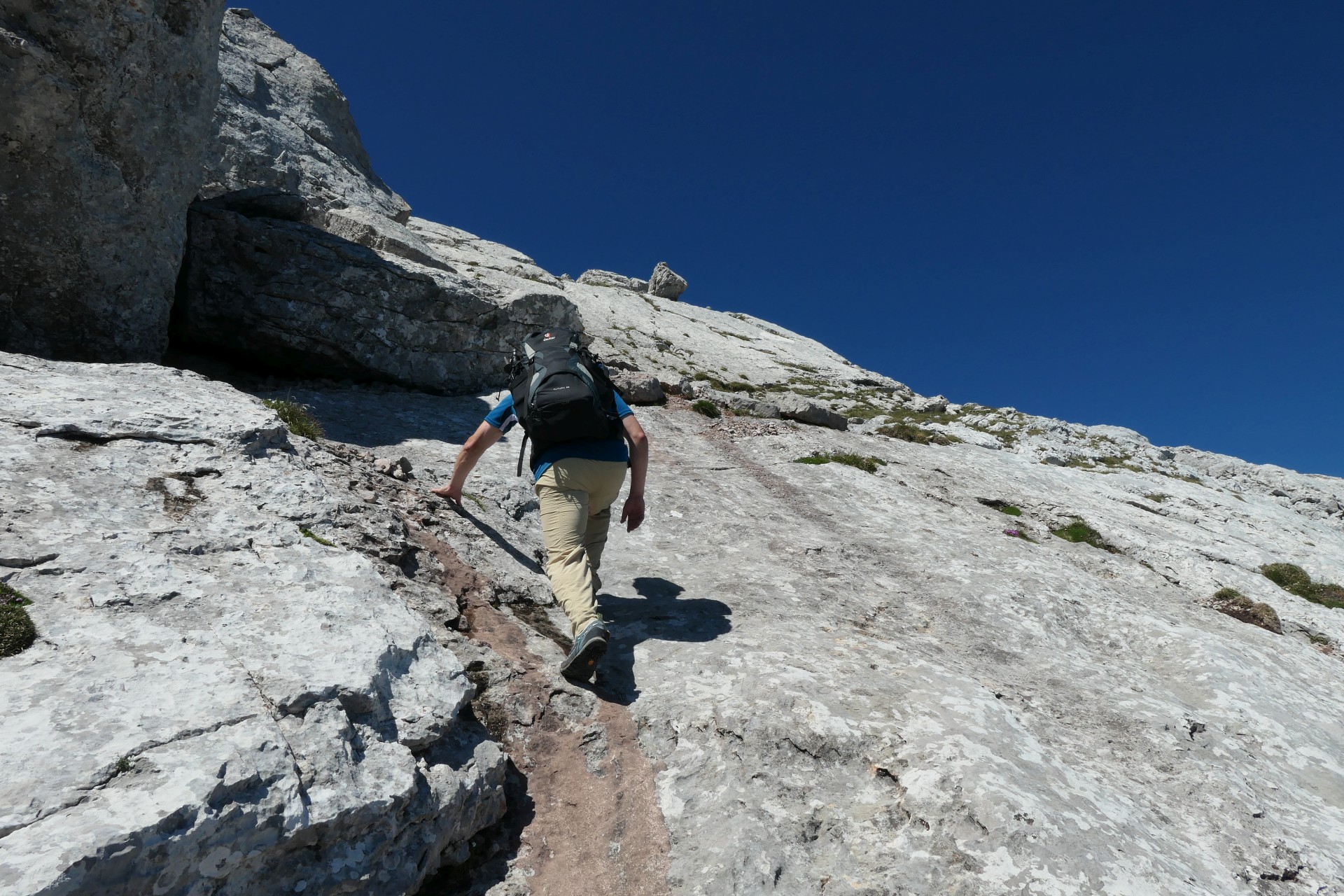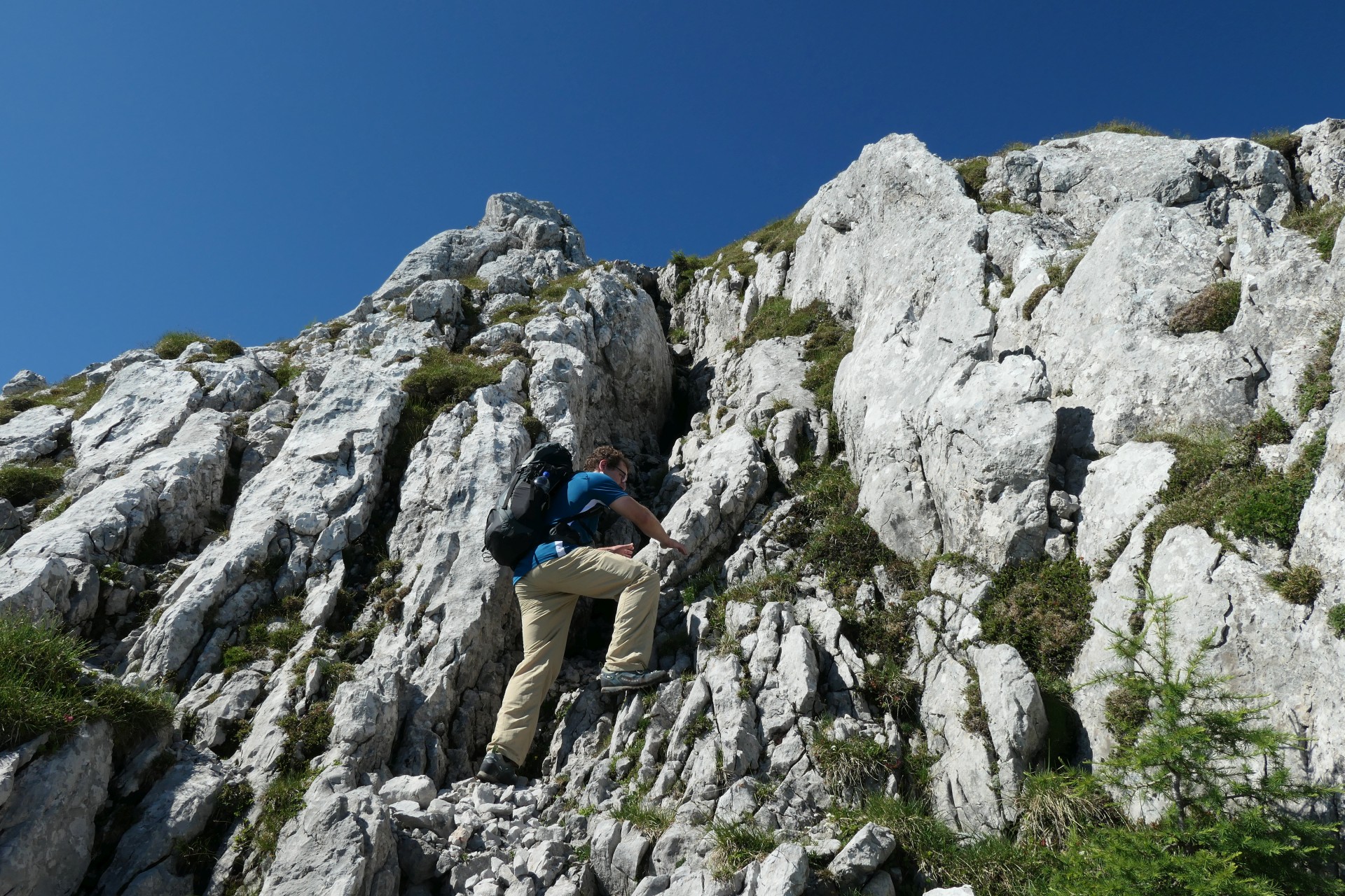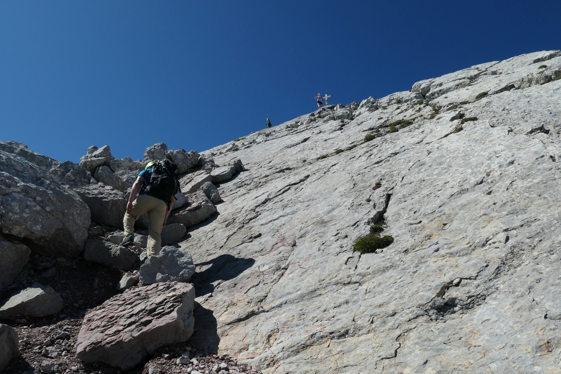 Im Wald anfangs flach dann immer steiler werdend bis zum Gendarm. Hier kurze ausgesetzte 2er Kletterei mit Bohrhaken. Danach am Nordgrat entlang und später in der Flanke steil empor. Immer wieder einfach Kletterei. Trotz zahlreicher Markierungen Wegfindung nicht ganz einfach. Zuletzt über Platten zum Gipfelkreuz.