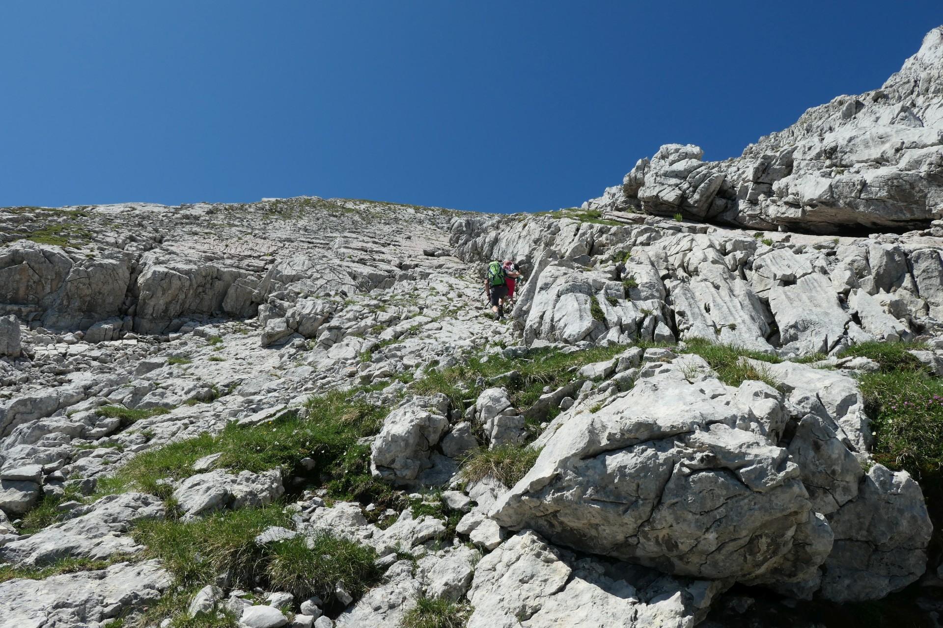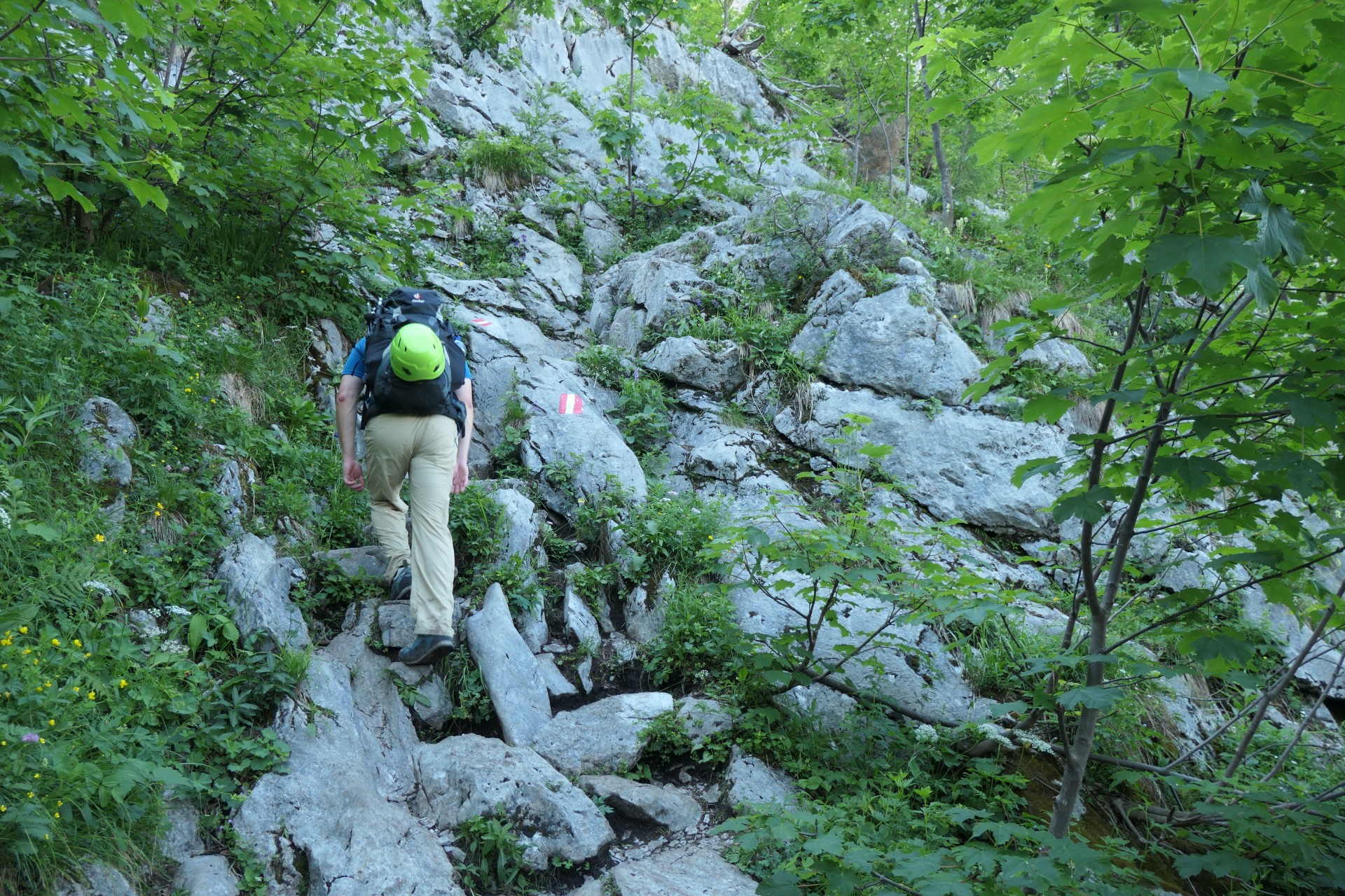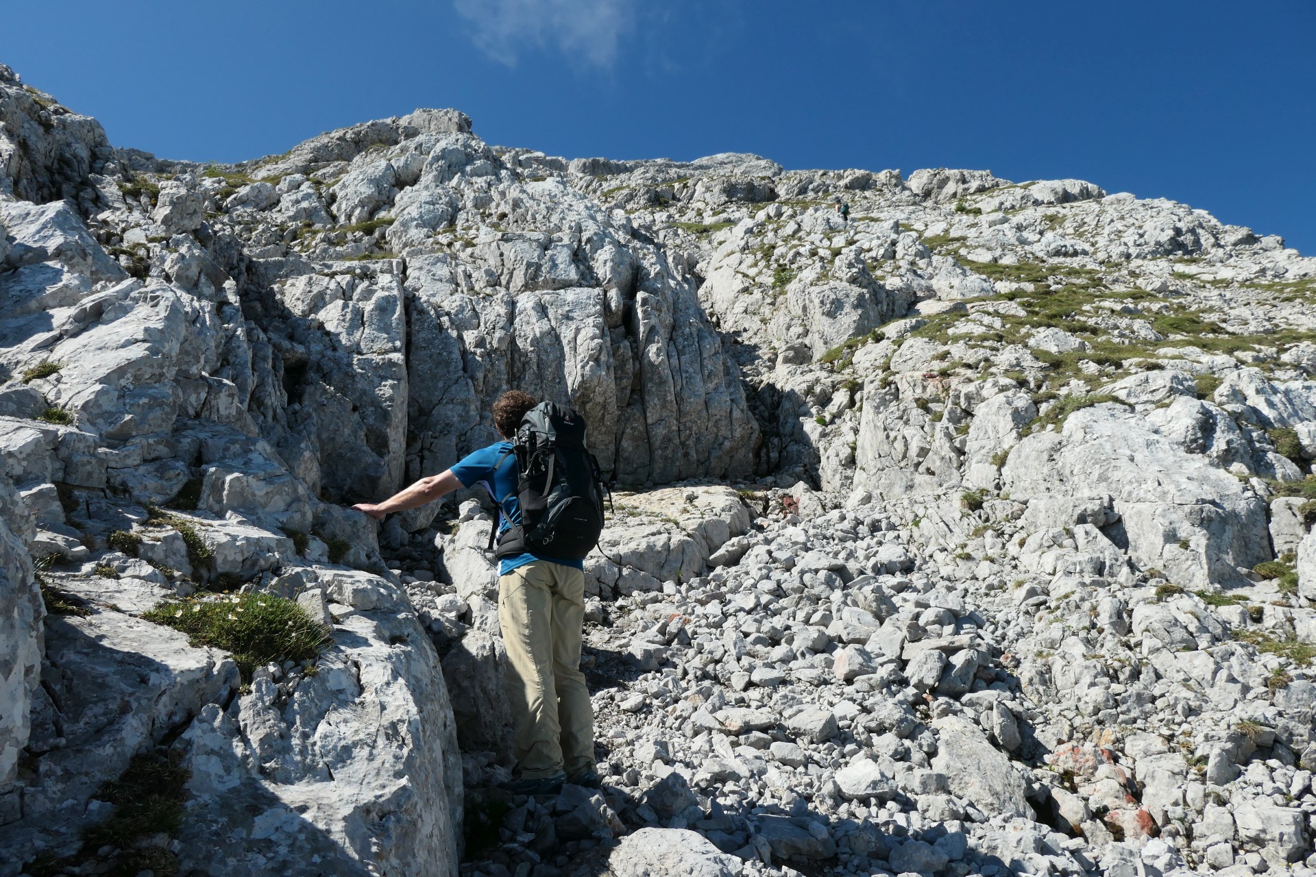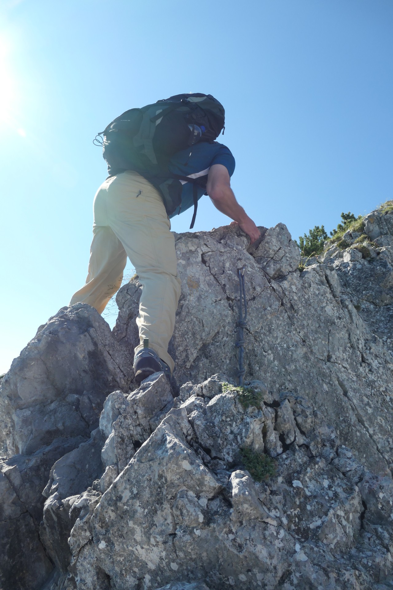 Im Wald anfangs flach dann immer steiler werdend bis zum Gendarm. Hier kurze ausgesetzte 2er Kletterei mit Bohrhaken. Danach am Nordgrat entlang und später in der Flanke steil empor. Immer wieder einfach Kletterei. Trotz zahlreicher Markierungen Wegfindung nicht ganz einfach. Zuletzt über Platten zum Gipfelkreuz.